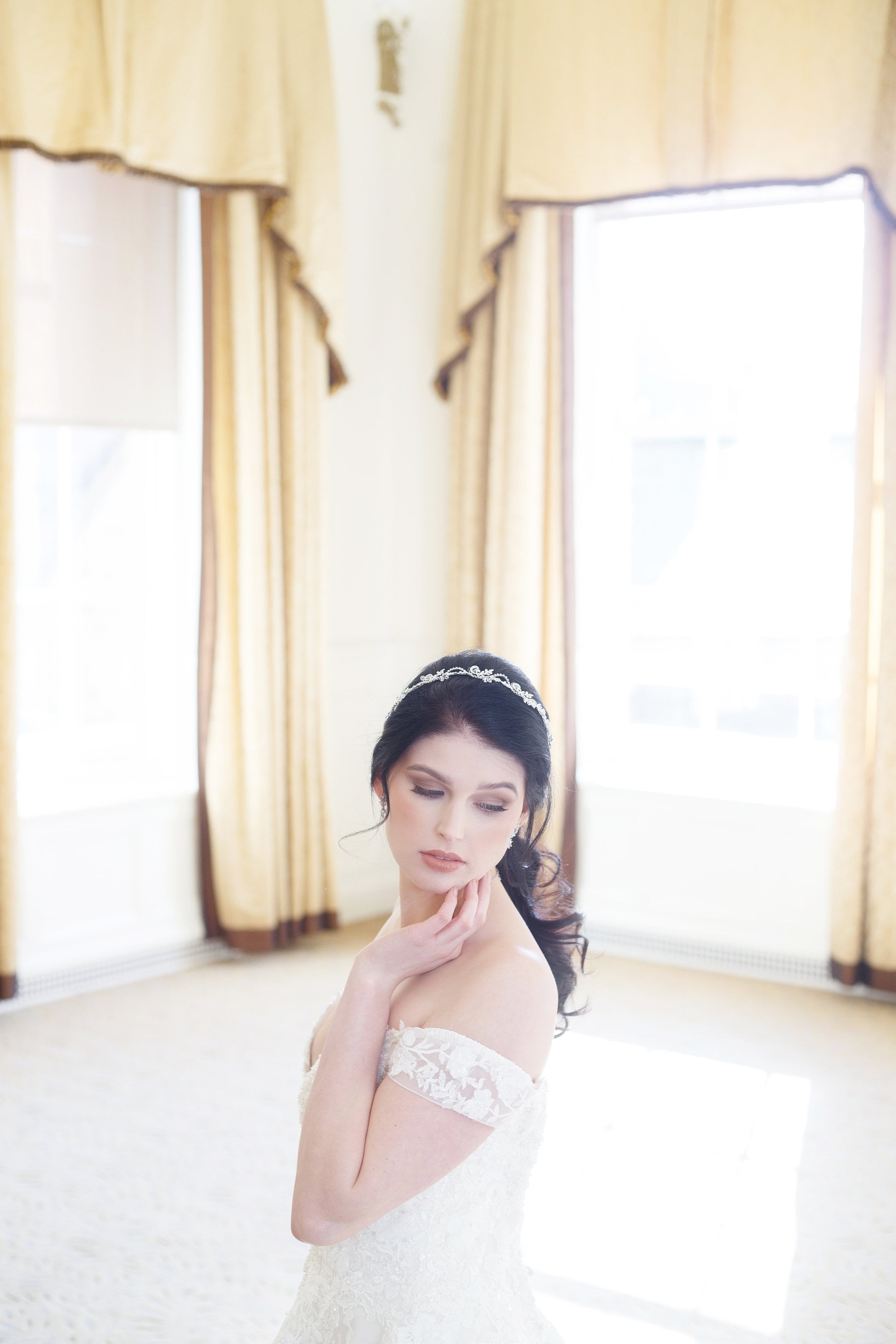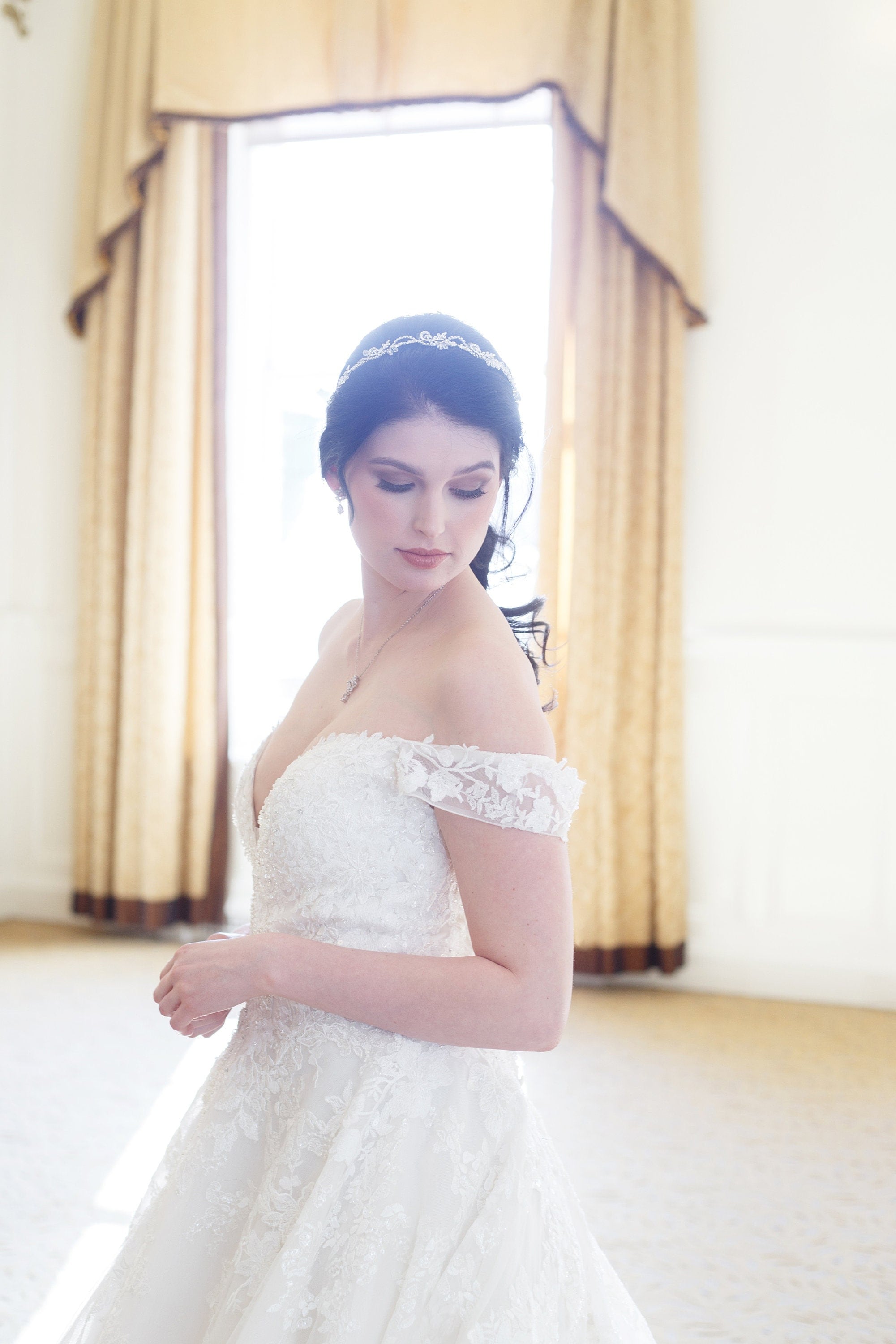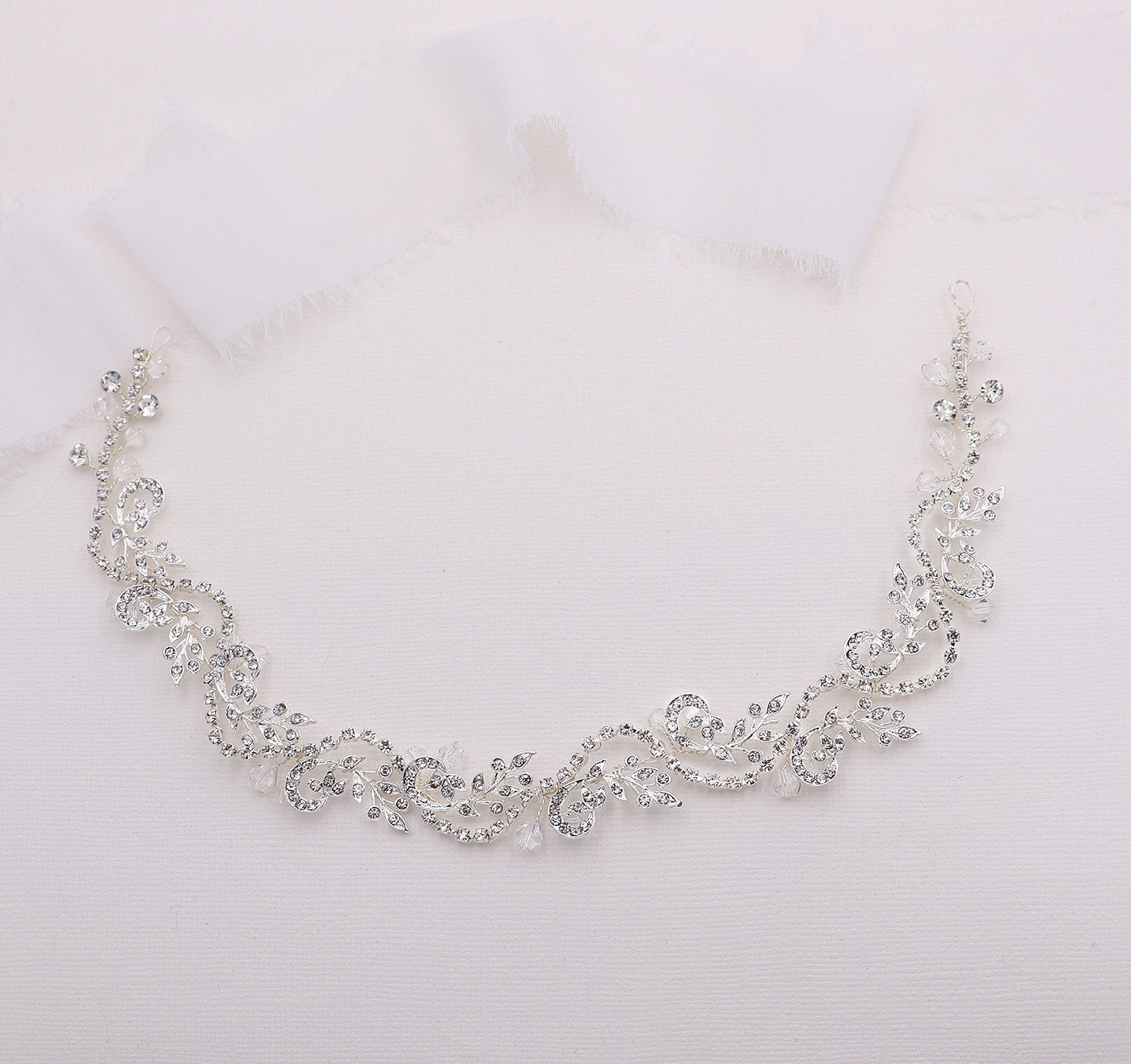 This immaculate wedding headpiece is hand-wired with accents of brilliant faceted rhinestones and crystals. This piece is flexible so it can be manipulated to suit your personal hairstyle. Can be worn as a headband or above a low chignon. Design portion measures 11 1/2" long and 1" at the widest point. The possibilities are endless with this incredible wedding headpiece! Choose from no ribbon or with ivory ribbon.