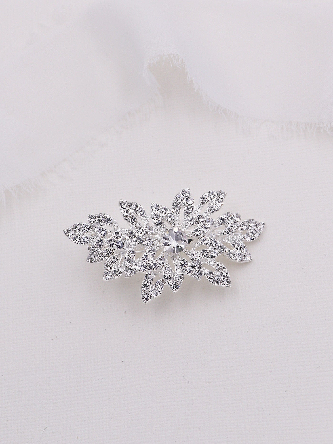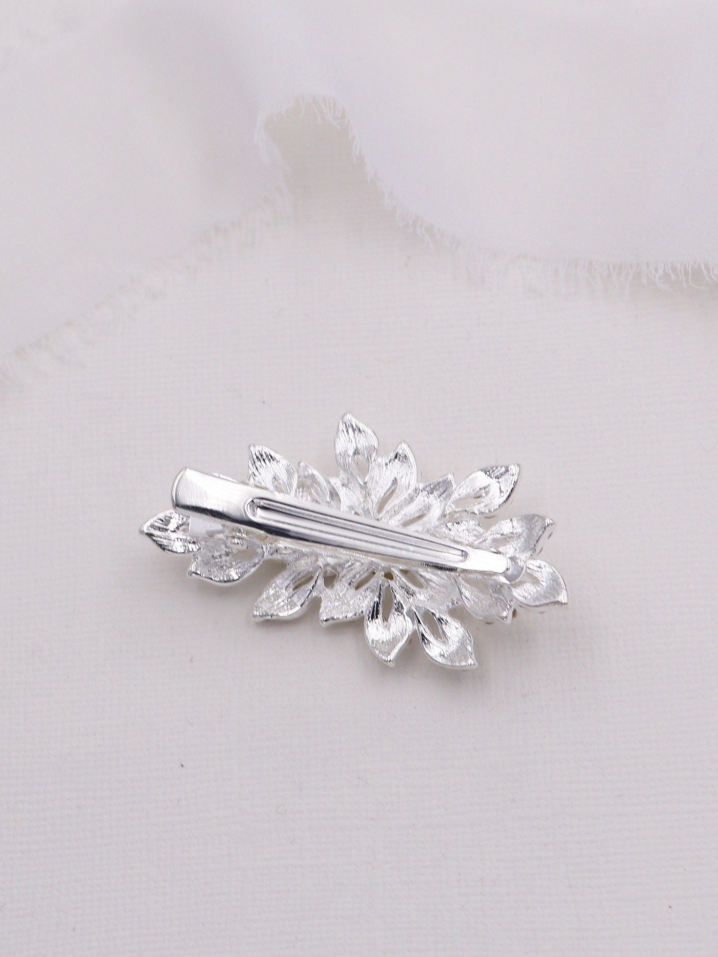 This sparkling wedding hair clip features brilliant rhinestone crystals in an elegant design that is the perfect accessory for the bride or any special occasion event. This piece is perfect as a side or accent hair accessory. Measures a petite size at 2" wide and 1" tall. Back has an alligator style clip with teeth" for easy placement.