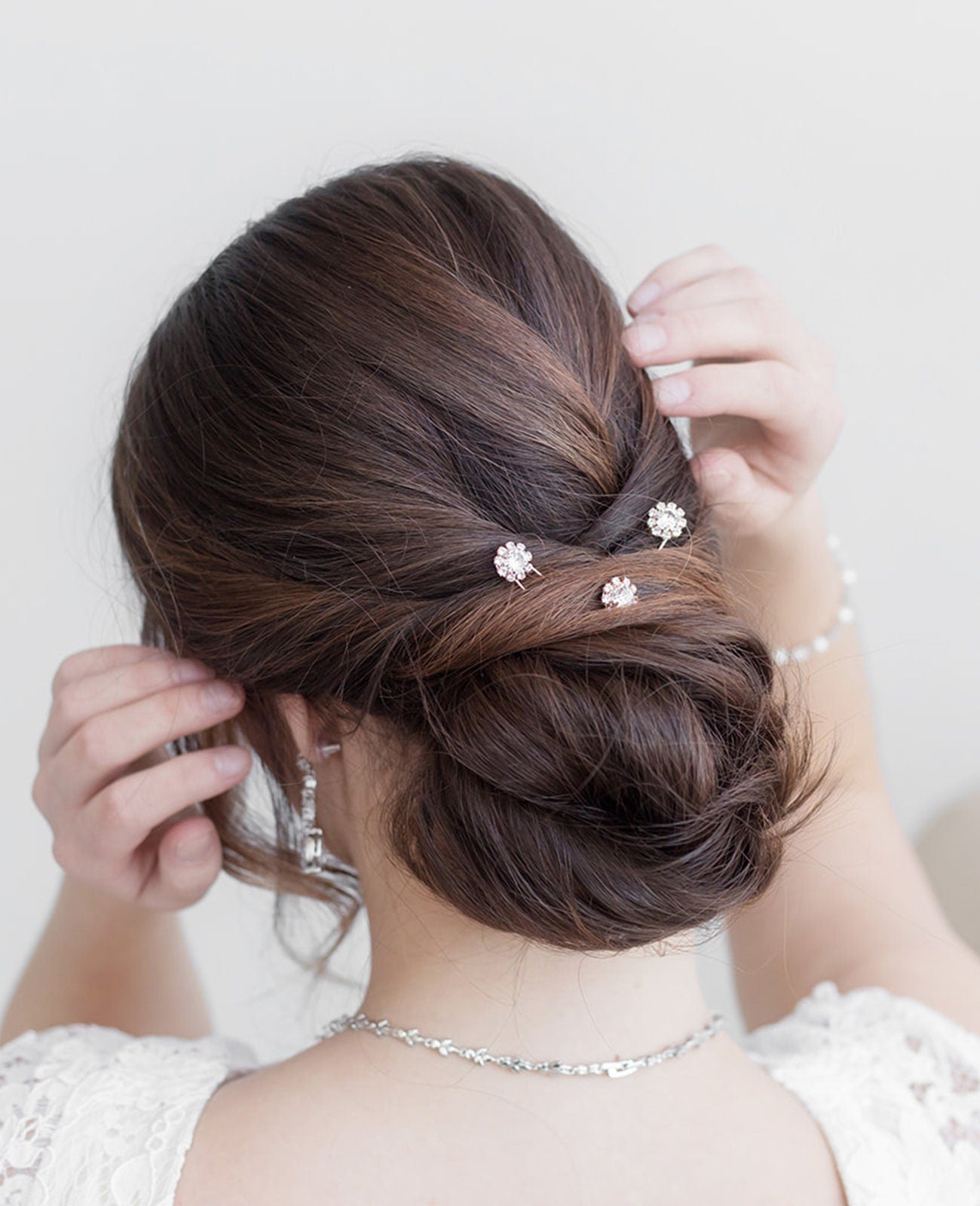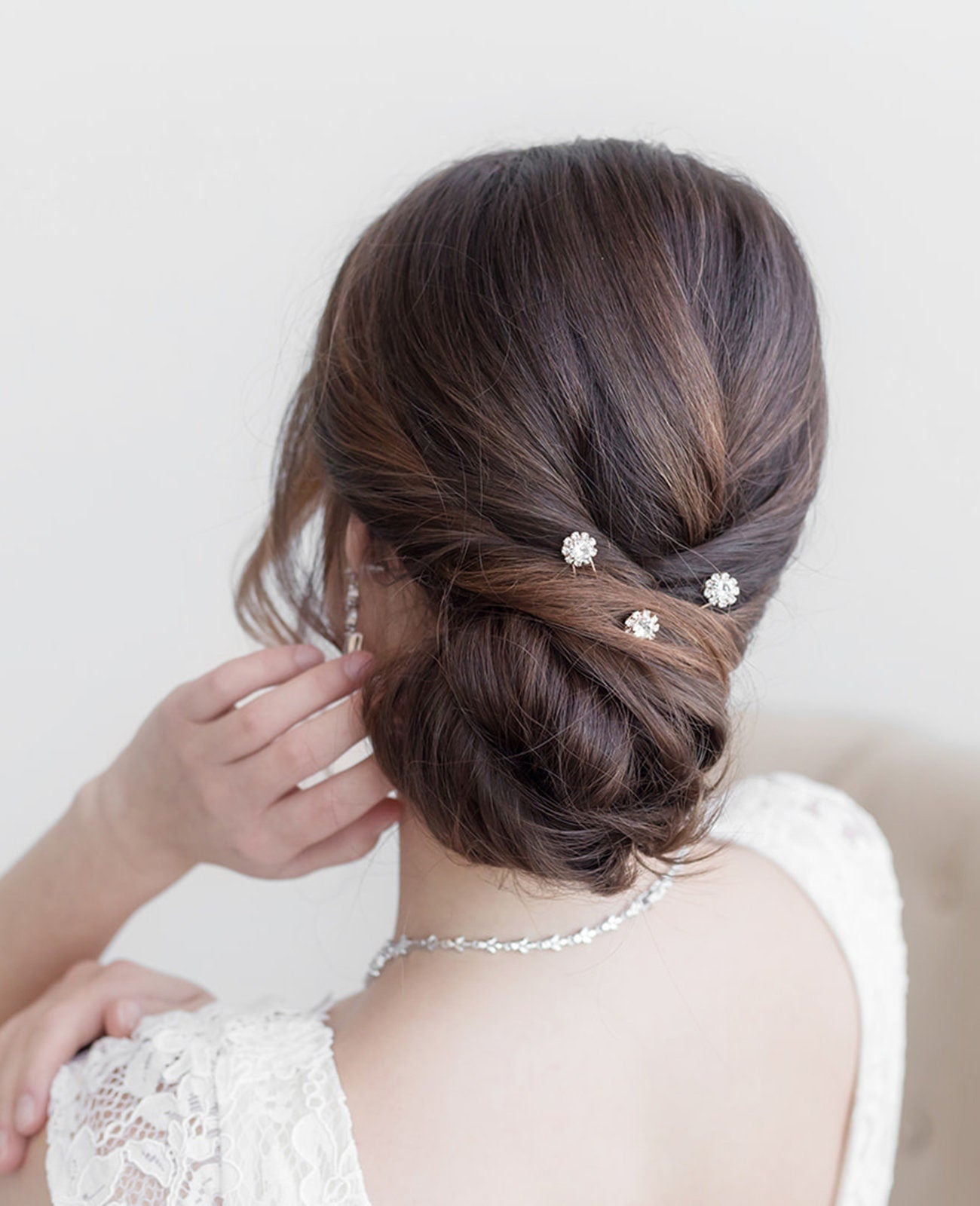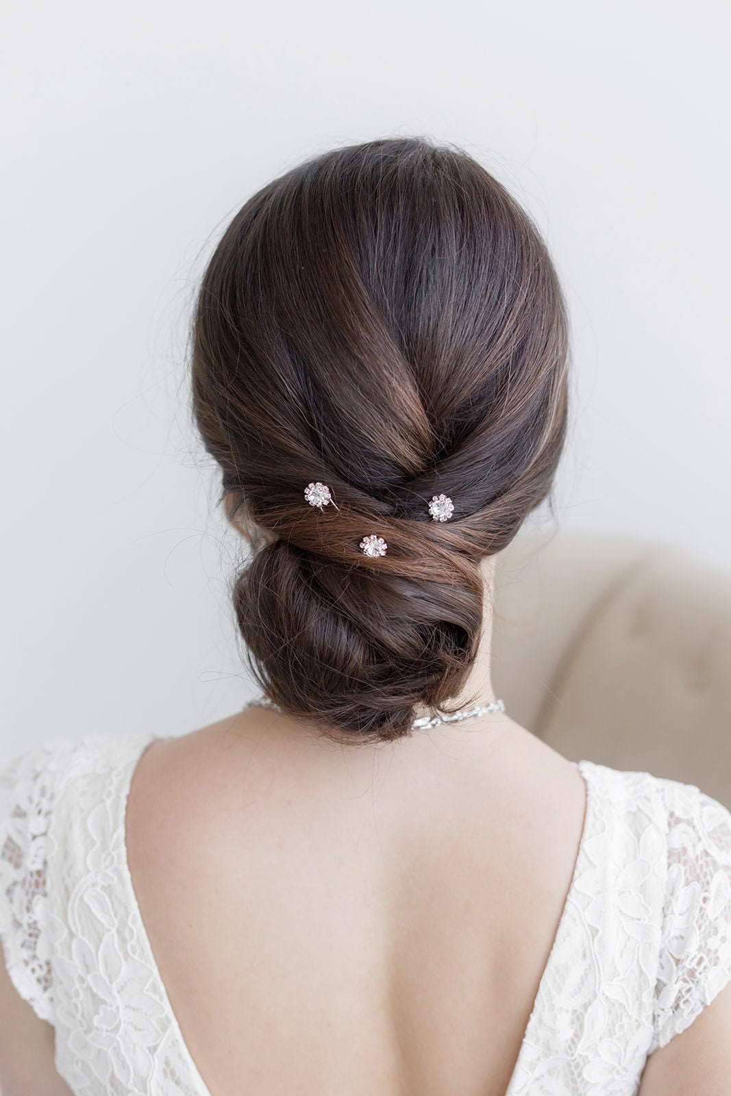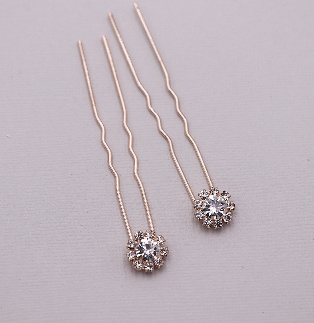 This sparkling hair pin is sure to add beauty to your special day! Features brilliant round rhinestones, measuring 3/4" tall. Wear one, or cluster a few to add brilliance to your hair! Perfect for weddings, the bride, bridesmaids, or any special occasion! Available in silver or rose gold.