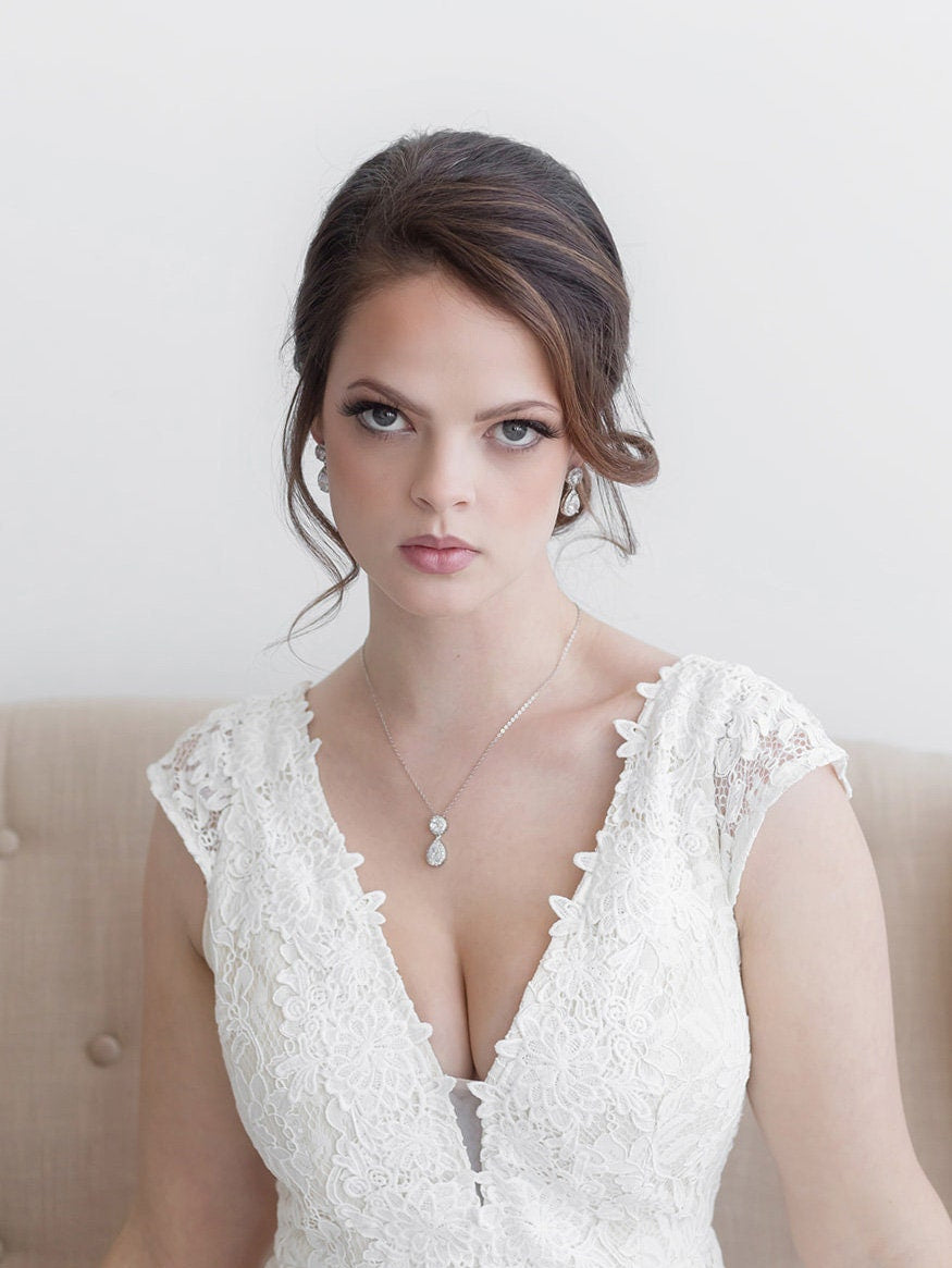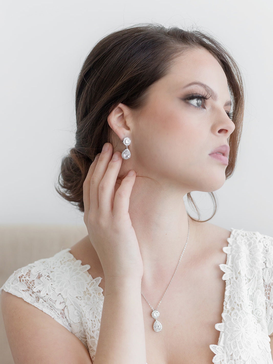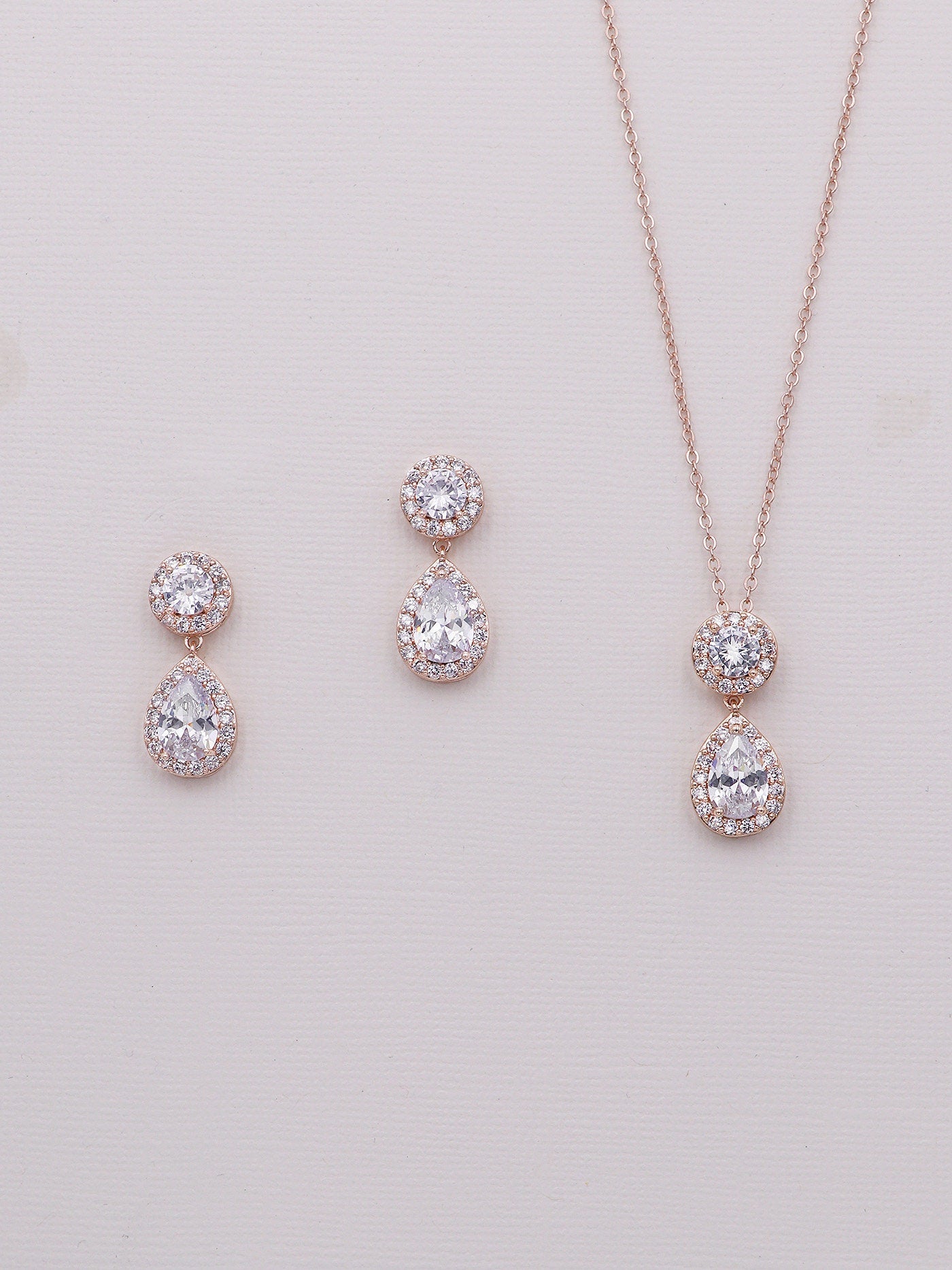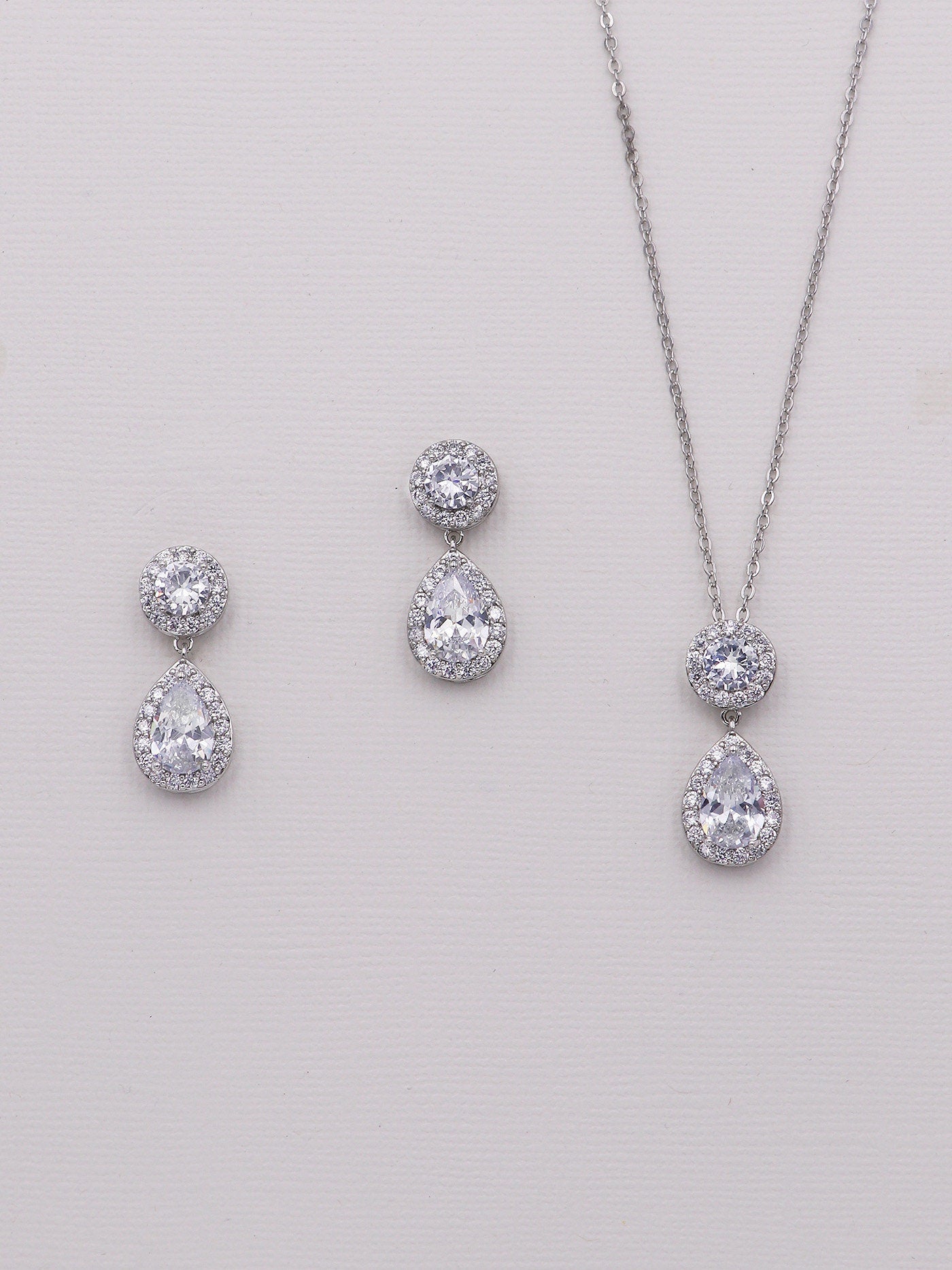 This brilliant earrings and necklace bridal jewelry set will surely add sparkle on your special day! Boasting sparkling round cubic zirconia stones with dangling teardrops. Earrings measure 1". Matching pendant measures 16” and has a 2” extender for additional length. This set is perfect for the bride, bridesmaids, or any special occasion. Available in silver or rose gold!