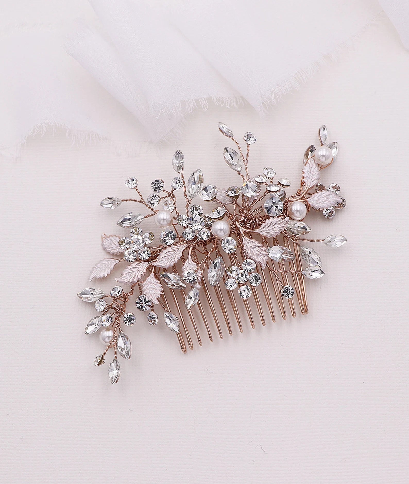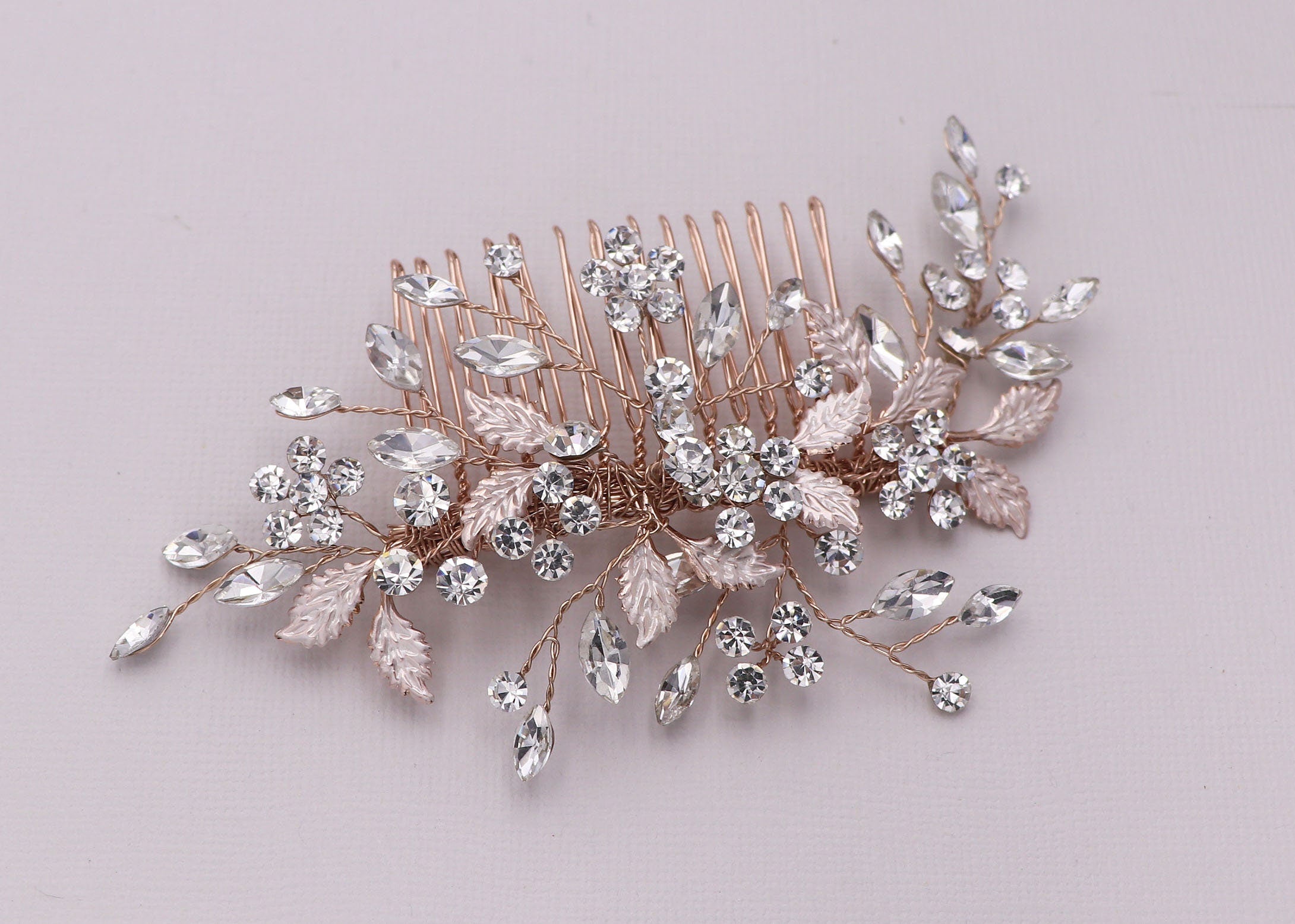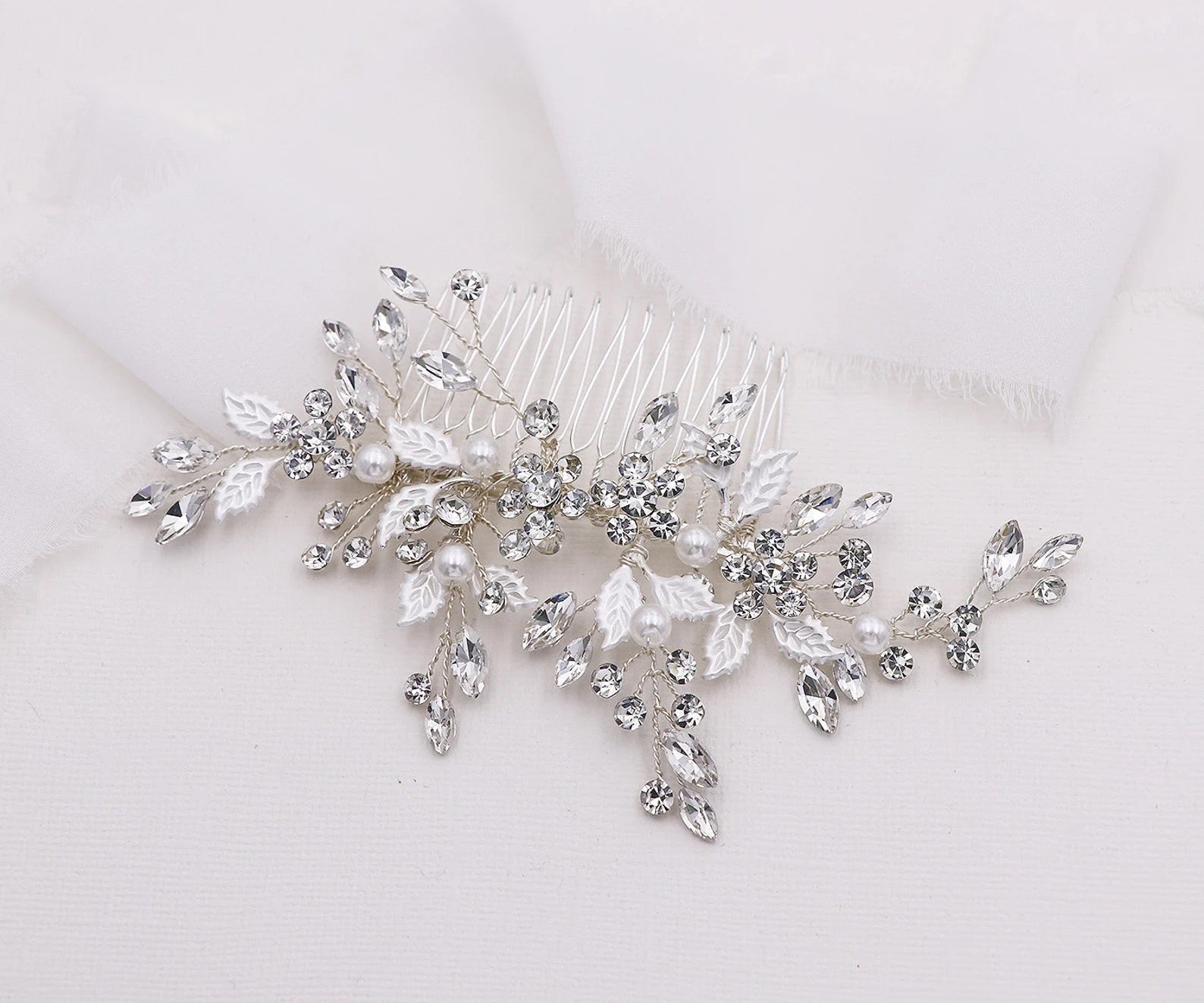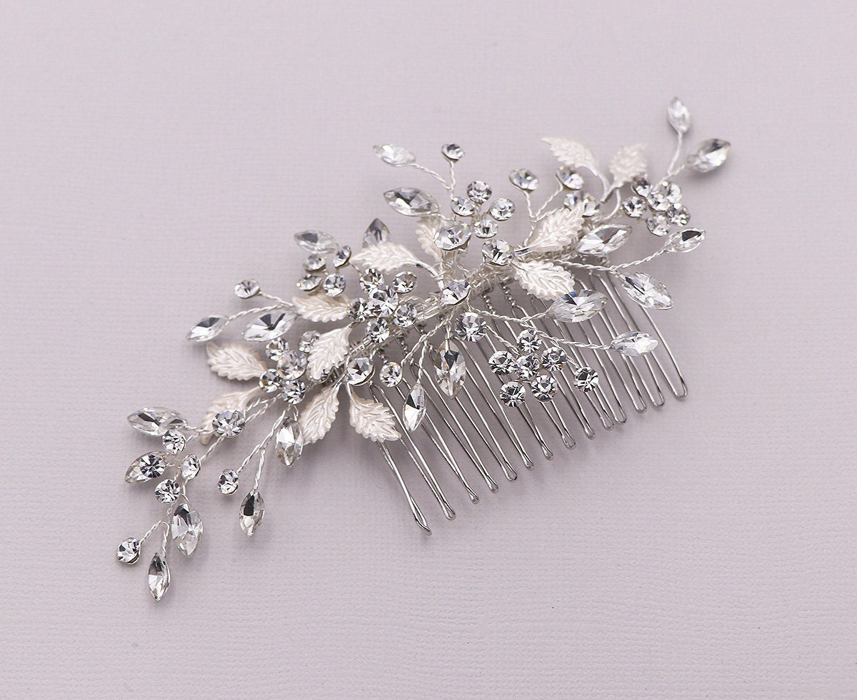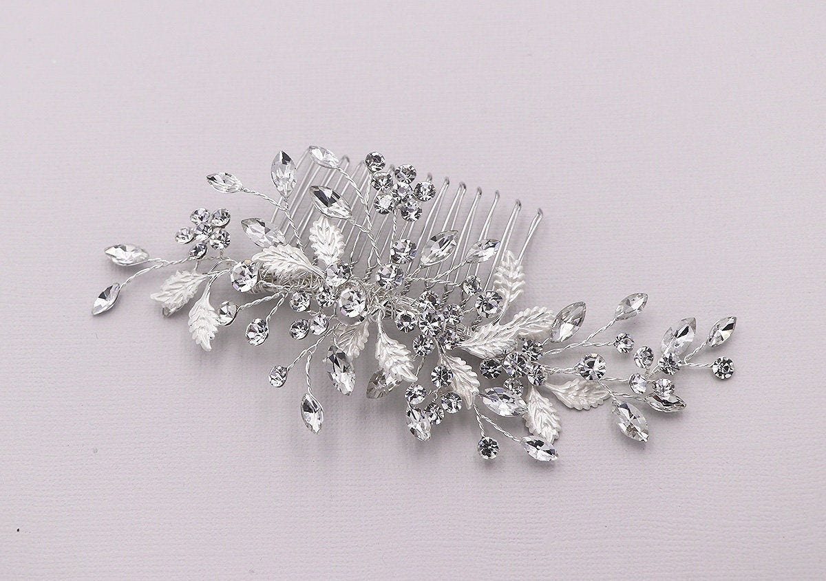 Add a touch of floral elegance with this unique bridal comb featuring high quality crystal rhinestones bursting with sparkle and accenting sprays of brushed metal leaves. Plated in bright silver, this stunning comb measures 5" wide by 2" tall. This comb would be perfect as a side accent or back comb wedding hair accessory. Can be ordered with or without scattered pearls. Available in silver, gold or rose gold.