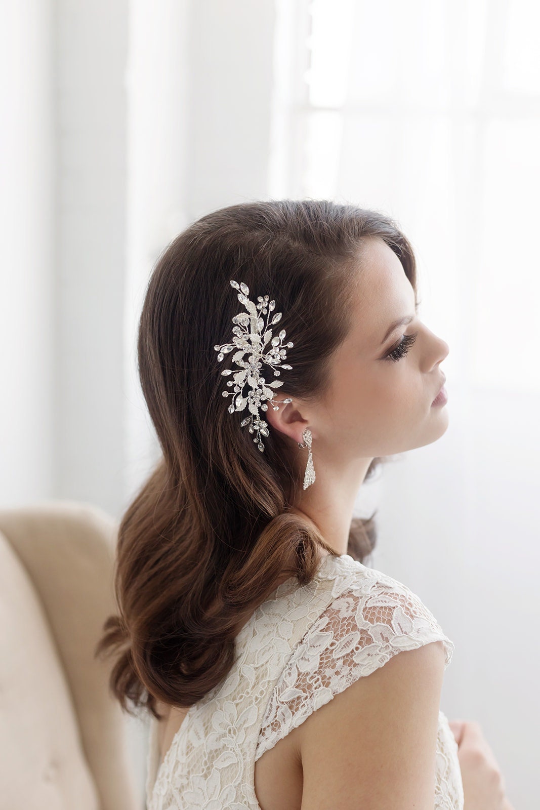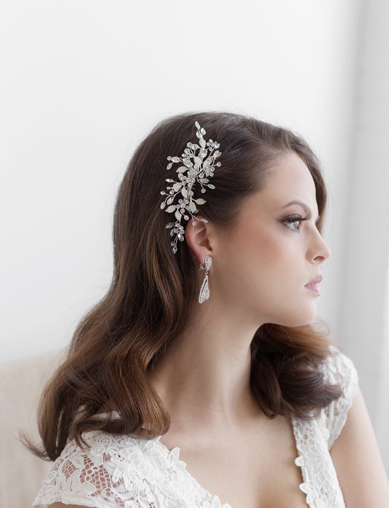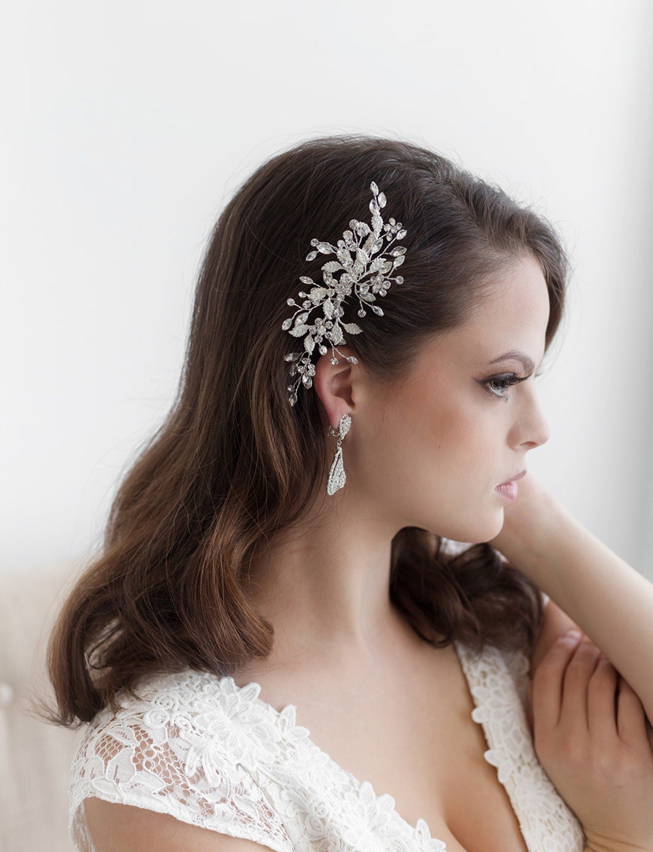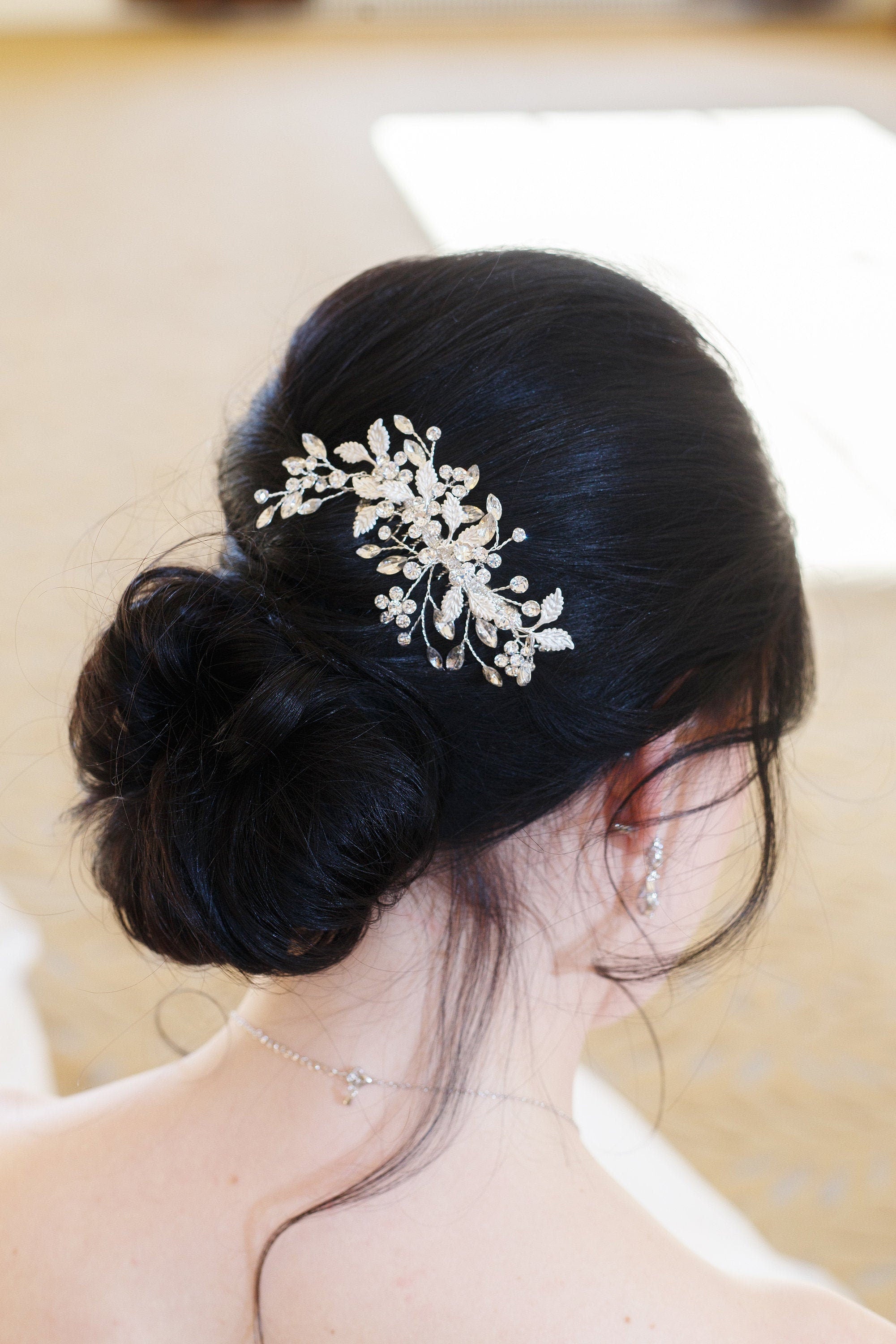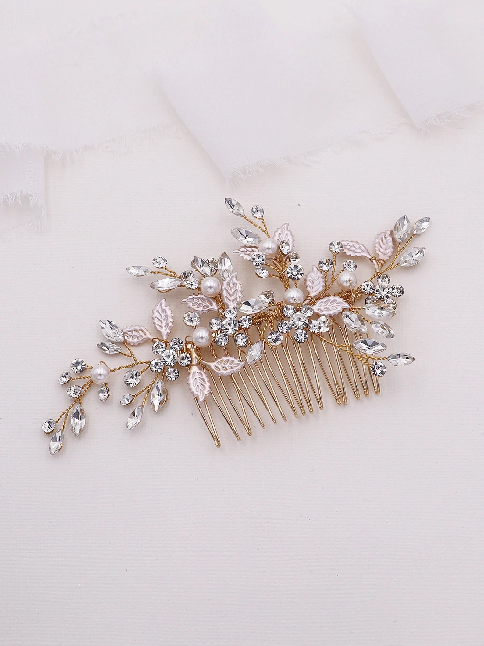 Add a touch of floral elegance with this unique bridal comb featuring high quality crystal rhinestones bursting with sparkle and accenting sprays of brushed metal leaves. Plated in bright silver, this stunning comb measures 5" wide by 2" tall. This comb would be perfect as a side accent or back comb wedding hair accessory. Can be ordered with or without scattered pearls. Available in silver, gold or rose gold.