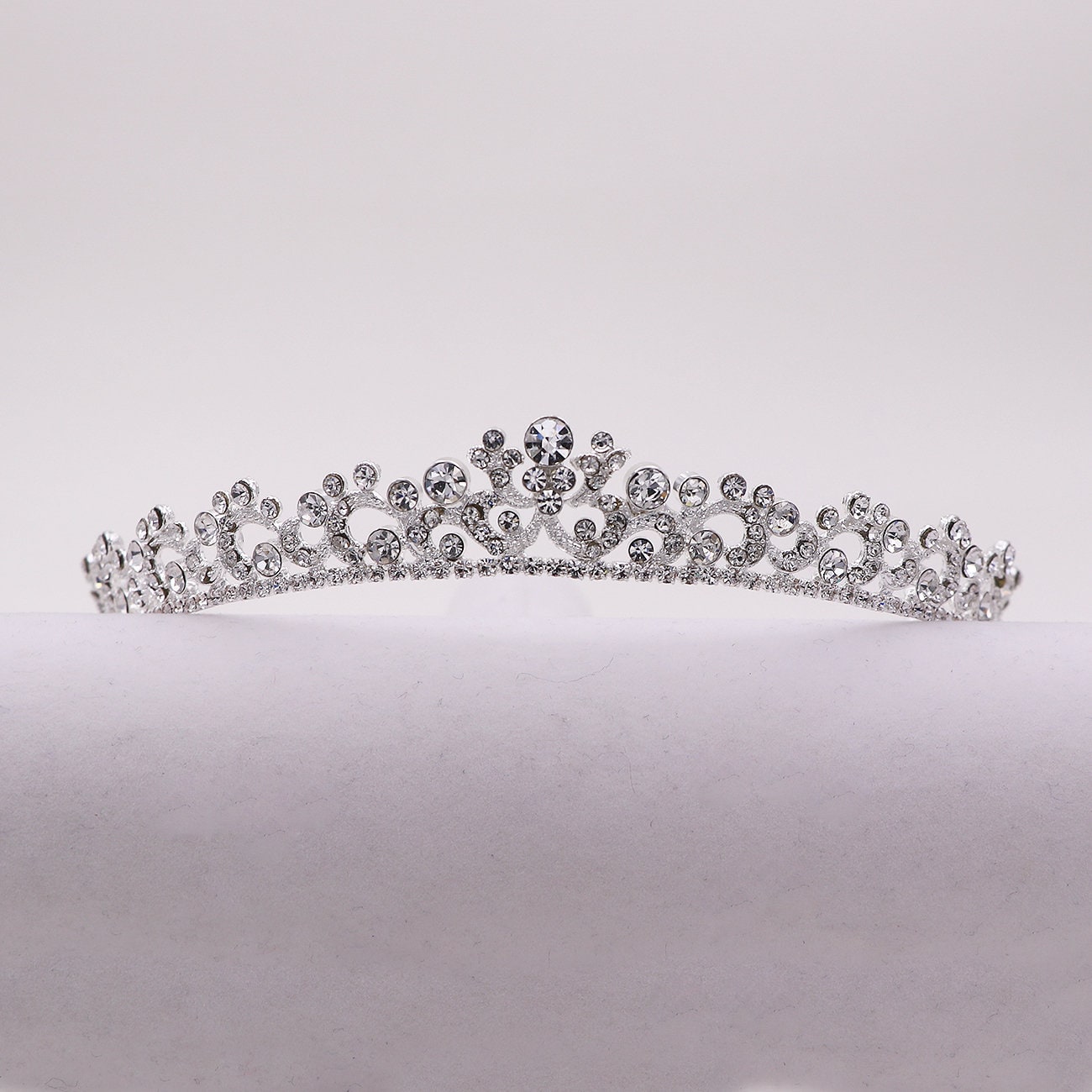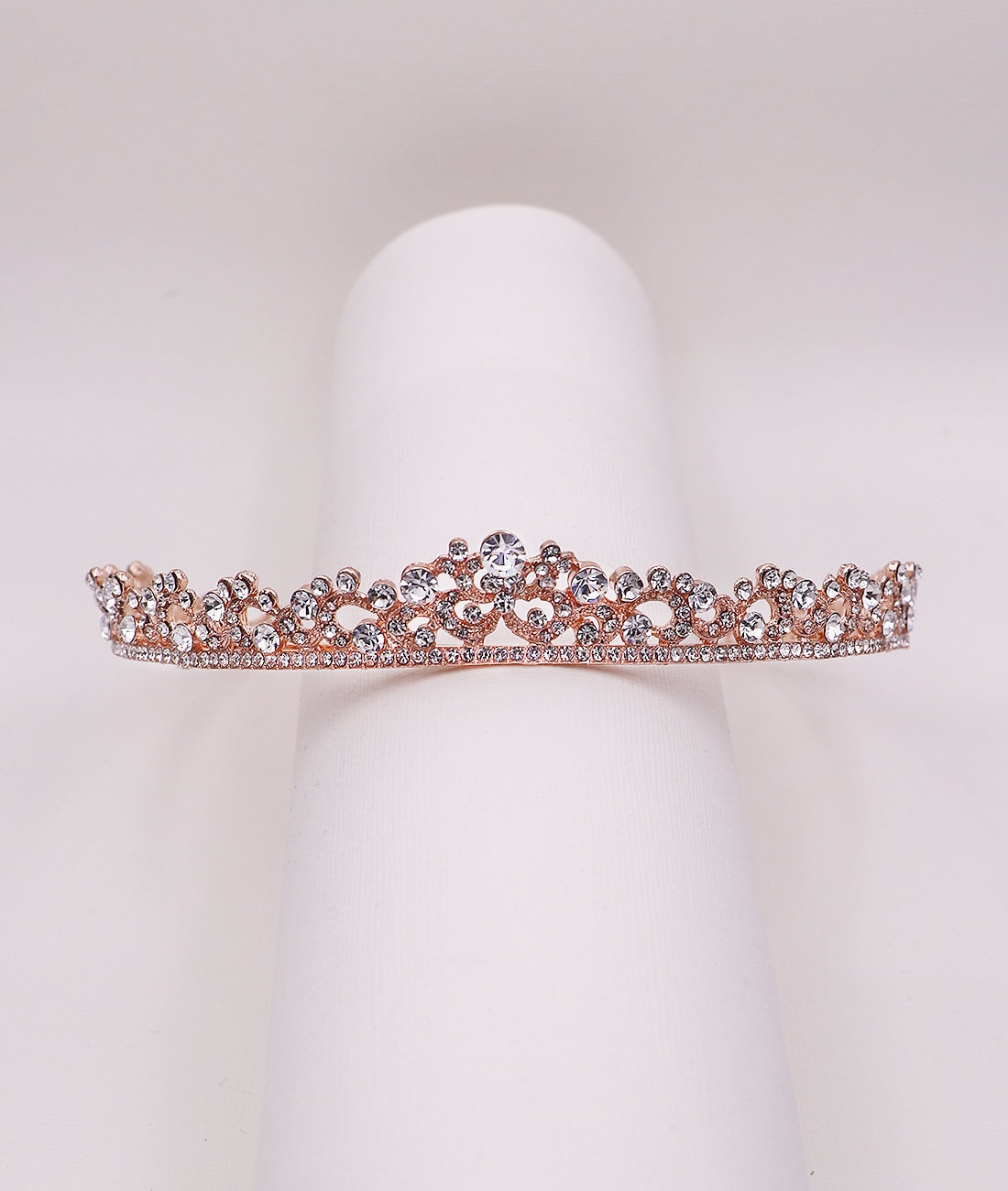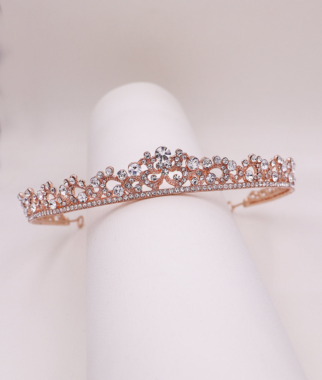 This sparkling wedding tiara for brides is uniquely designed with rhinestone crystals for a sophisticated look. Balancing symmetry and beauty, this wedding tiara measures 1" at the highest point, this sparkling headpiece is sure to add beauty and elegance to your special day! Design spans almost to the end of the headpiece making for a full, dramatic headpiece look. Choose from silver, gold rose gold finish. This tiara is perfect for weddings, bridesmaids, prom, and special occasions!