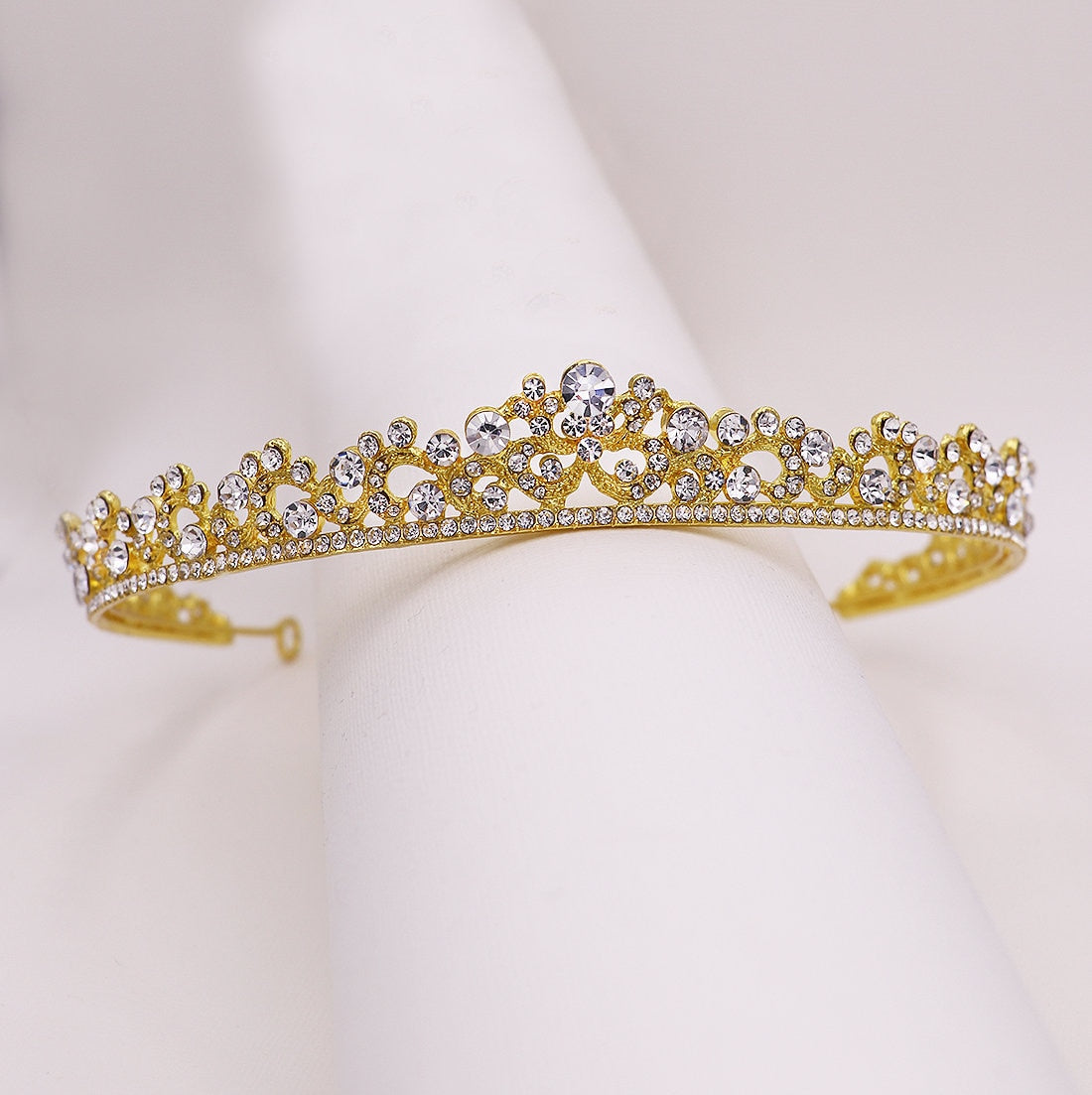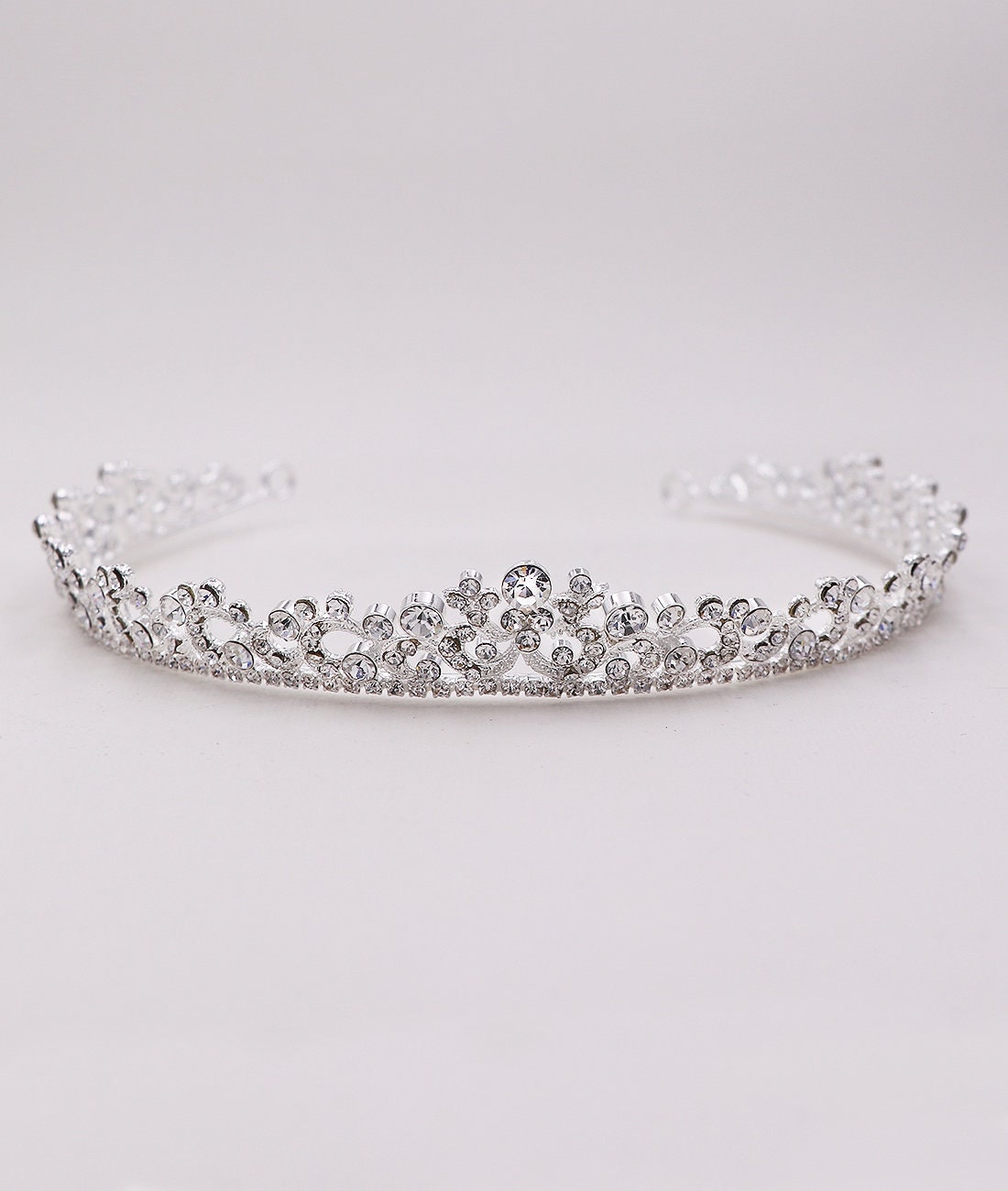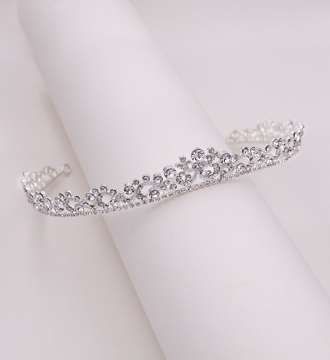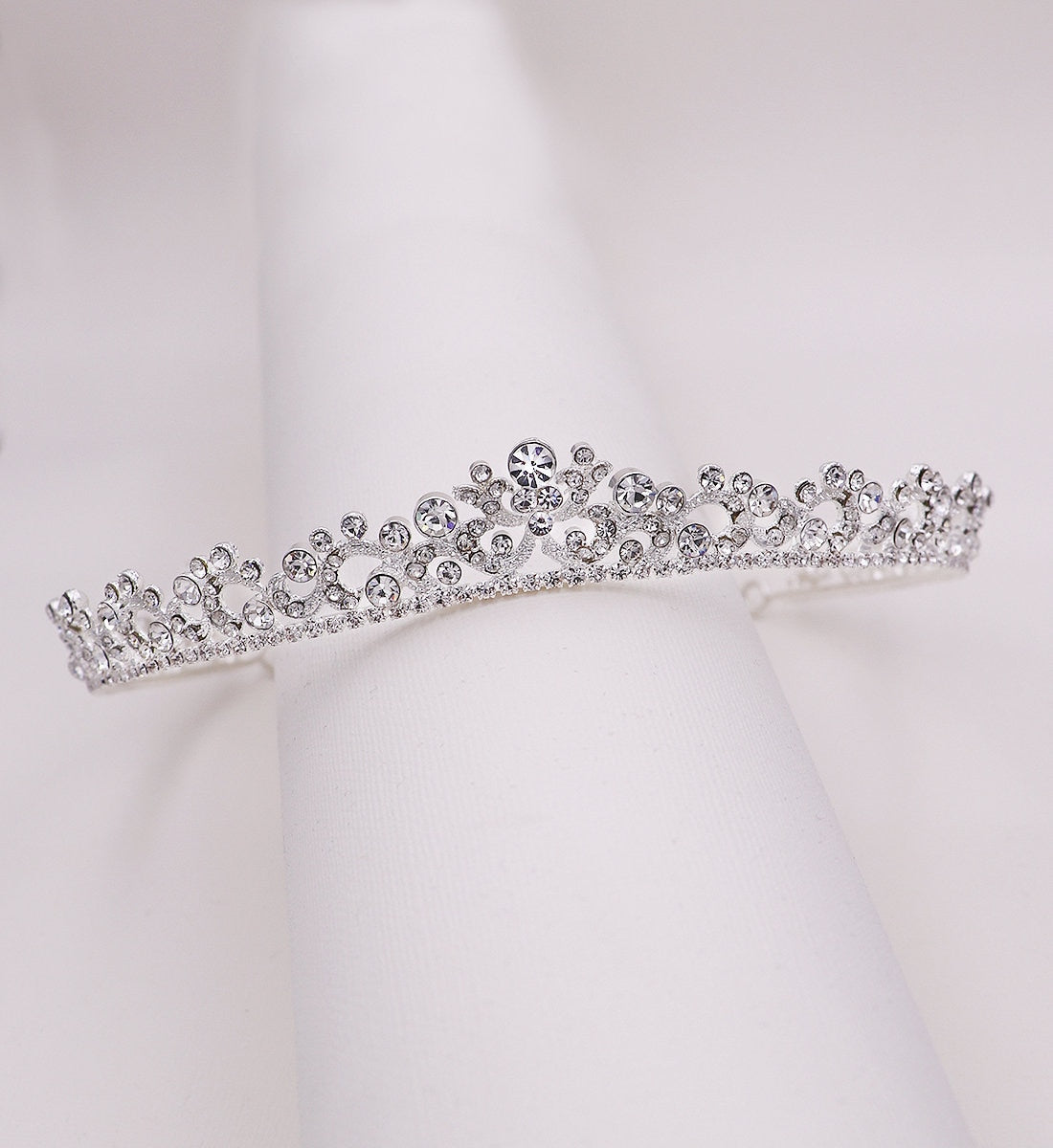 This sparkling wedding tiara for brides is uniquely designed with rhinestone crystals for a sophisticated look. Balancing symmetry and beauty, this wedding tiara measures 1" at the highest point, this sparkling headpiece is sure to add beauty and elegance to your special day! Design spans almost to the end of the headpiece making for a full, dramatic headpiece look. Choose from silver, gold rose gold finish. This tiara is perfect for weddings, bridesmaids, prom, and special occasions!