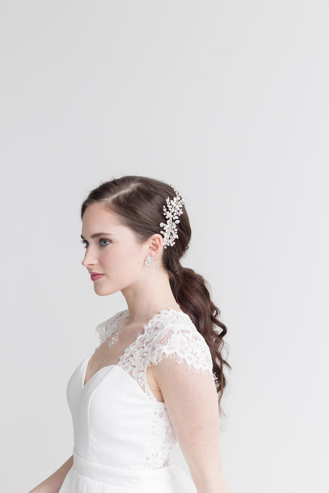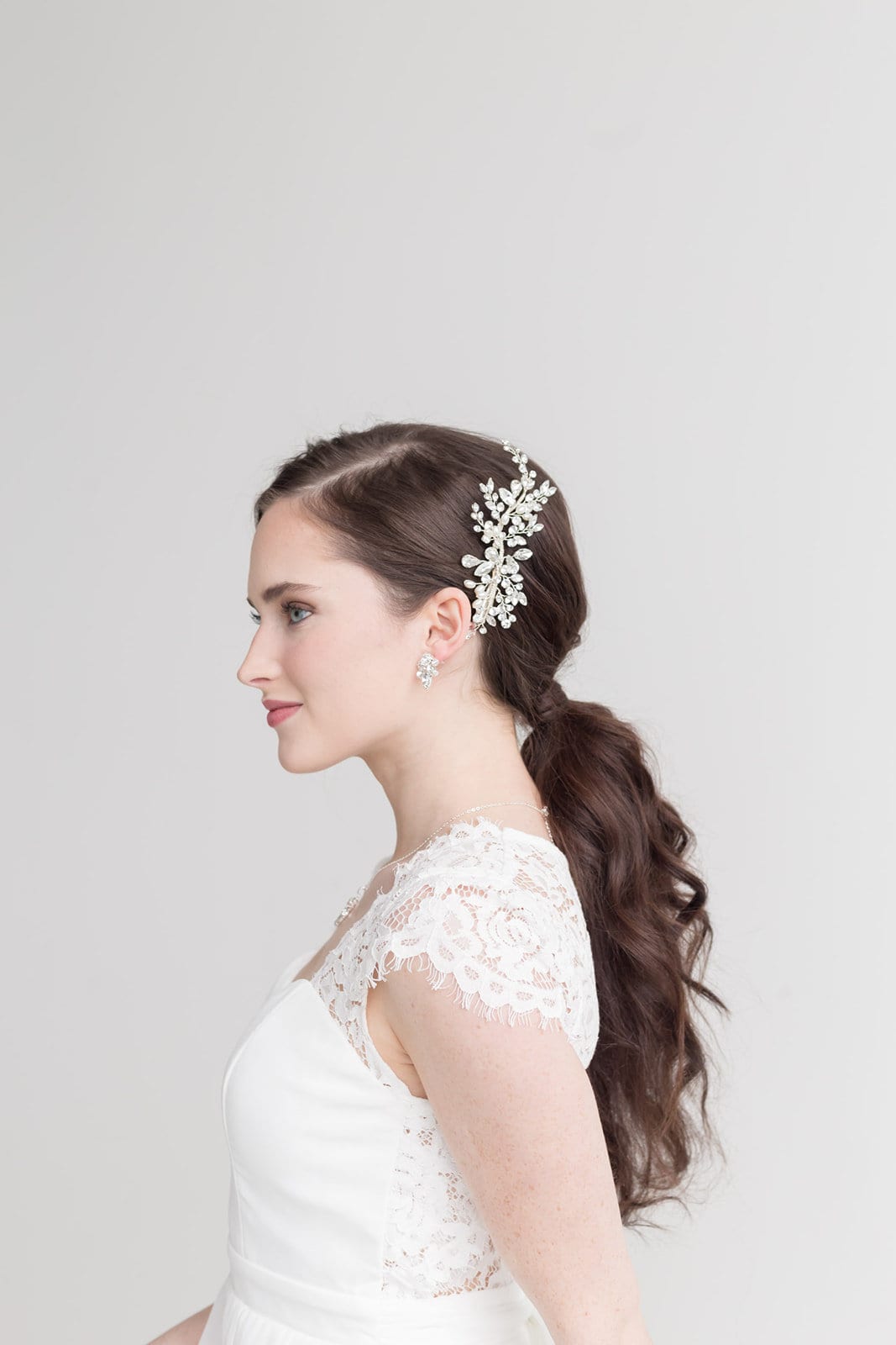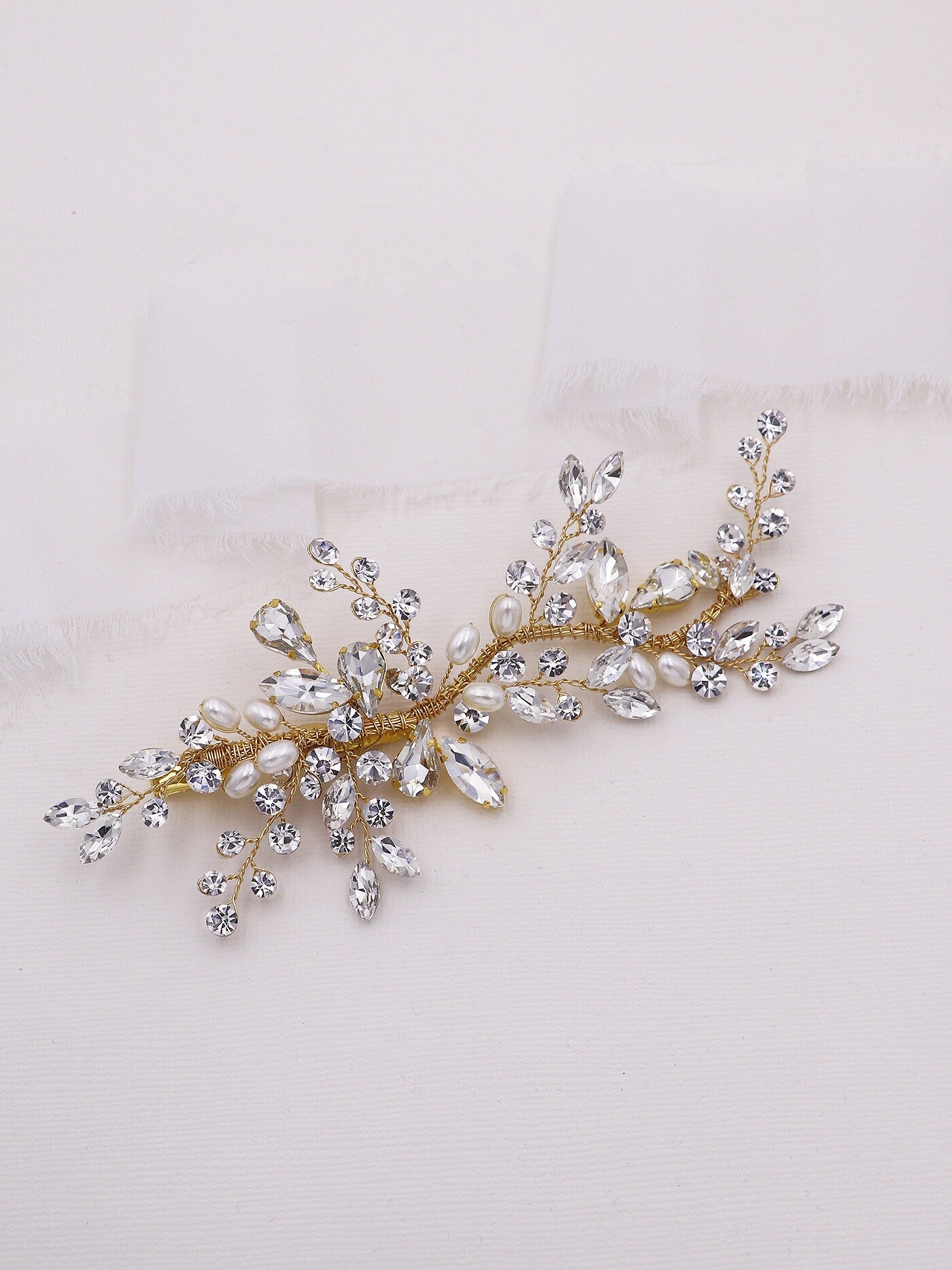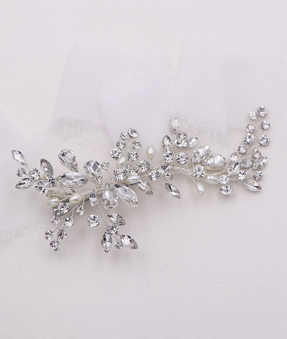 This unique wedding headpiece is hand-wired with accents of brilliant marquise, pear and round rhinestones with just a touch of pearls and is sure to make a statement! This piece is flexible so it can be manipulated to suit your personal hairstyle. The design portion measures 5 1/2" long and 2 1/2" at the wide. Has an alligator clip for secure placement. Choose from silver, gold or rose gold.