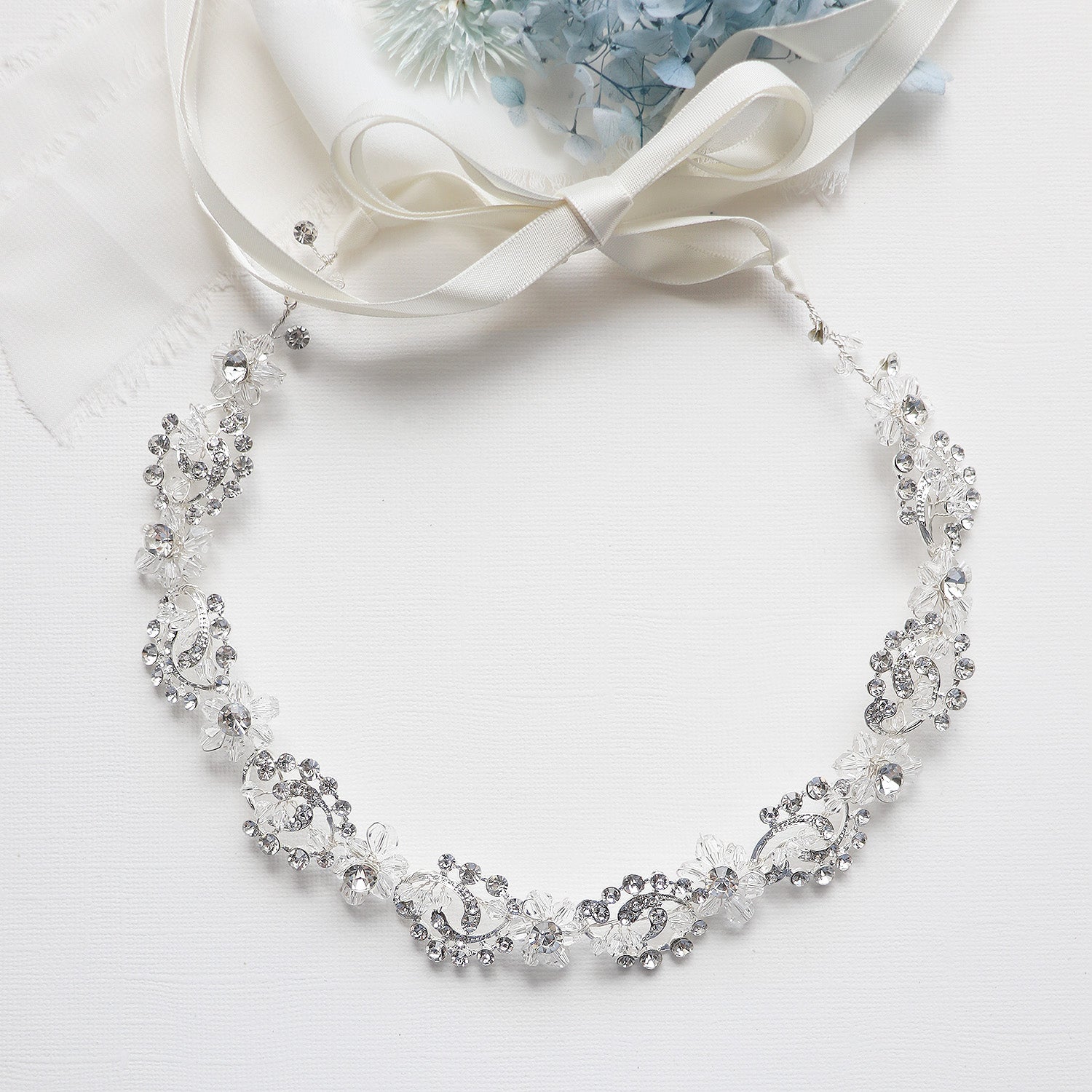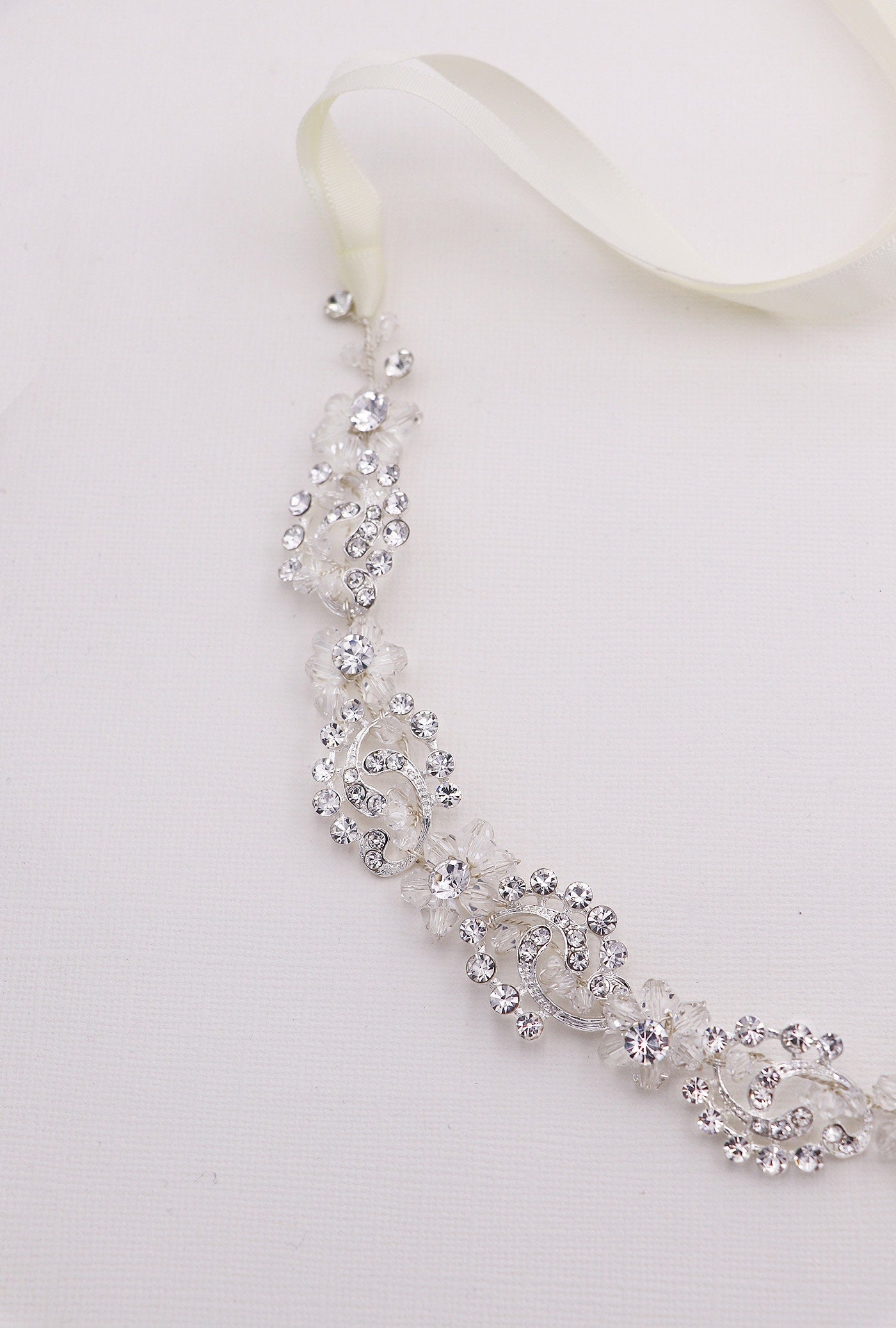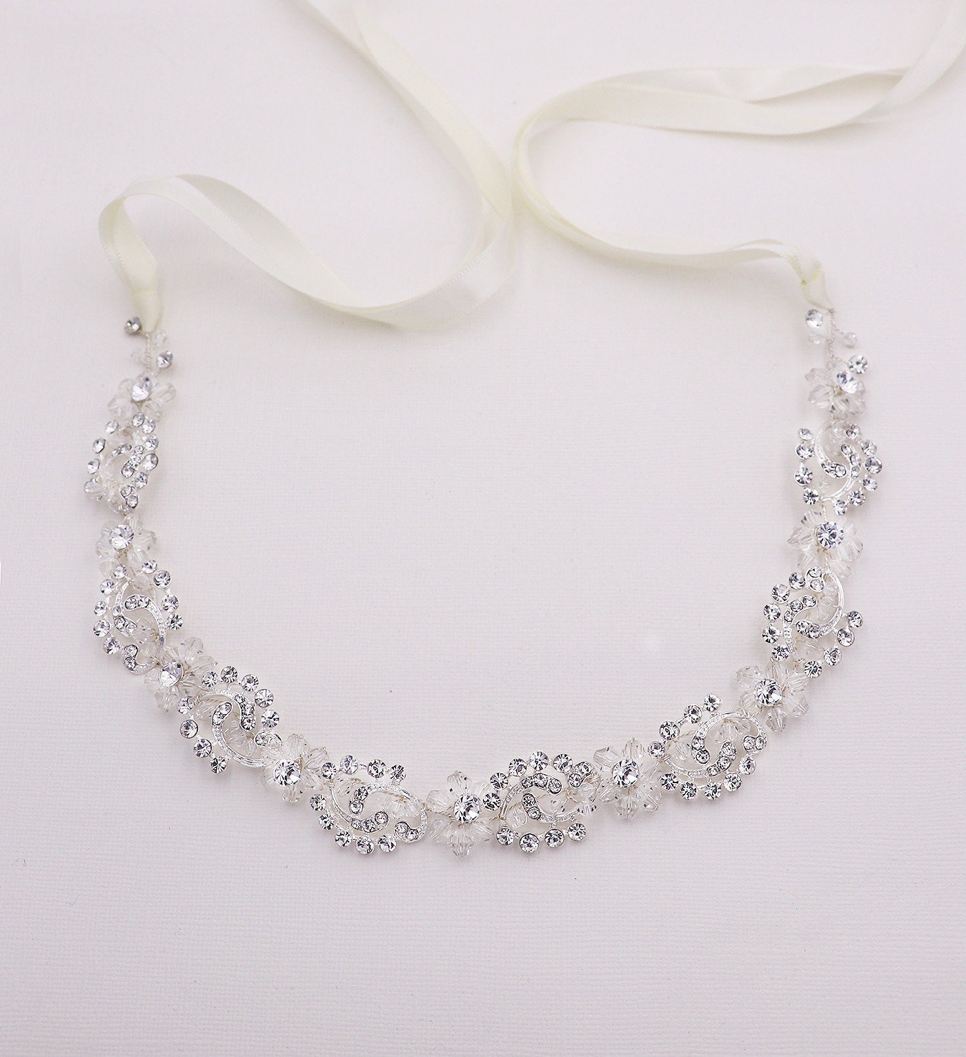 This brilliant crystal wedding headband boasts shining rhinestones and bicone crystals in a floral, cluster pattern. Measuring 3/4" wide and the rhinestone design portion measures 14" long, this sparkling headpiece is sure to add beauty to your special day! This gorgeous headpiece can be ordered with or without ribbon. Can be worn as a headband or as a back vine headpiece. This headband is perfect for weddings, bridesmaids, prom, and parties! Now available in silver or rose gold!