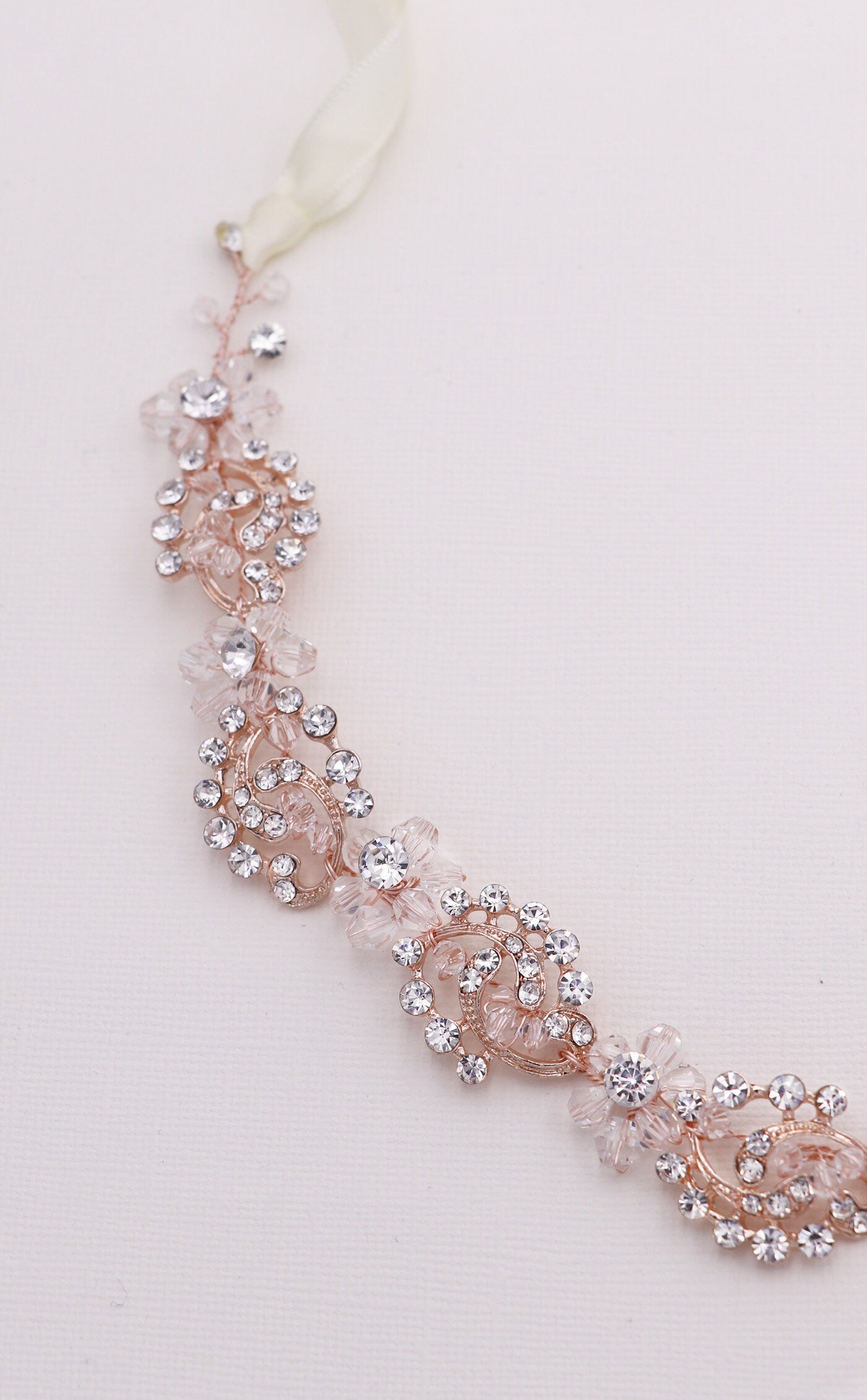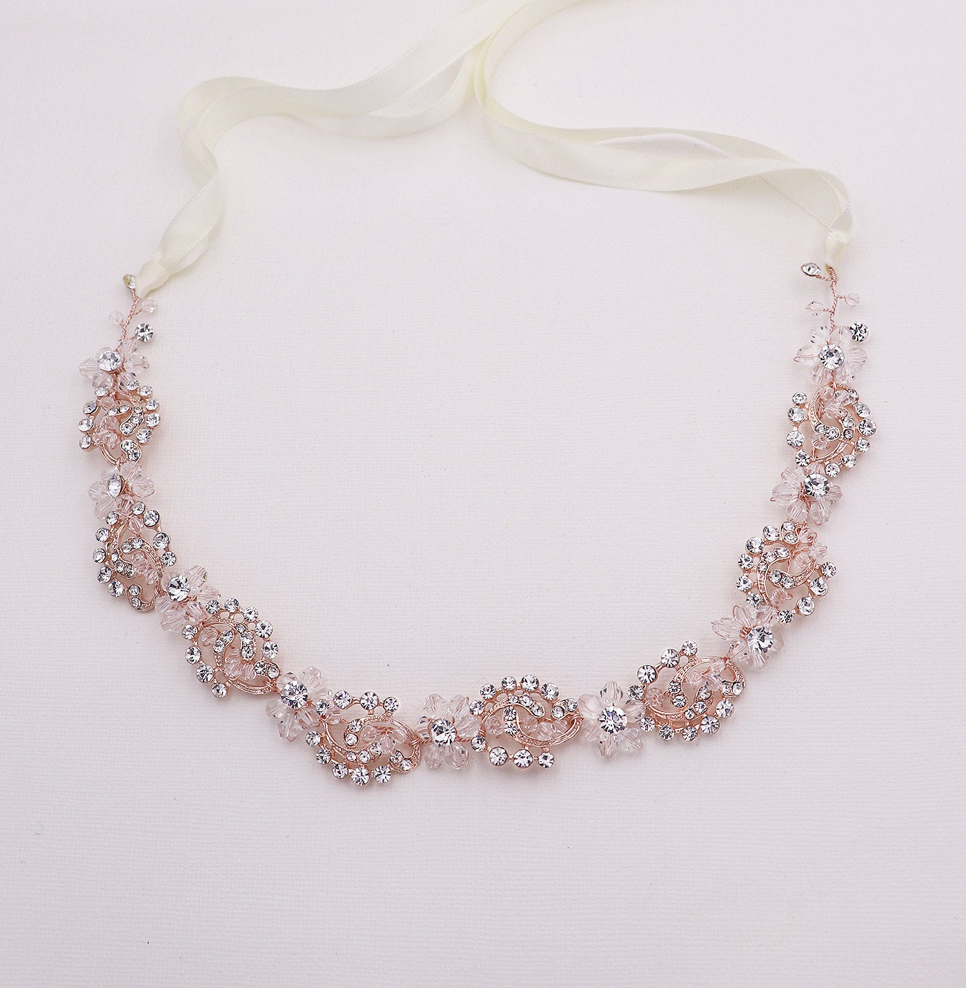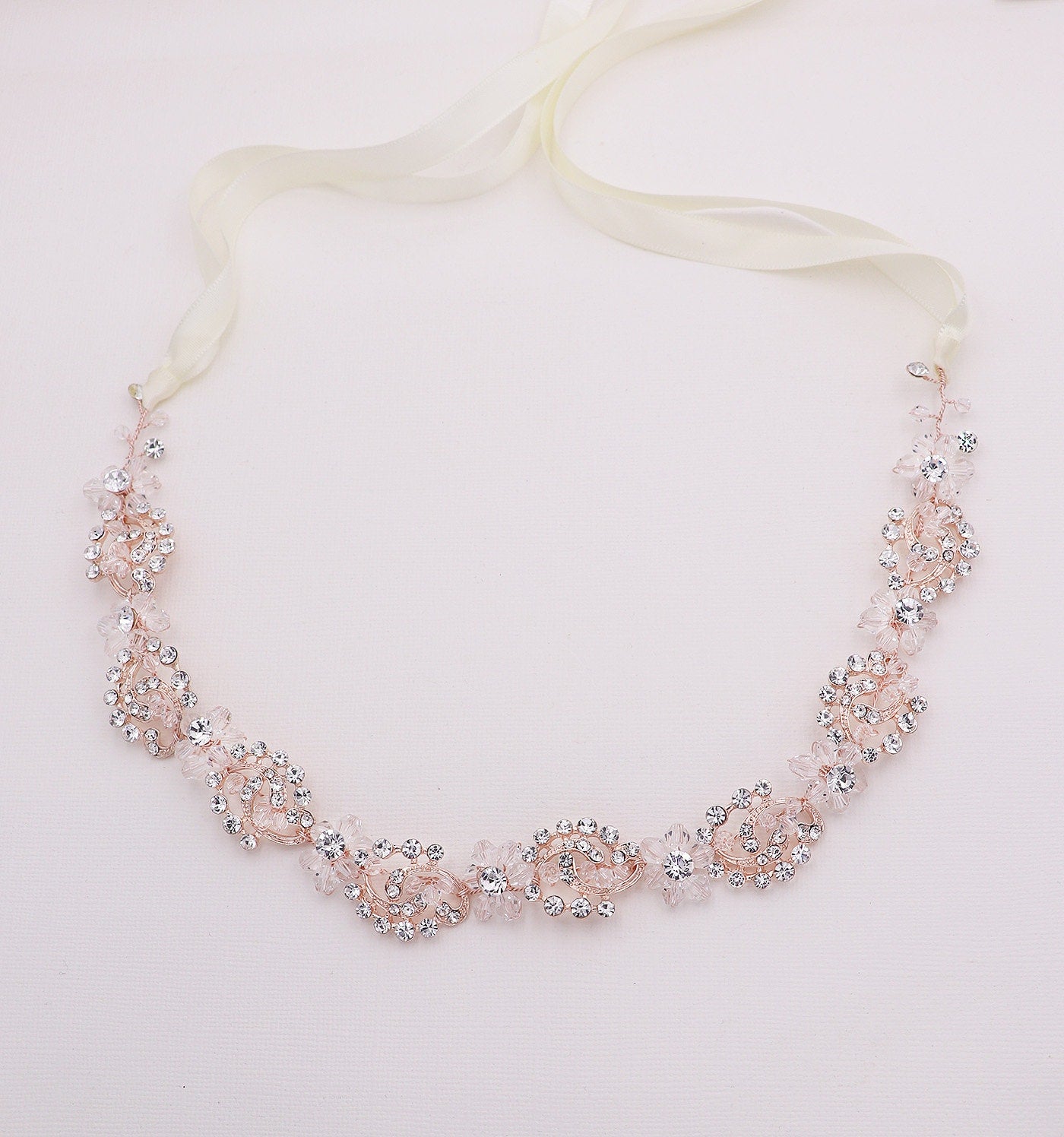 This brilliant crystal wedding headband boasts shining rhinestones and bicone crystals in a floral, cluster pattern. Measuring 3/4" wide and the rhinestone design portion measures 14" long, this sparkling headpiece is sure to add beauty to your special day! This gorgeous headpiece can be ordered with or without ribbon. Can be worn as a headband or as a back vine headpiece. This headband is perfect for weddings, bridesmaids, prom, and parties! Now available in silver or rose gold!