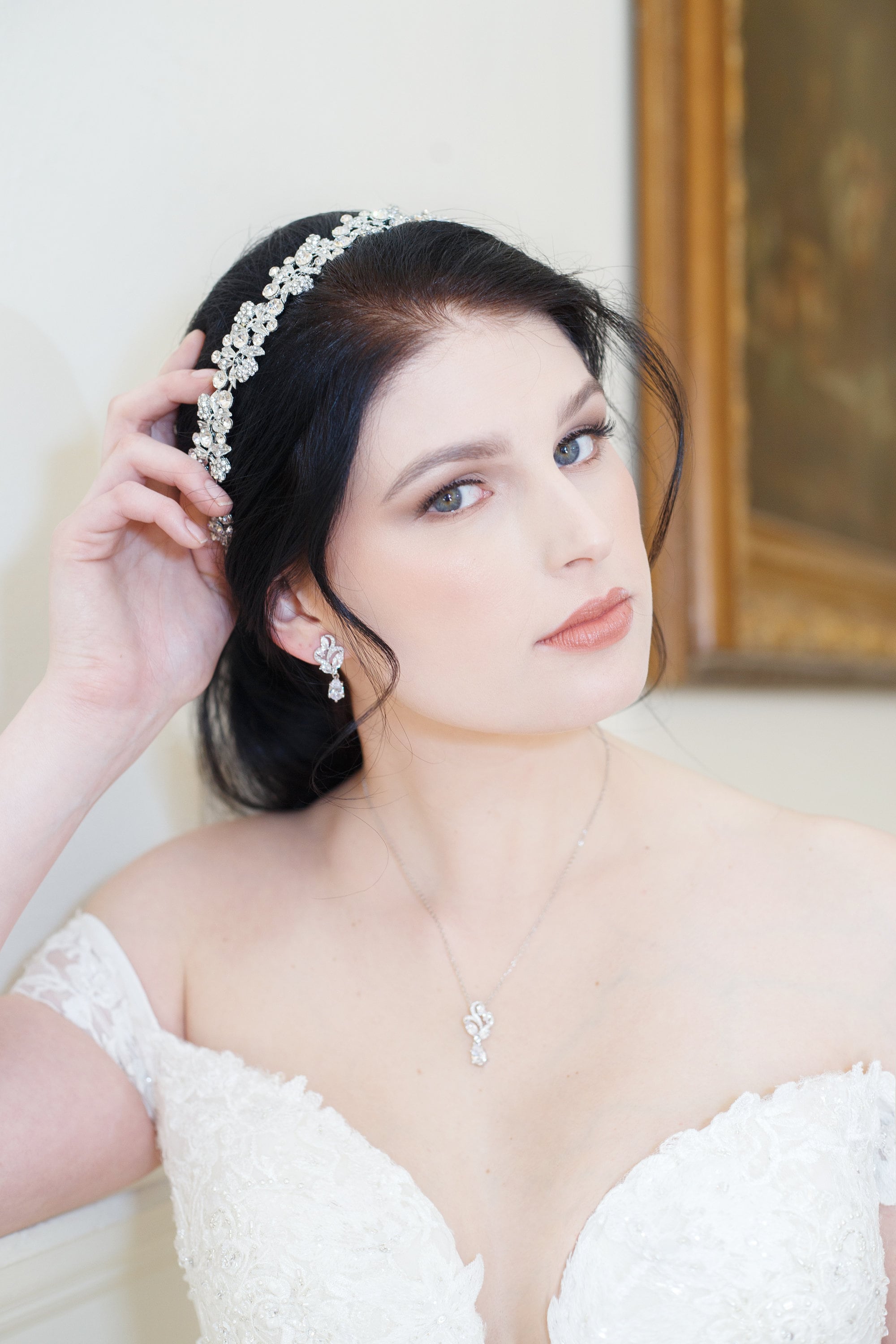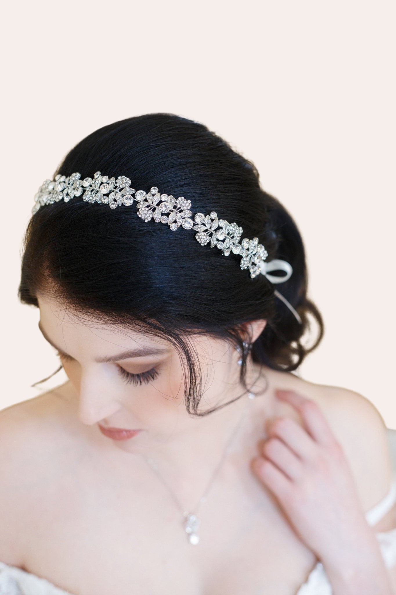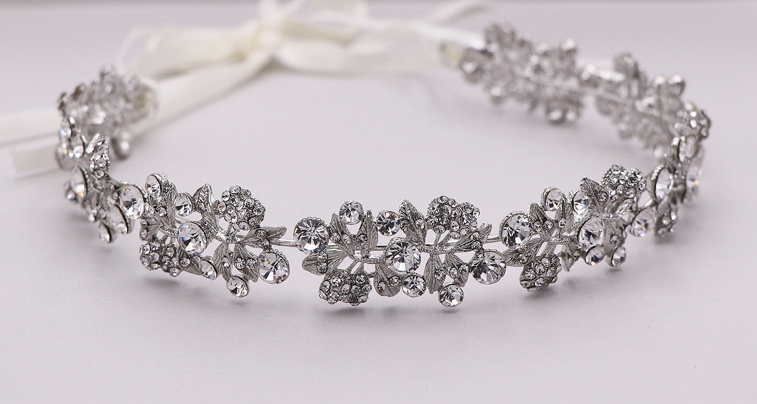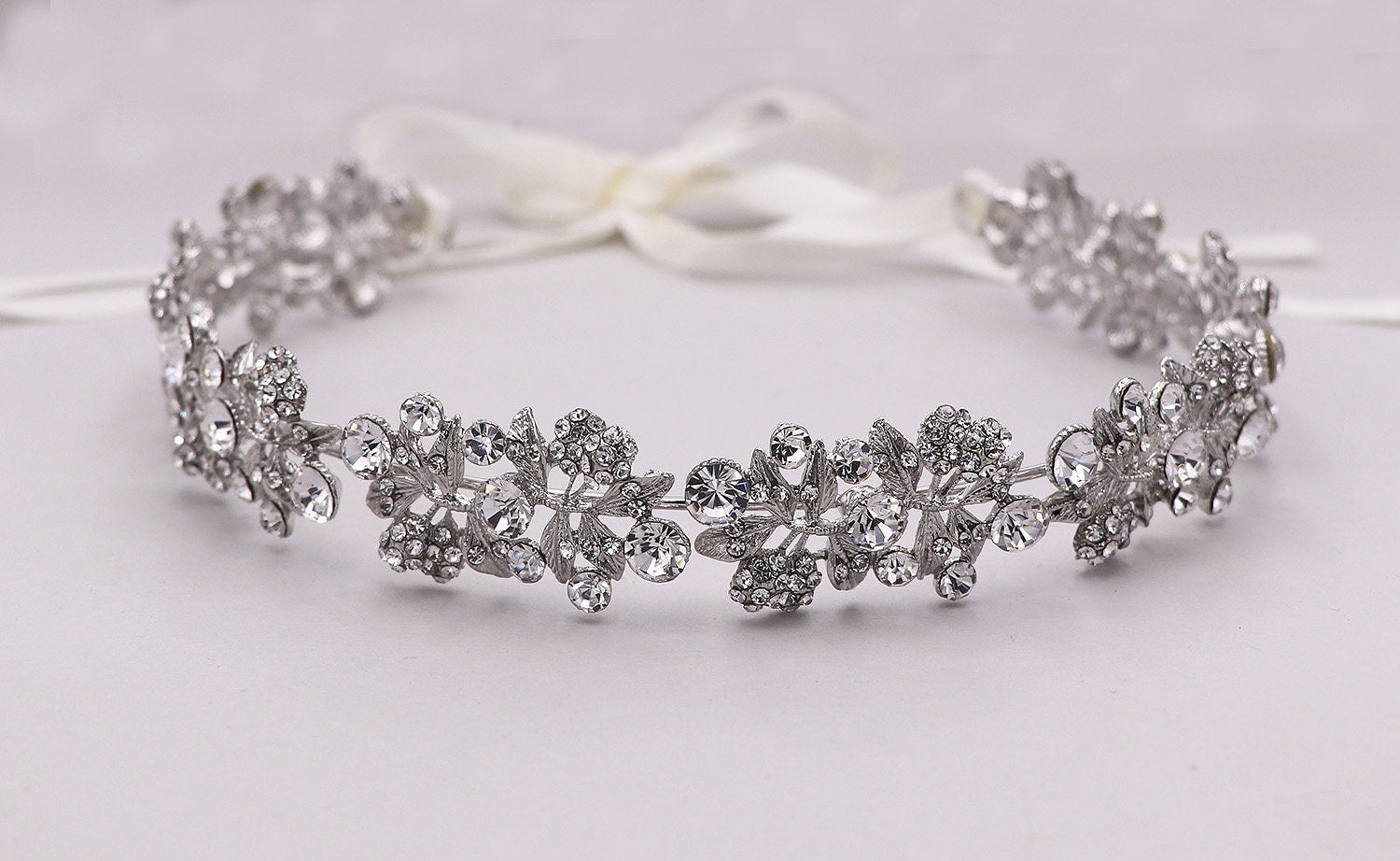 Add brilliance to your special day with this sparkling wedding headband featuring clusters of round rhinestone crystals. Measures 1" wide. This headband can be worn with or without attached ribbon. Makes a beautiful bridal headpiece for weddings!