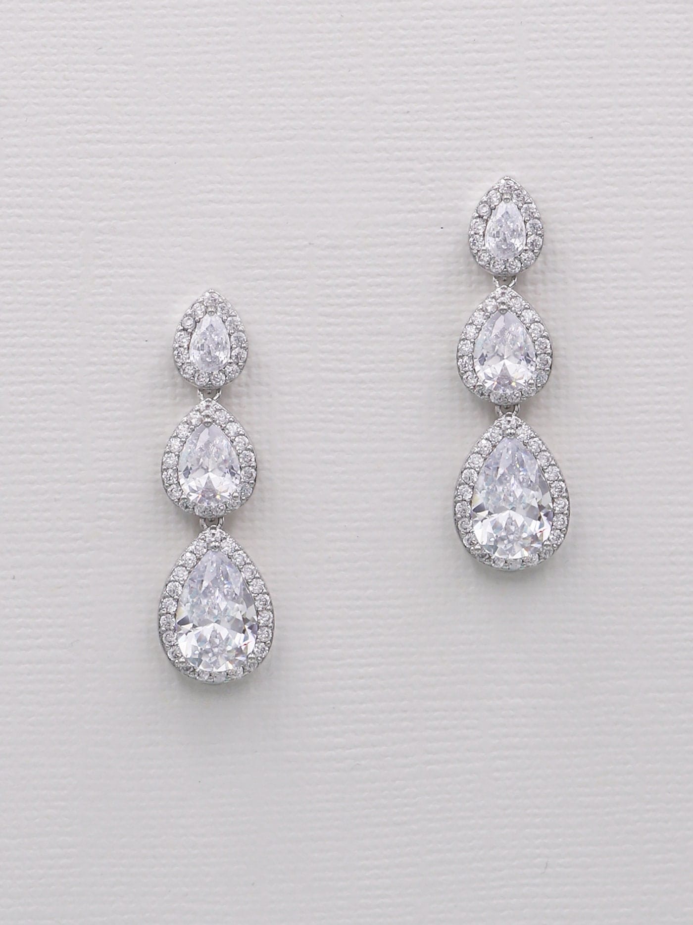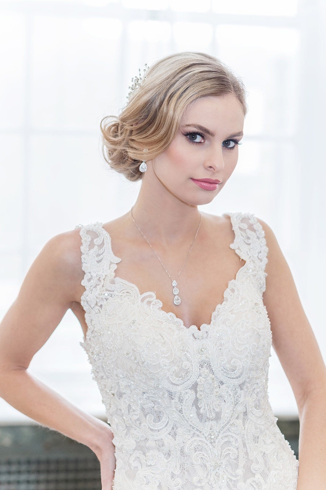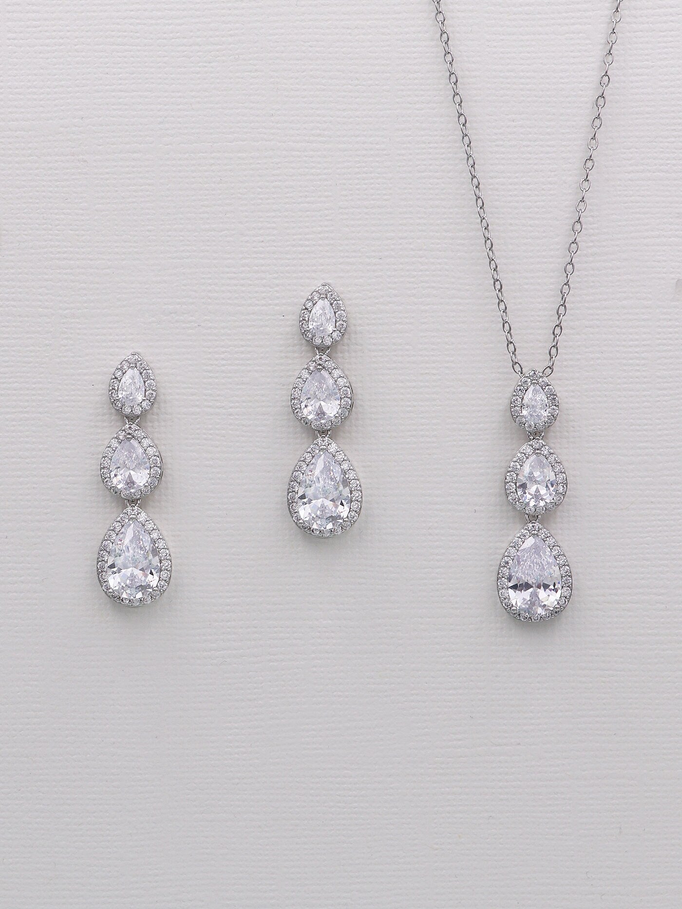 Add a touch of sparkle and these classically designed framed cubic zirconia teardrop wedding pendant necklace set, with stones that gradually get larger as they dangle with sparkle. Design portion measuring 1 1/2" long, this is perfect for any special occasion. Necklace measures 16" and is adjustable up to 18" long. Choose from earrings and necklace set or with coordinating bracelet measuring 7" long. Available in silver, gold or rose gold.