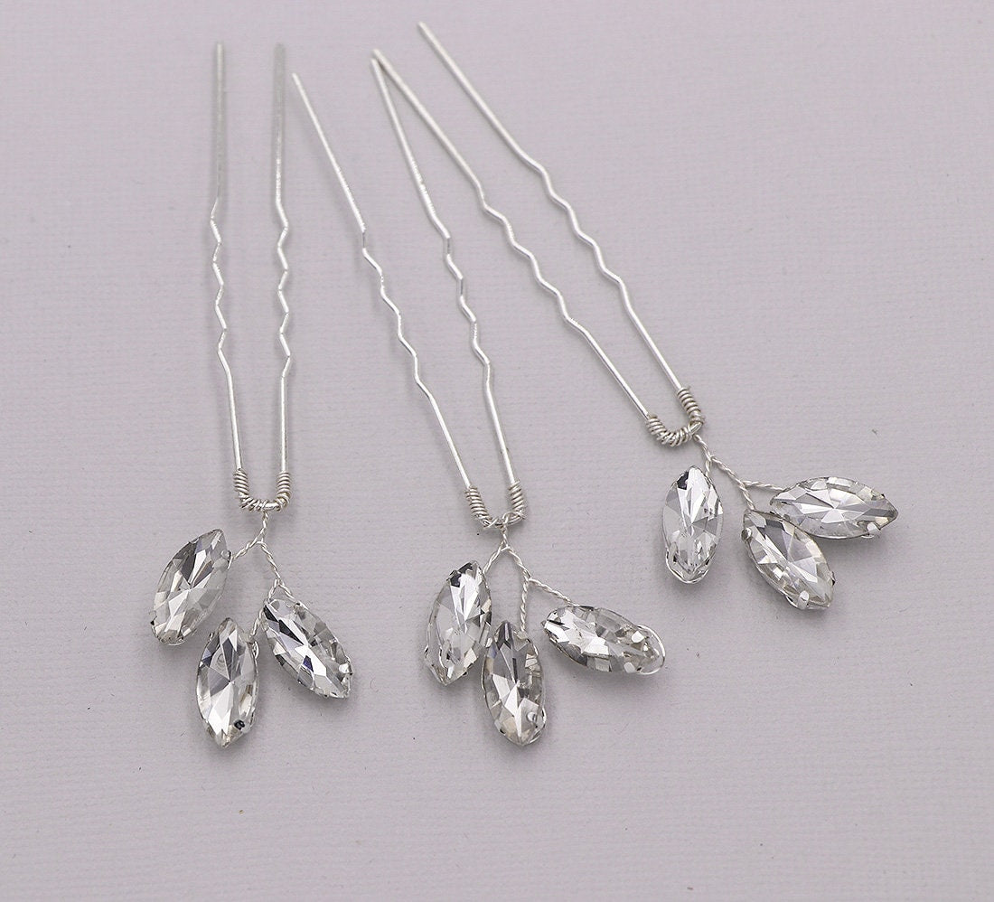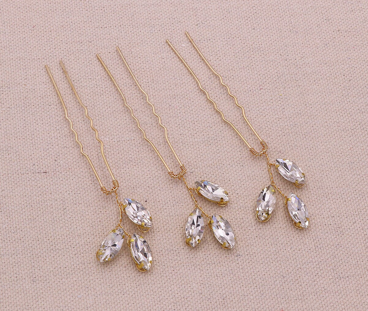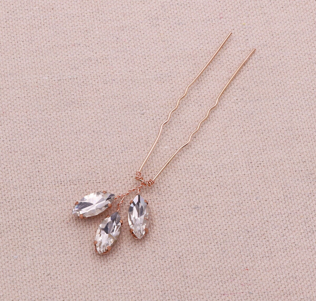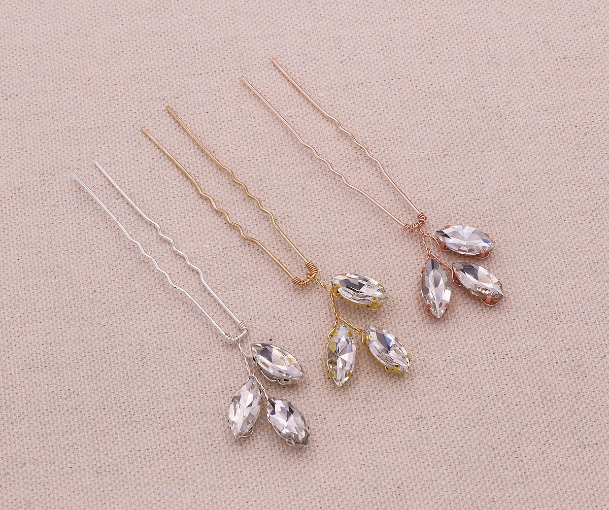 This sparkling hair pin is sure to add beauty to your special day! Features brilliant marquise rhinestones, measuring 1" tall. Wear one, or cluster a few to add brilliance to your hair! Perfect for weddings, the bride, bridesmaids, or any special occasion! Sold in sets of 3. Choose from silver, gold or rose gold finish!