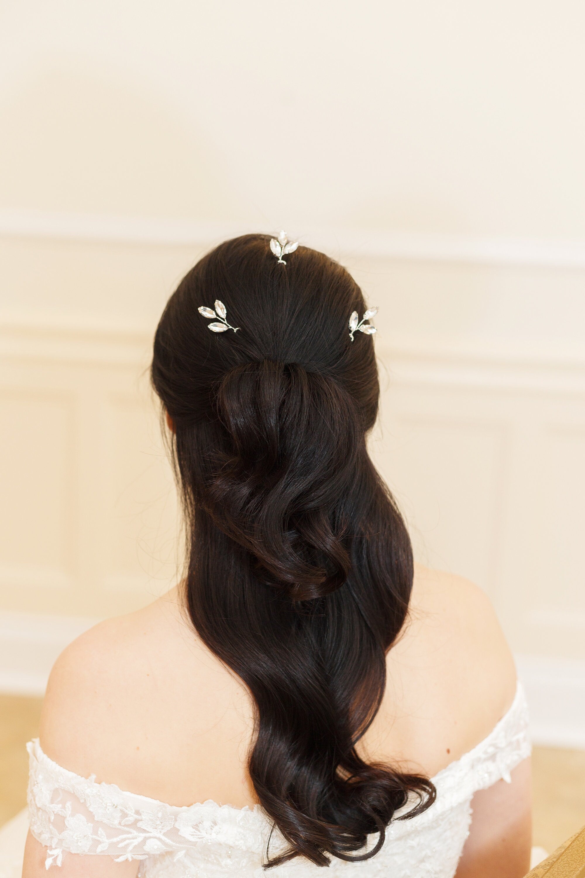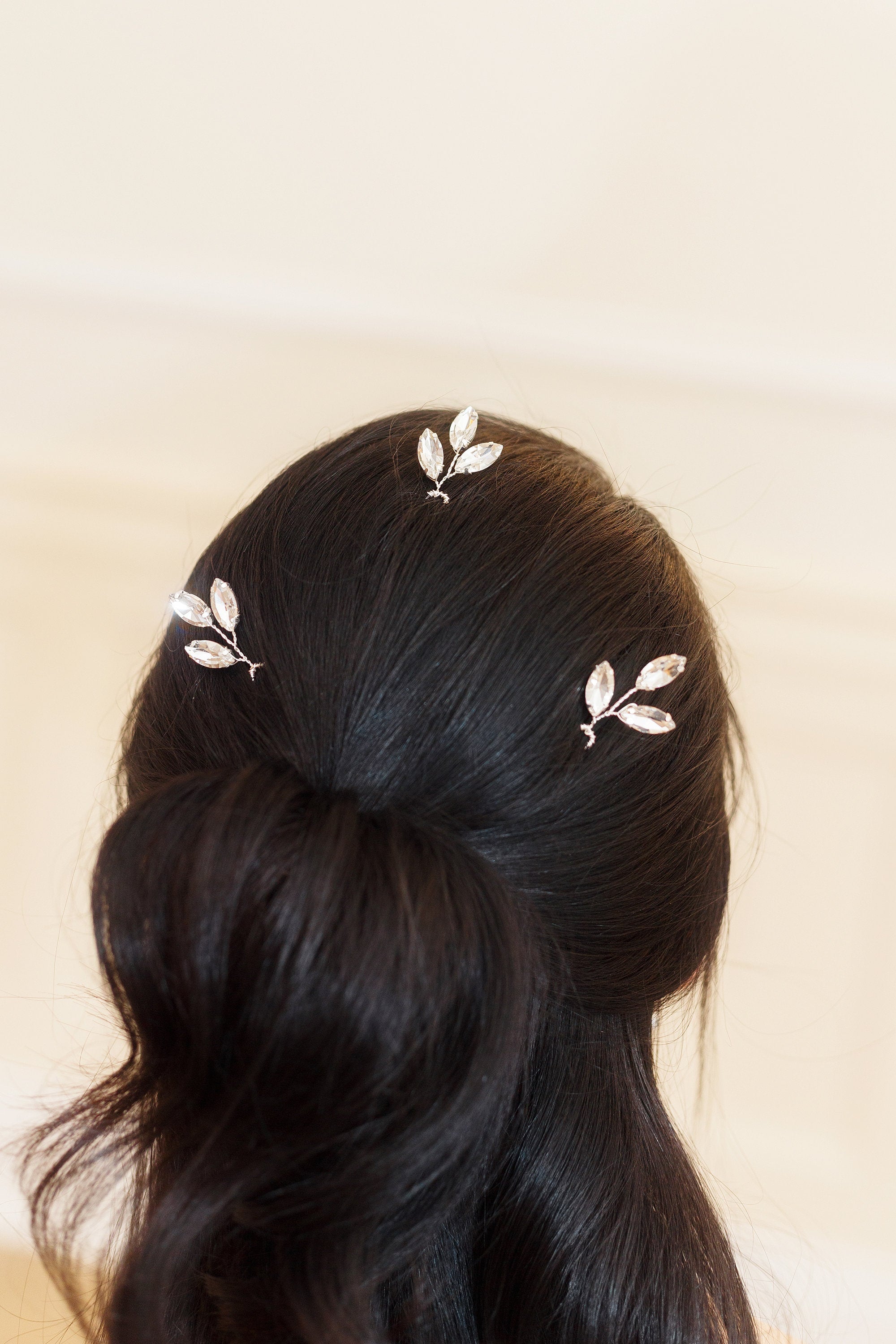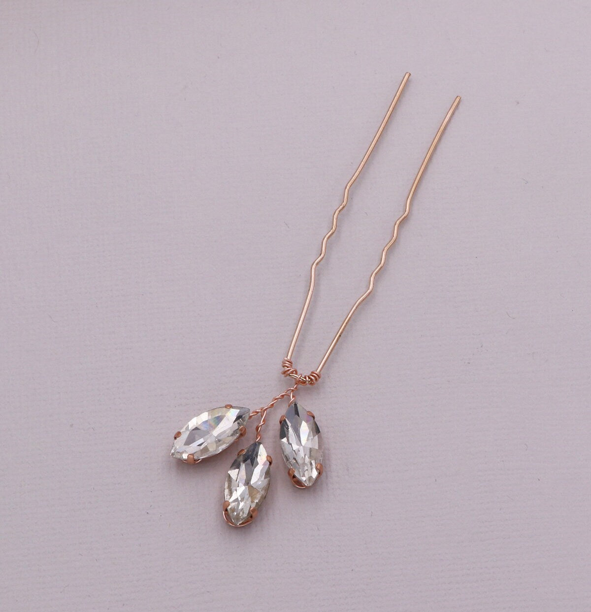 This sparkling hair pin is sure to add beauty to your special day! Features brilliant marquise rhinestones, measuring 1" tall. Wear one, or cluster a few to add brilliance to your hair! Perfect for weddings, the bride, bridesmaids, or any special occasion! Sold in sets of 3. Choose from silver, gold or rose gold finish!