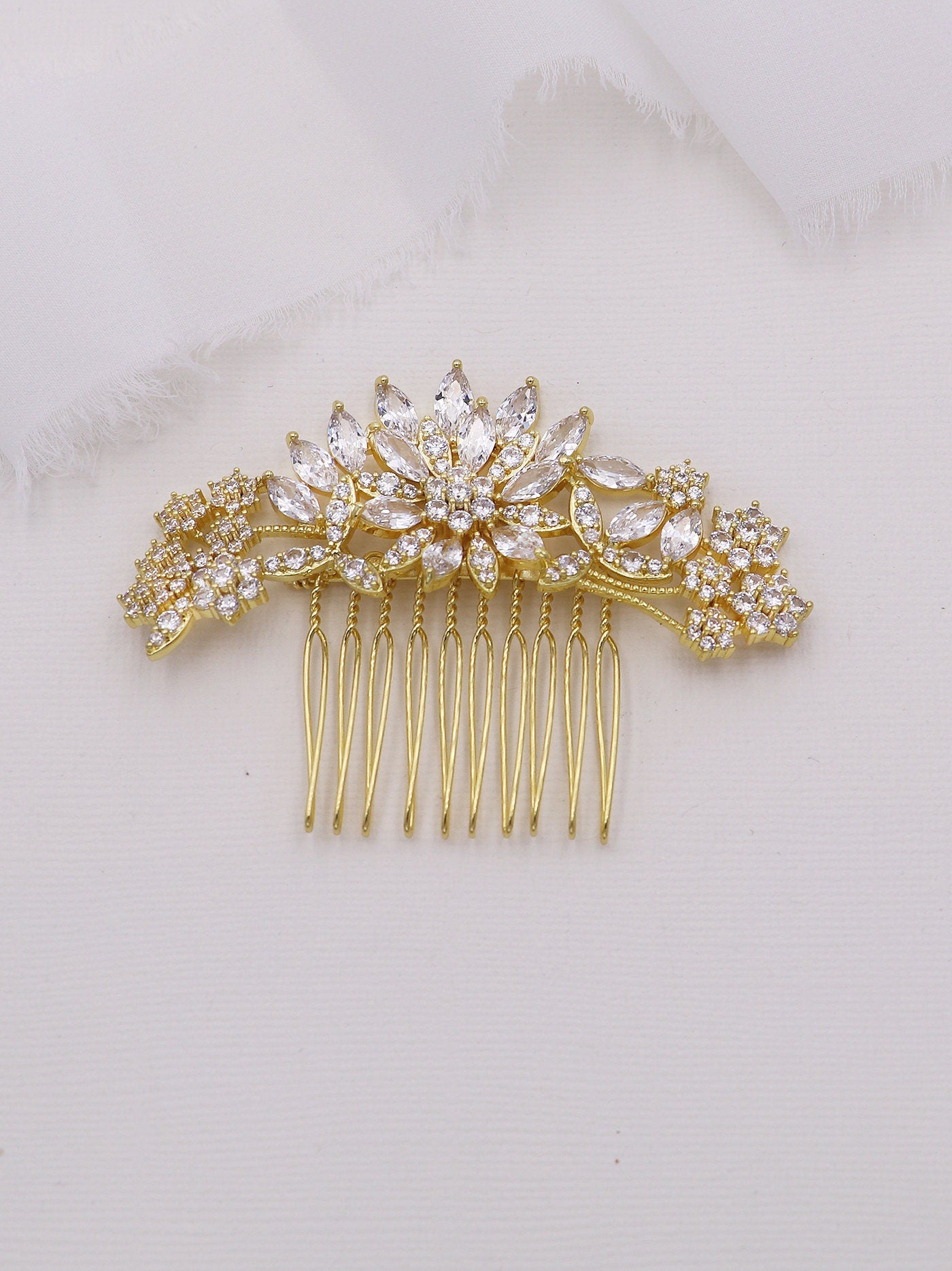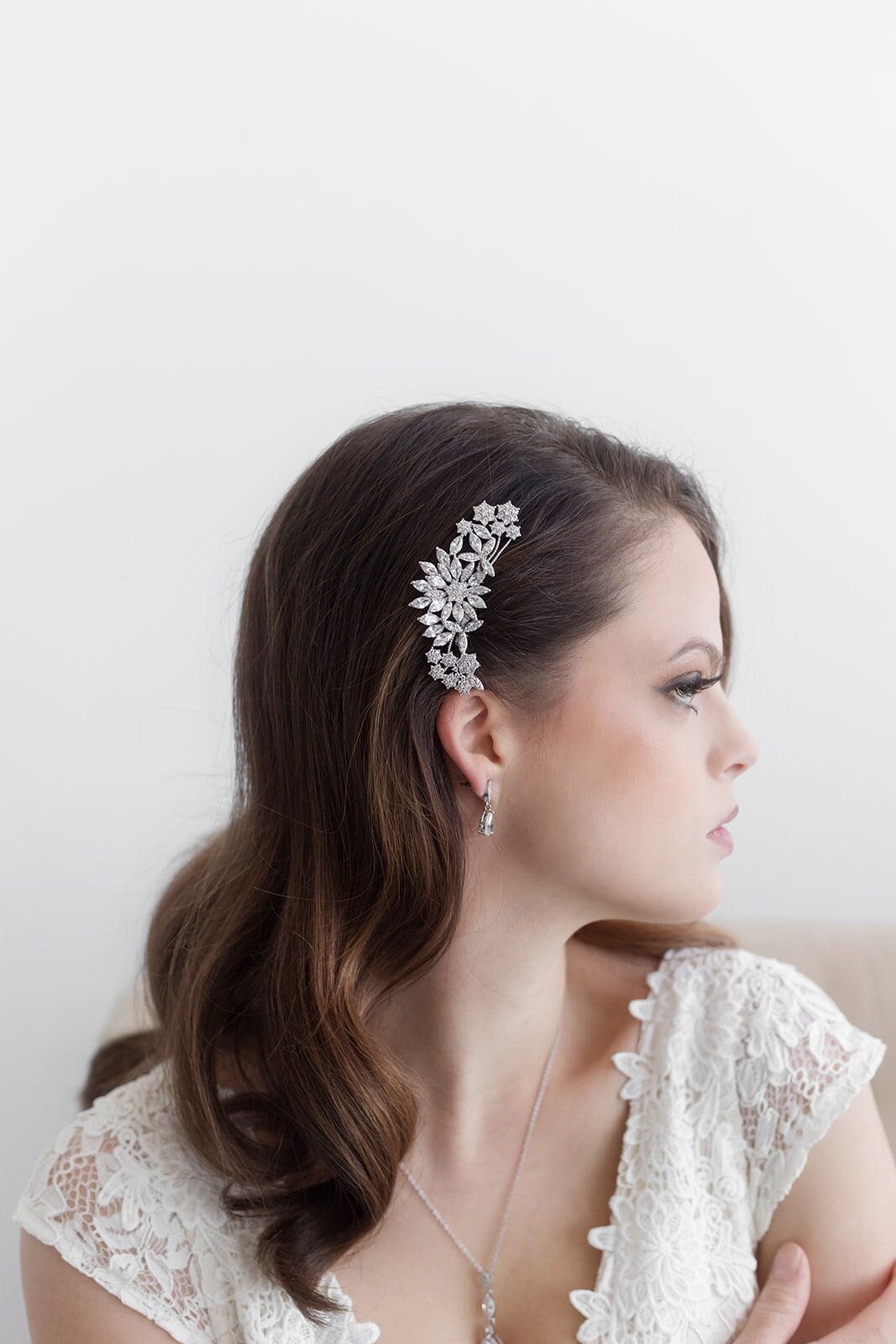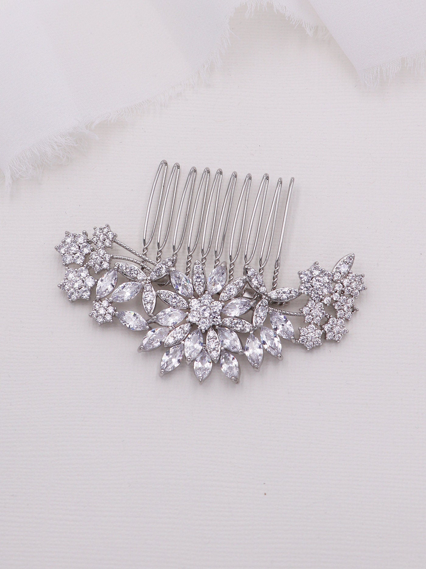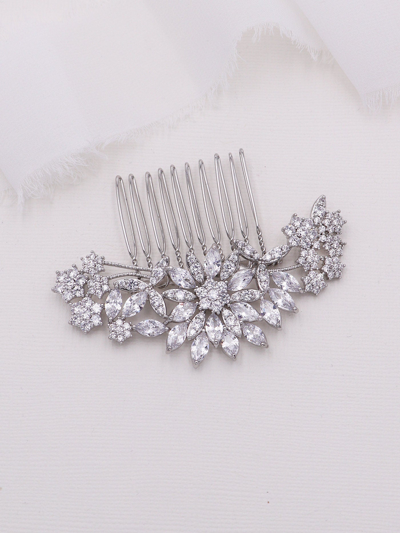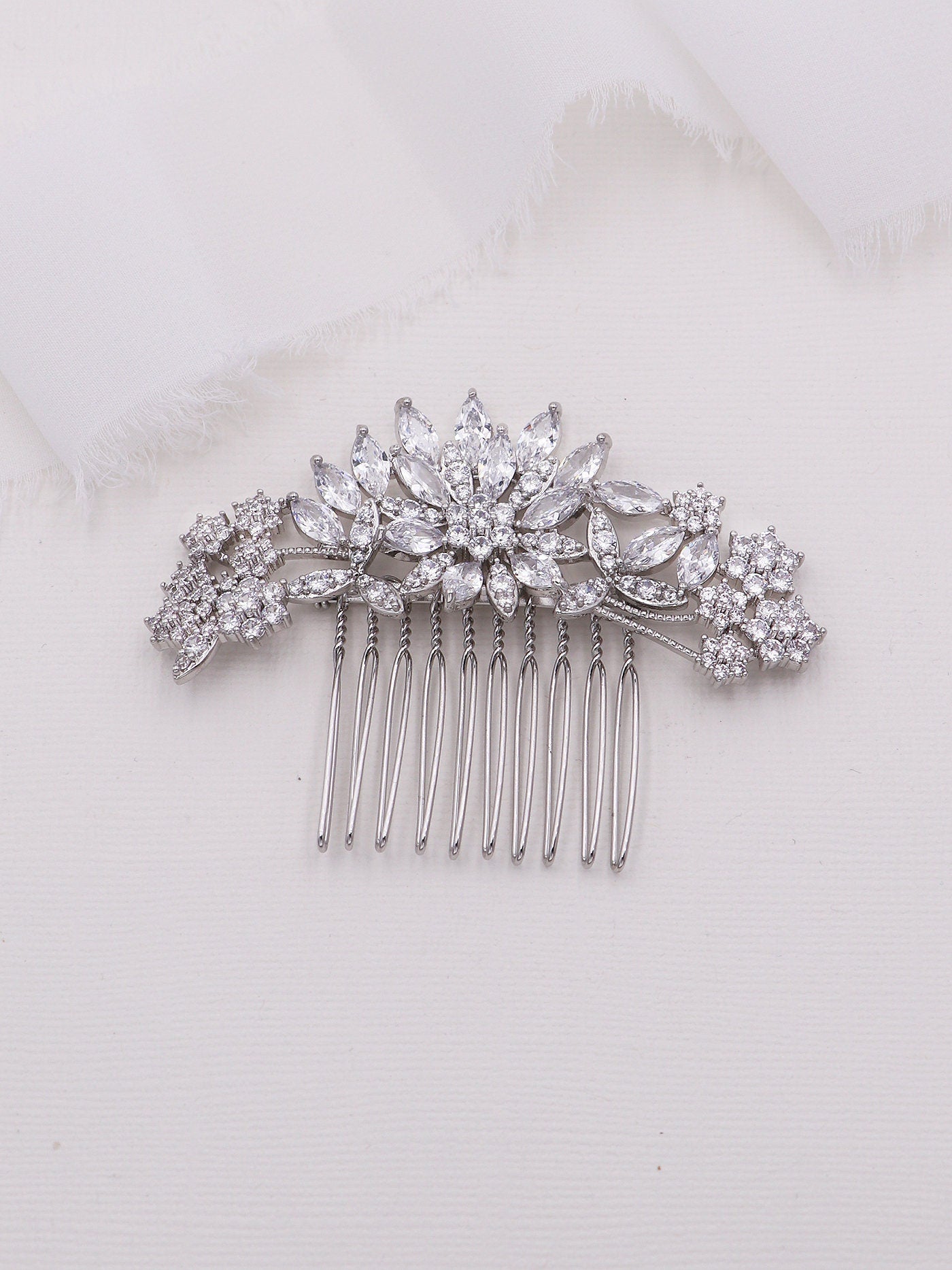 This equisite wedding hair comb features a design of high quality cubic zirconia clustered stones providing the look of diamonds in your hair! Measuring 3" wide by 1 1/4" tall, this comb gleams with sparkle! Perfect for a side accent comb or back headpiece for your wedding or special occasion. Choose from silver or gold.