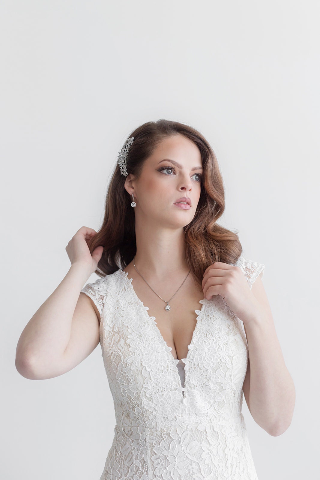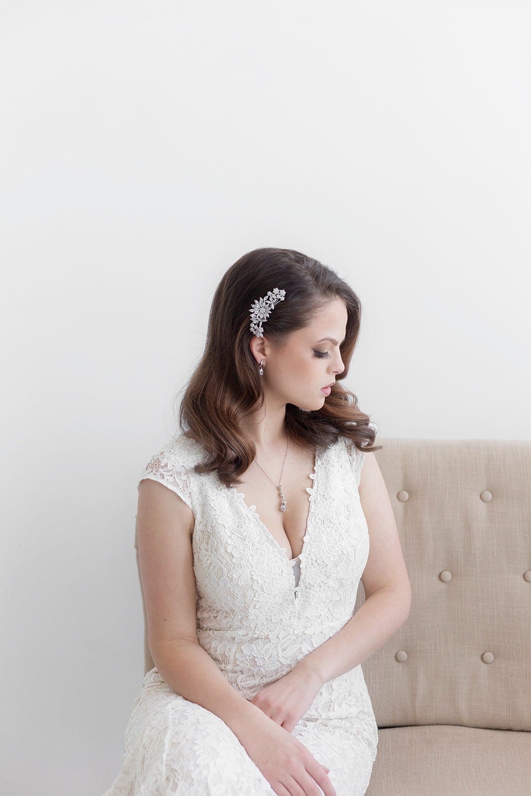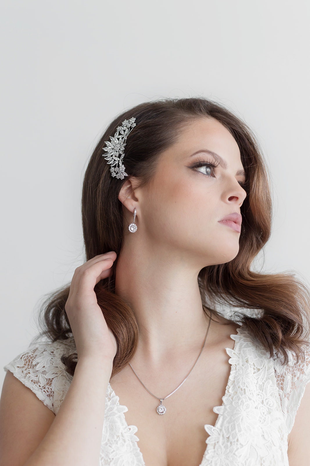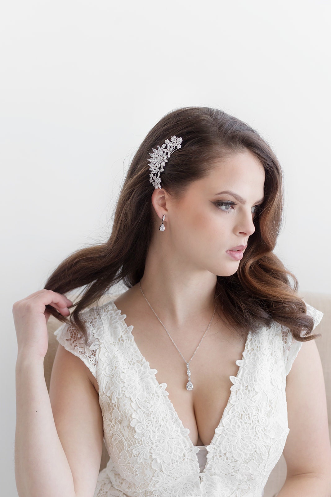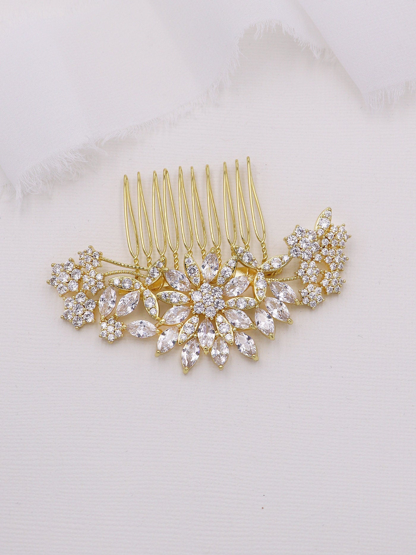This equisite wedding hair comb features a design of high quality cubic zirconia clustered stones providing the look of diamonds in your hair! Measuring 3" wide by 1 1/4" tall, this comb gleams with sparkle! Perfect for a side accent comb or back headpiece for your wedding or special occasion. Choose from silver or gold.