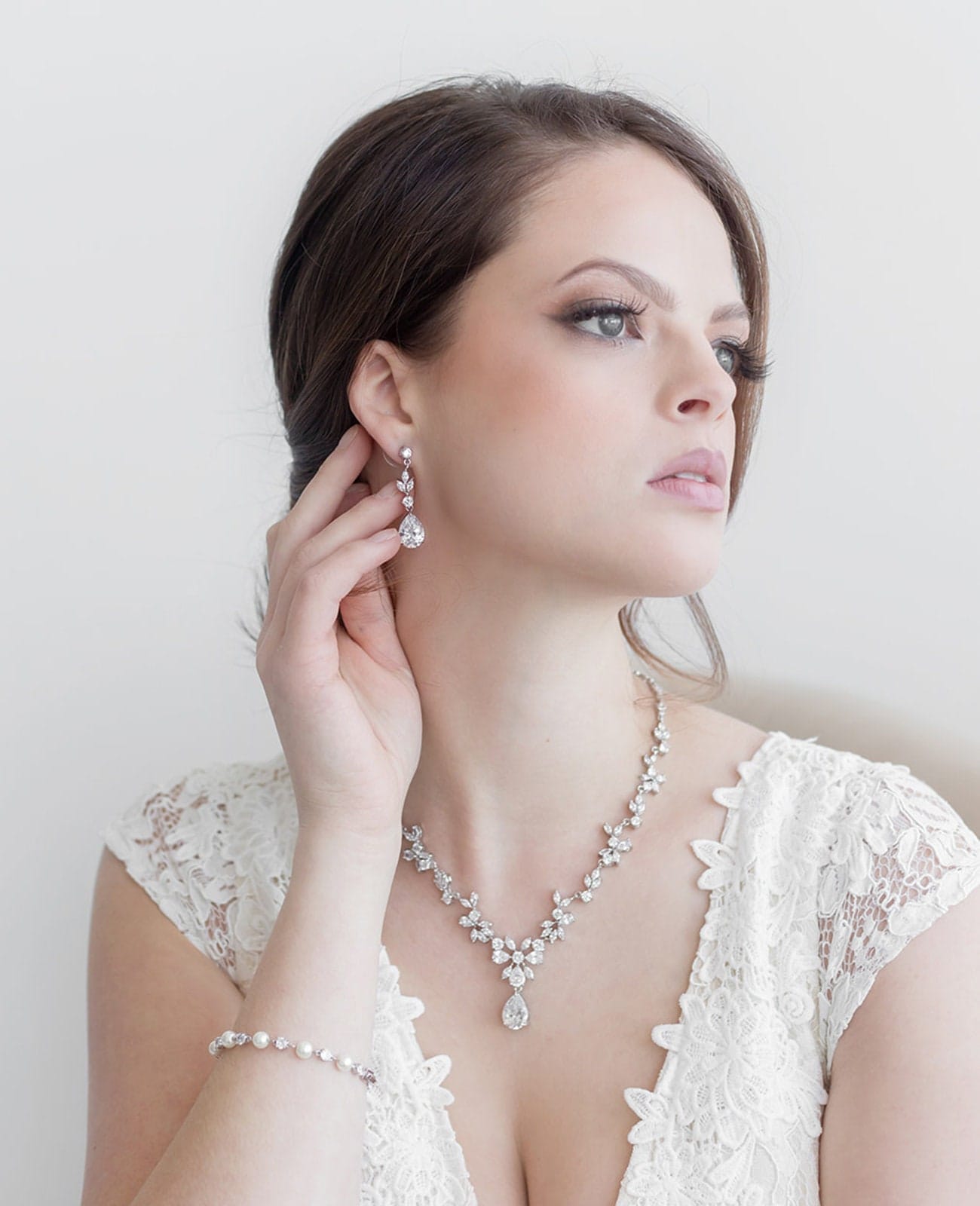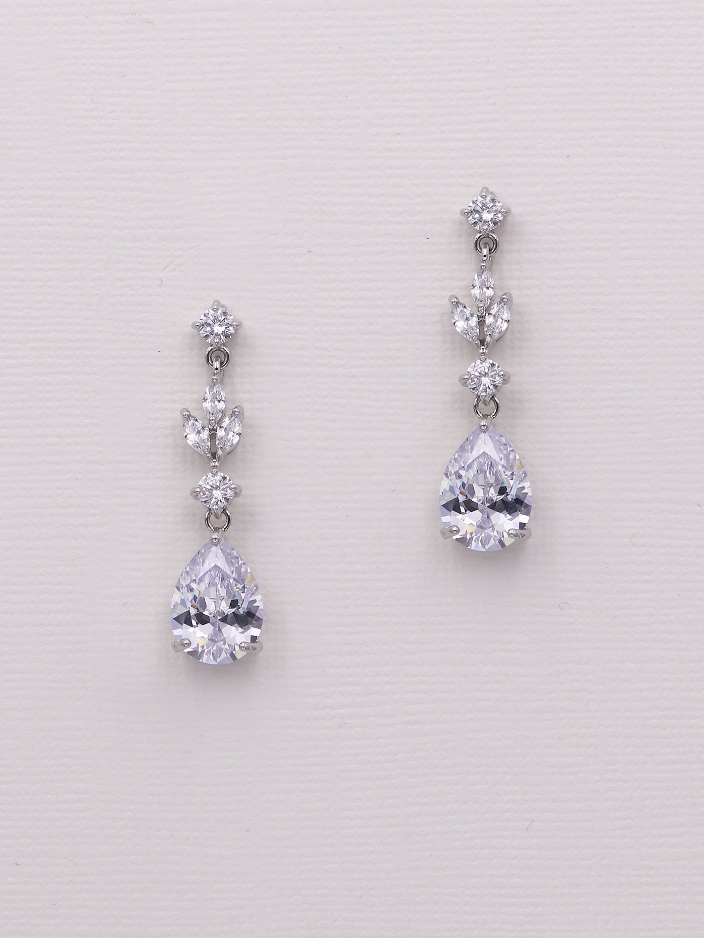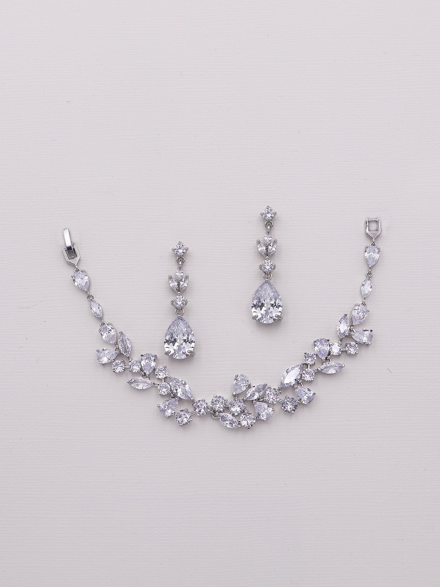 These brilliant earrings will surely add sparkle on your special day! Boasting brilliant cubic zirconia in clusters of marquise shapes and teardrops set in shiny silver. Earrings measure 1 3/4". Matching optional bracelet available measuring 7". Available in silver, gold or rose gold!