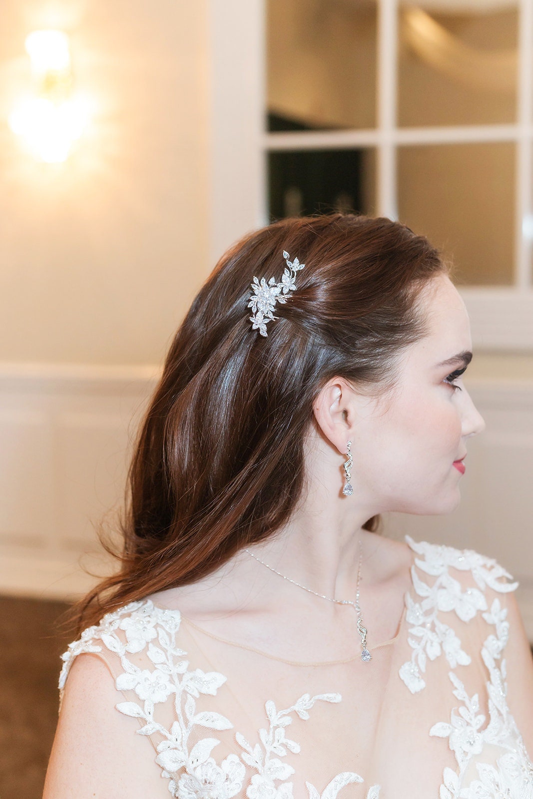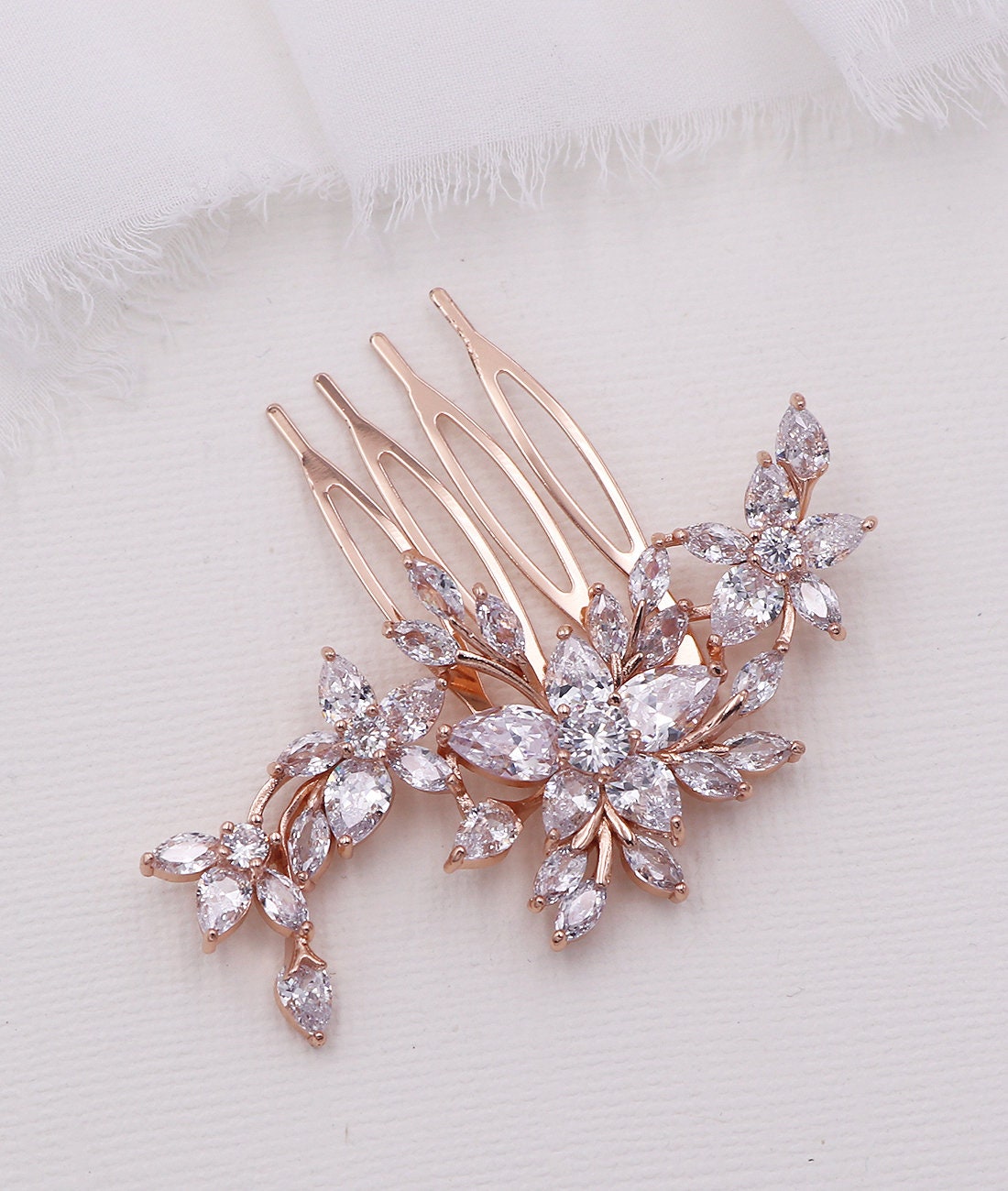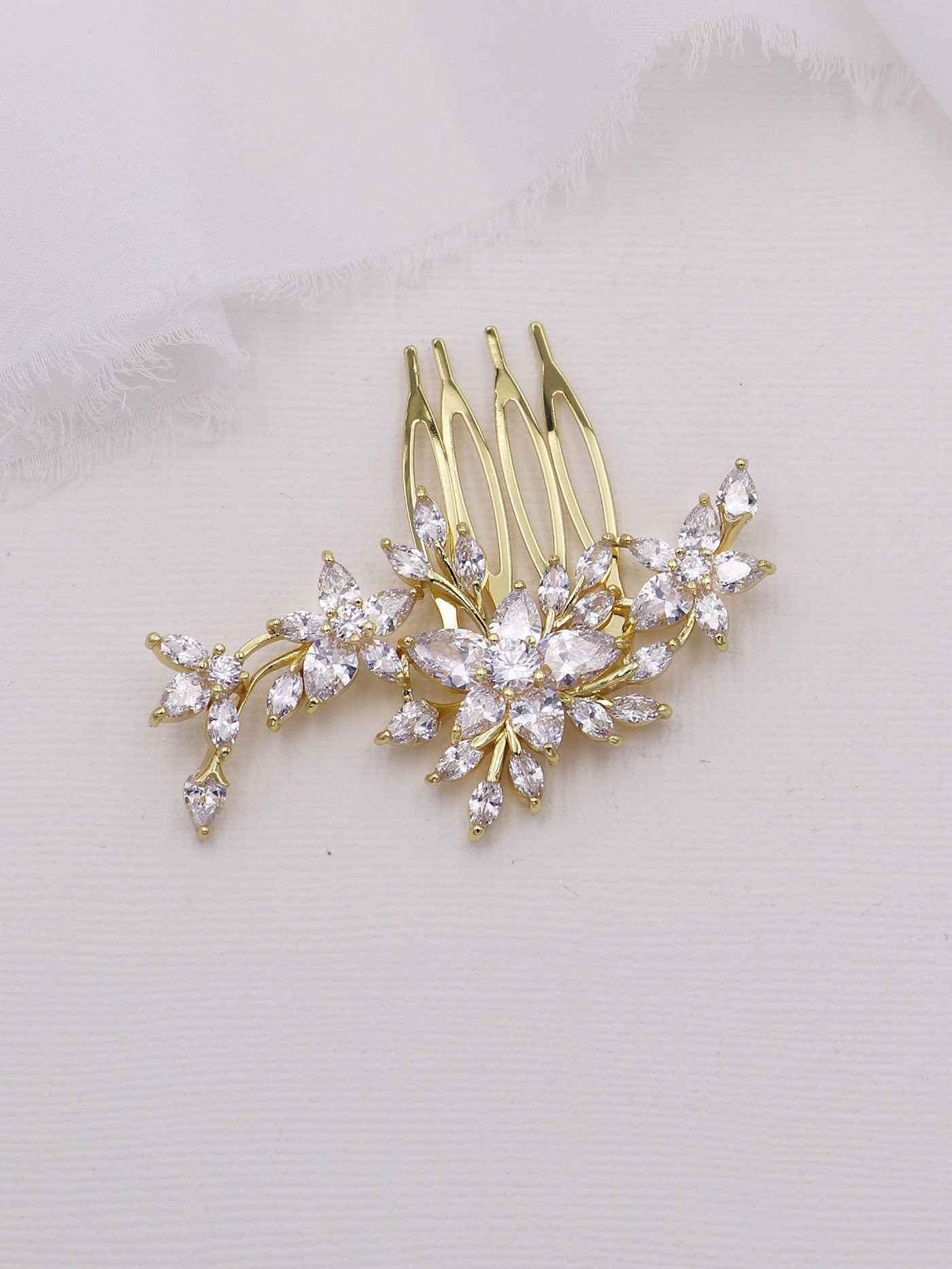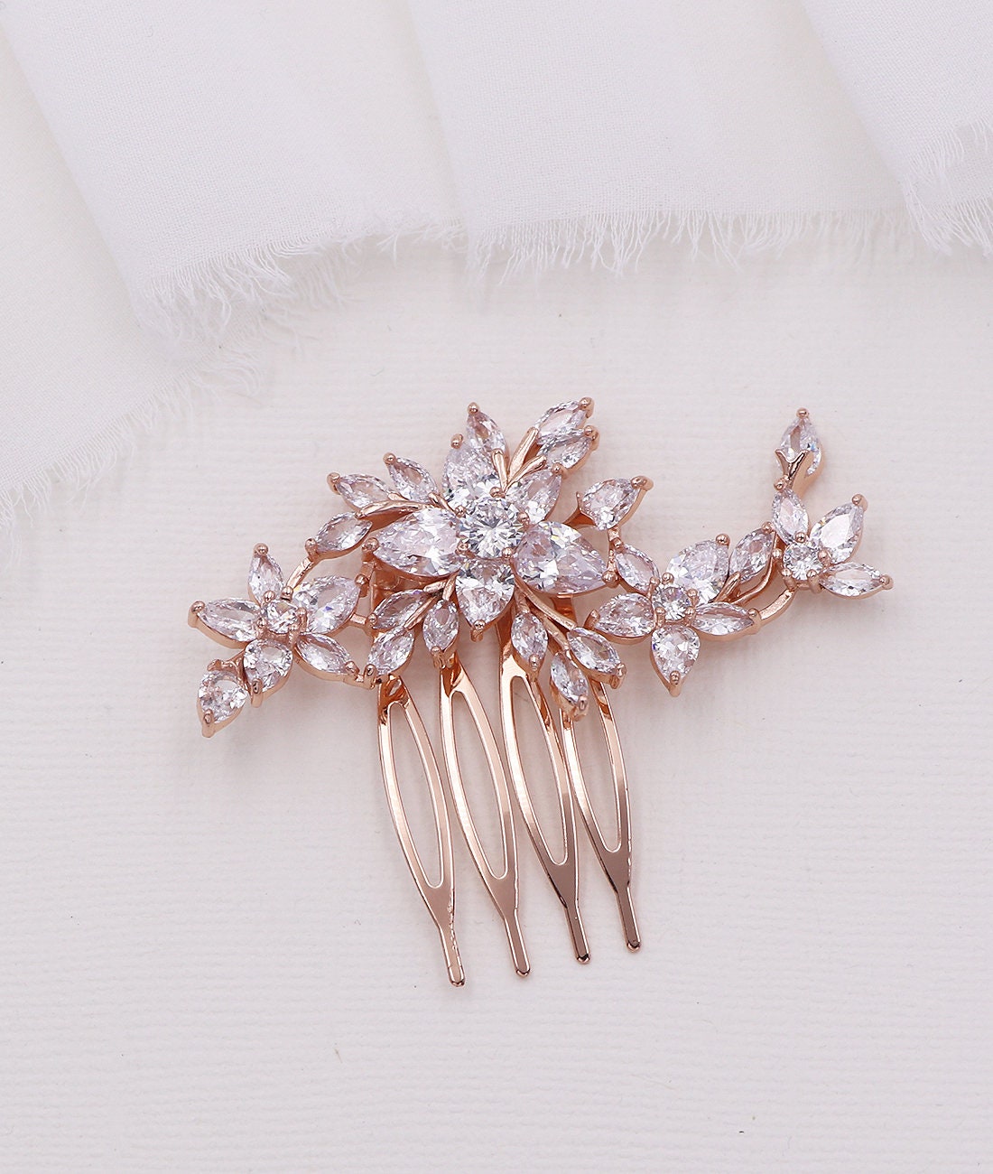 This elegantly designed hair comb features sparkling cubic zirconia stones in a floral pattern that is the perfect accessory for the bride or any special occasion event. This piece is perfect as a smaller, size comb. Measures a more petite size at 2 1/2" wide and 1 1/4" tall. Choose from gold or rose gold.