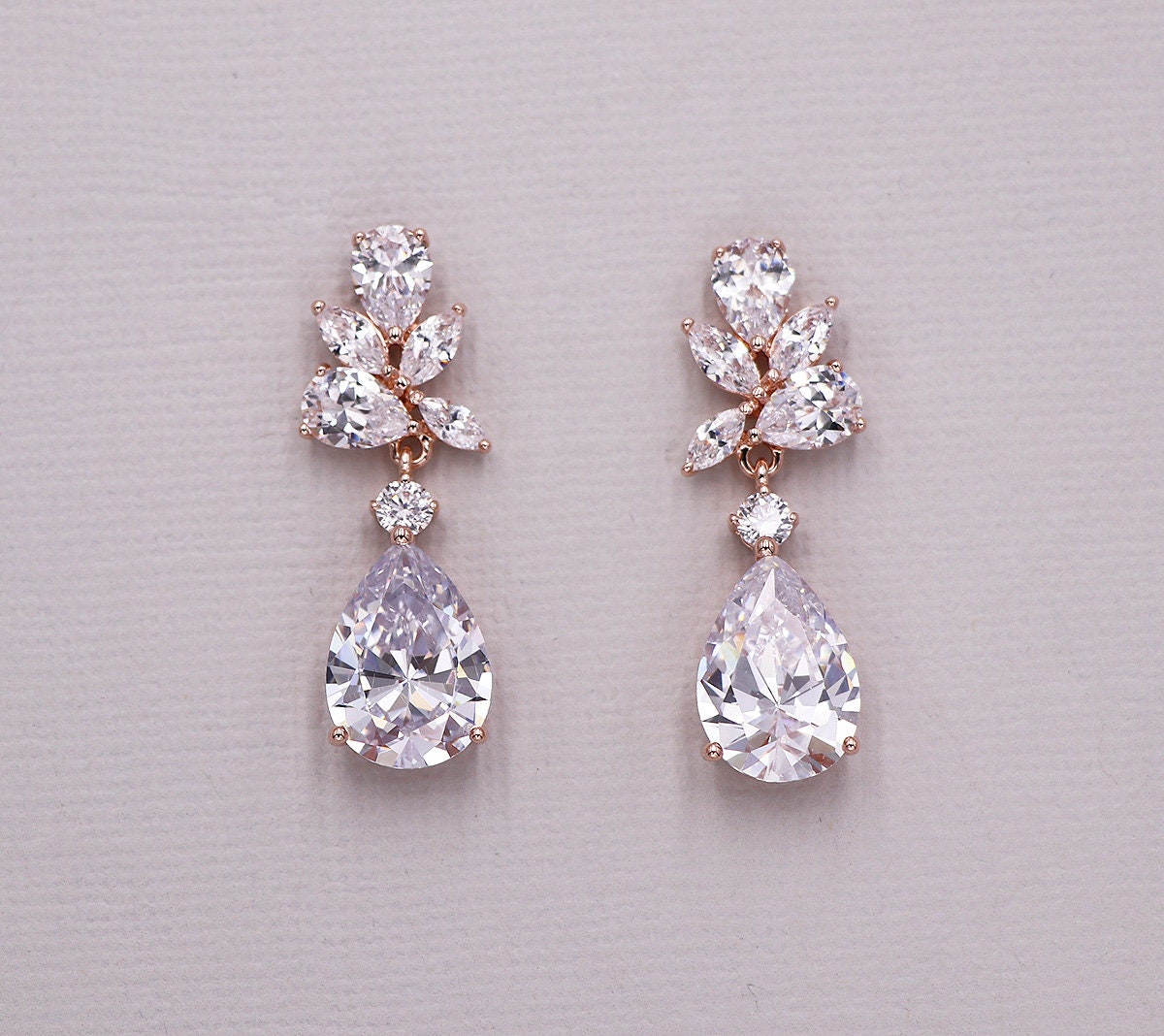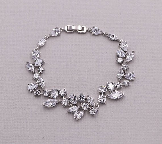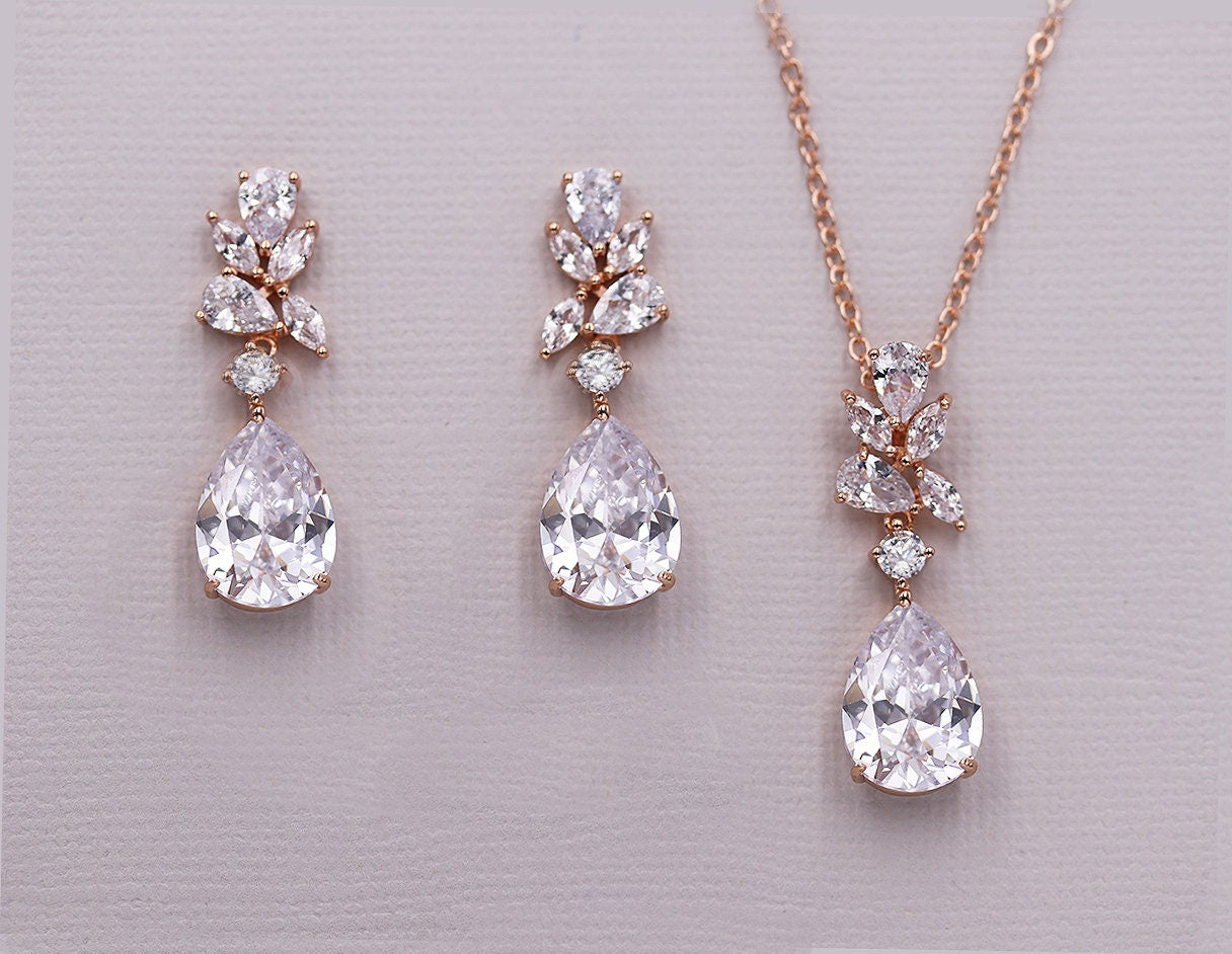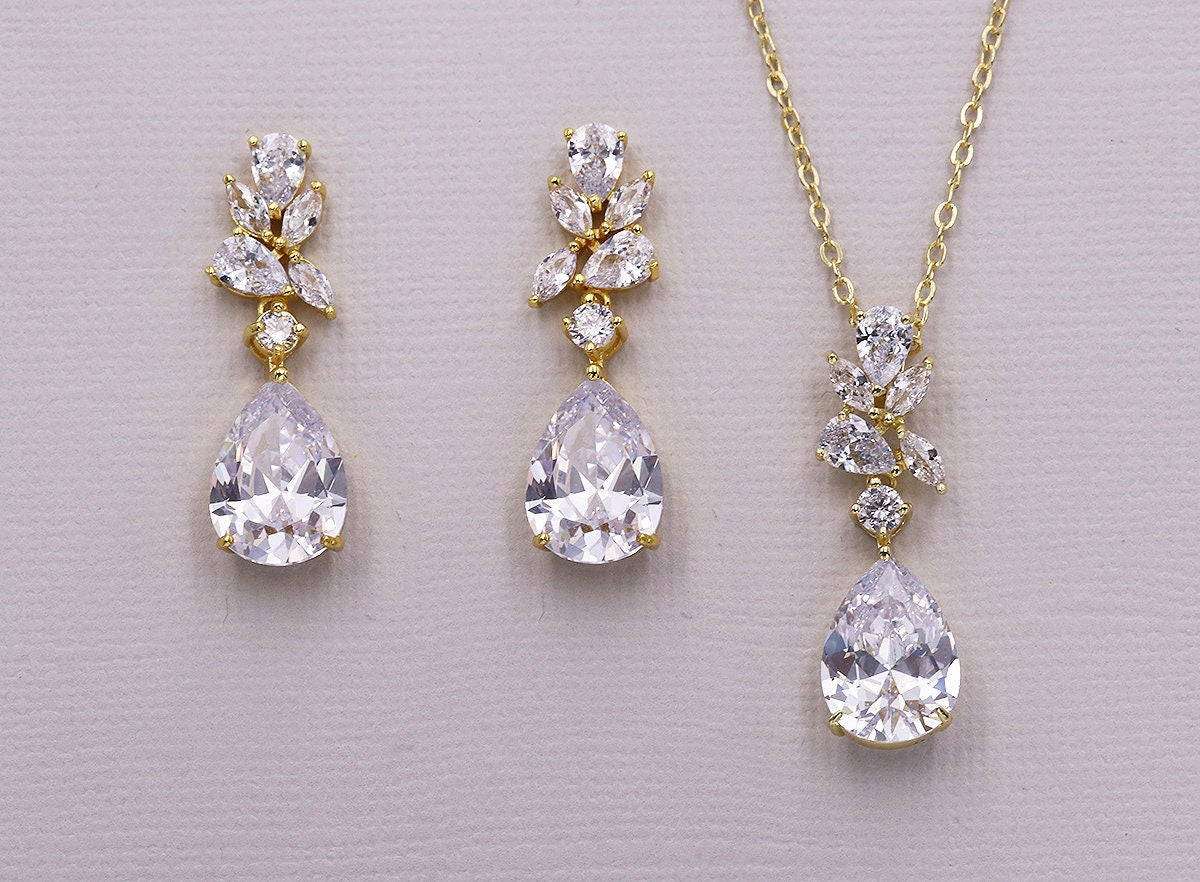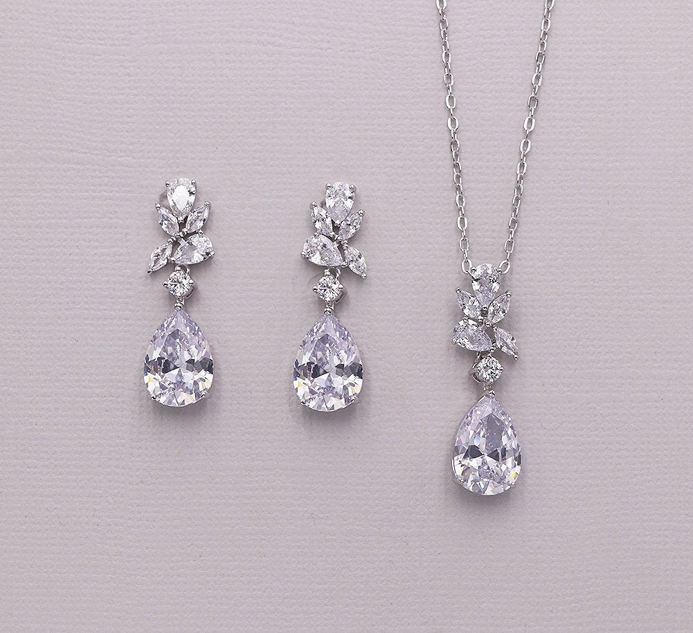 This perfectly paired earrings and necklace set features exquisitely crafted bracelet and earrings set boasts AAA grade cubic zirconia stones in multiple shapes of round, marquise and pear cuts. Earrings measure 1 1/4" is are perfect for the bride, weddings, parties, prom or any special occasion! Matching necklace measures 16" and is adjustable up to 18" long. Matching coordinating bracelet (optional) is available and measures 7" long. Choose from silver, gold or rose gold!