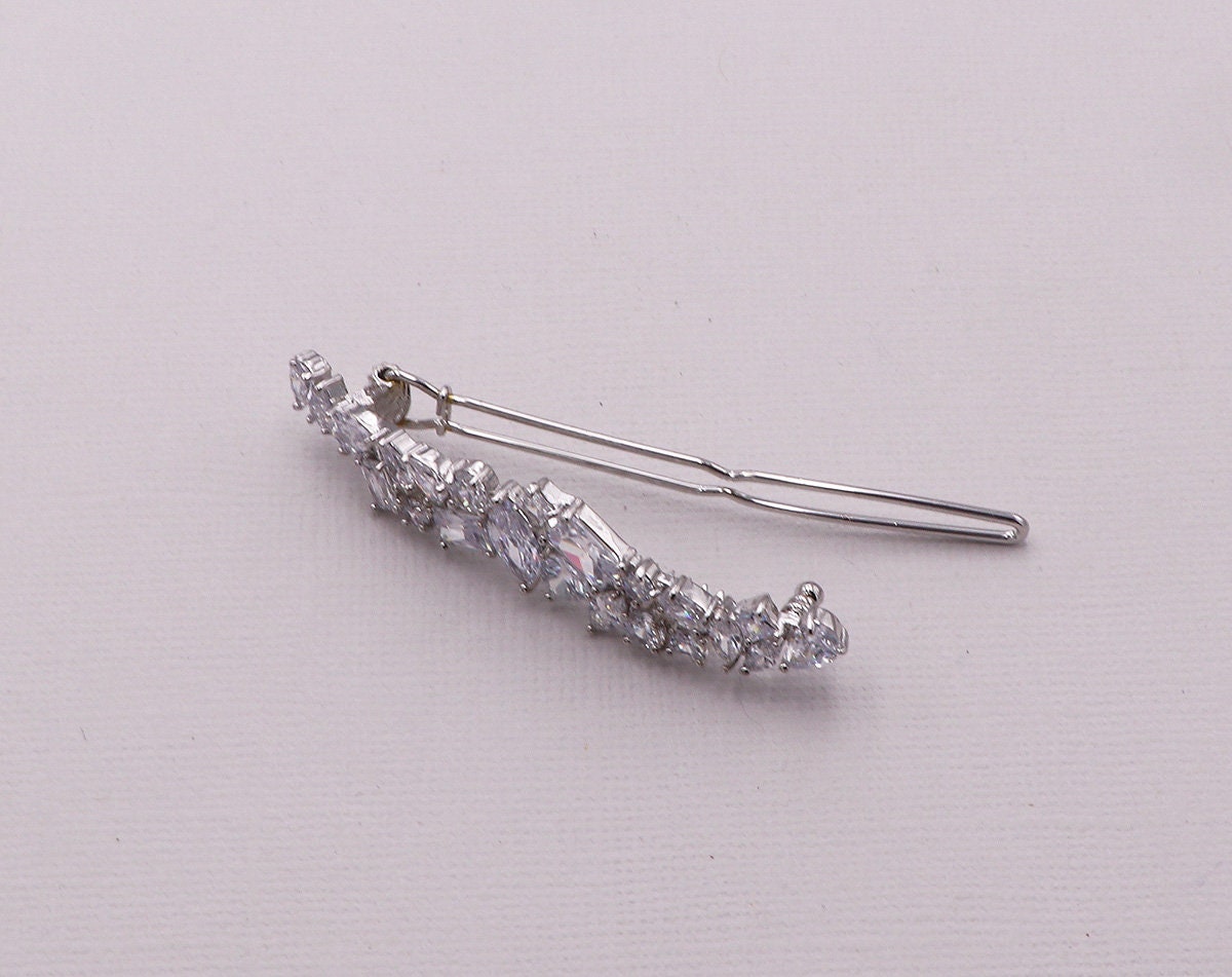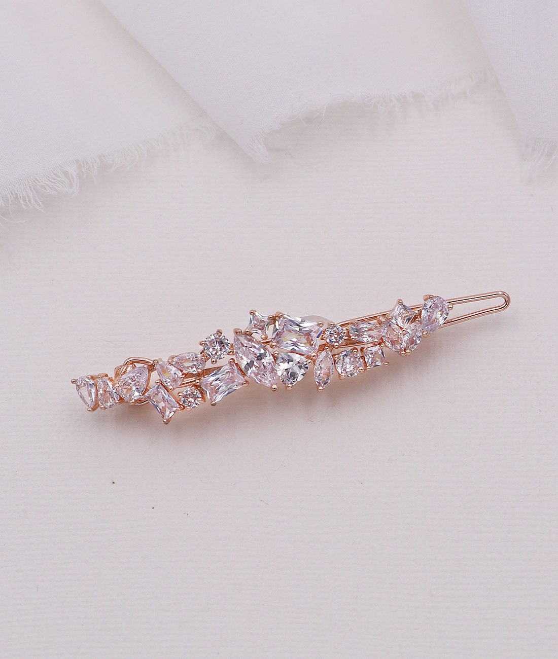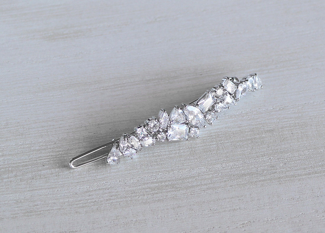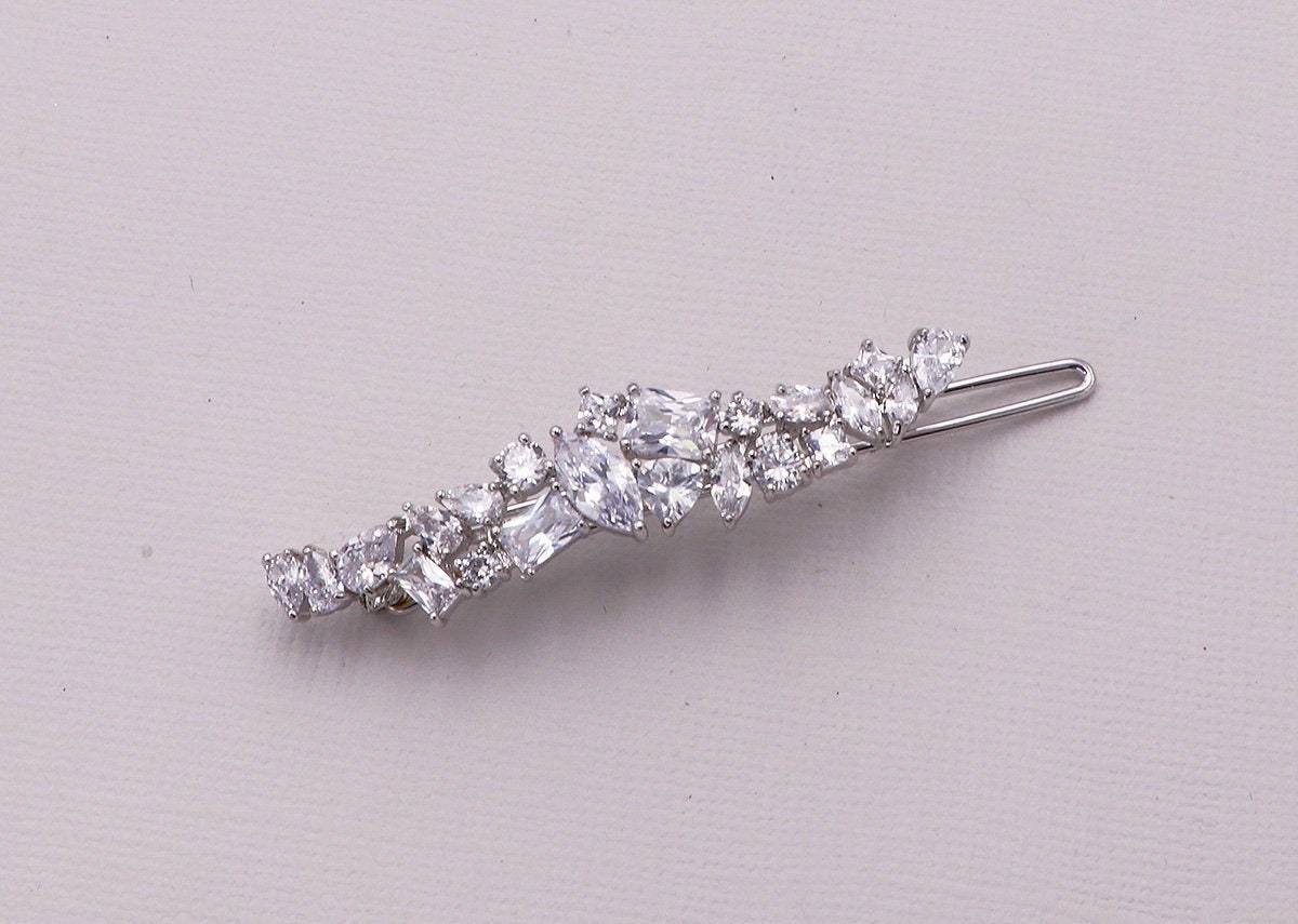 This uniquely designed barrette features a mosaic pattern of faceted cubic zirconia stones for the look of fine jewelry in your hair. This piece is perfect as a side or back clip accessory. Measures a more petite size at 2 1/4" wide and 3/8" tall and has a clip on the back to securely place into your hair. The exquisite barrette was designed with the sparkle of rhinestones and the diamond-like brilliance of the cubic zirconia. This clip would be perfect for the bride, prom, or any special occasion! Now available in silver, gold or rose gold!