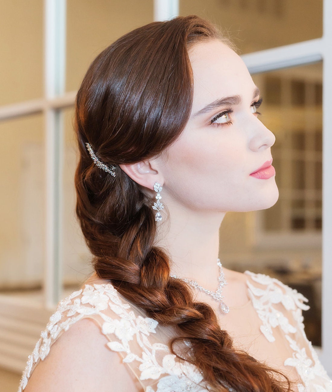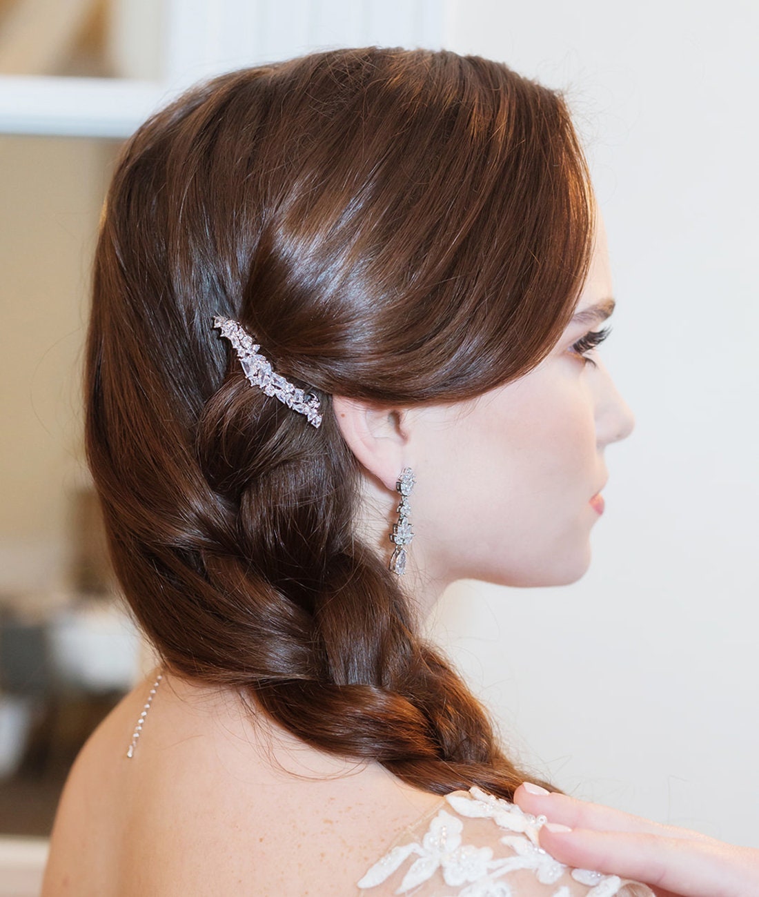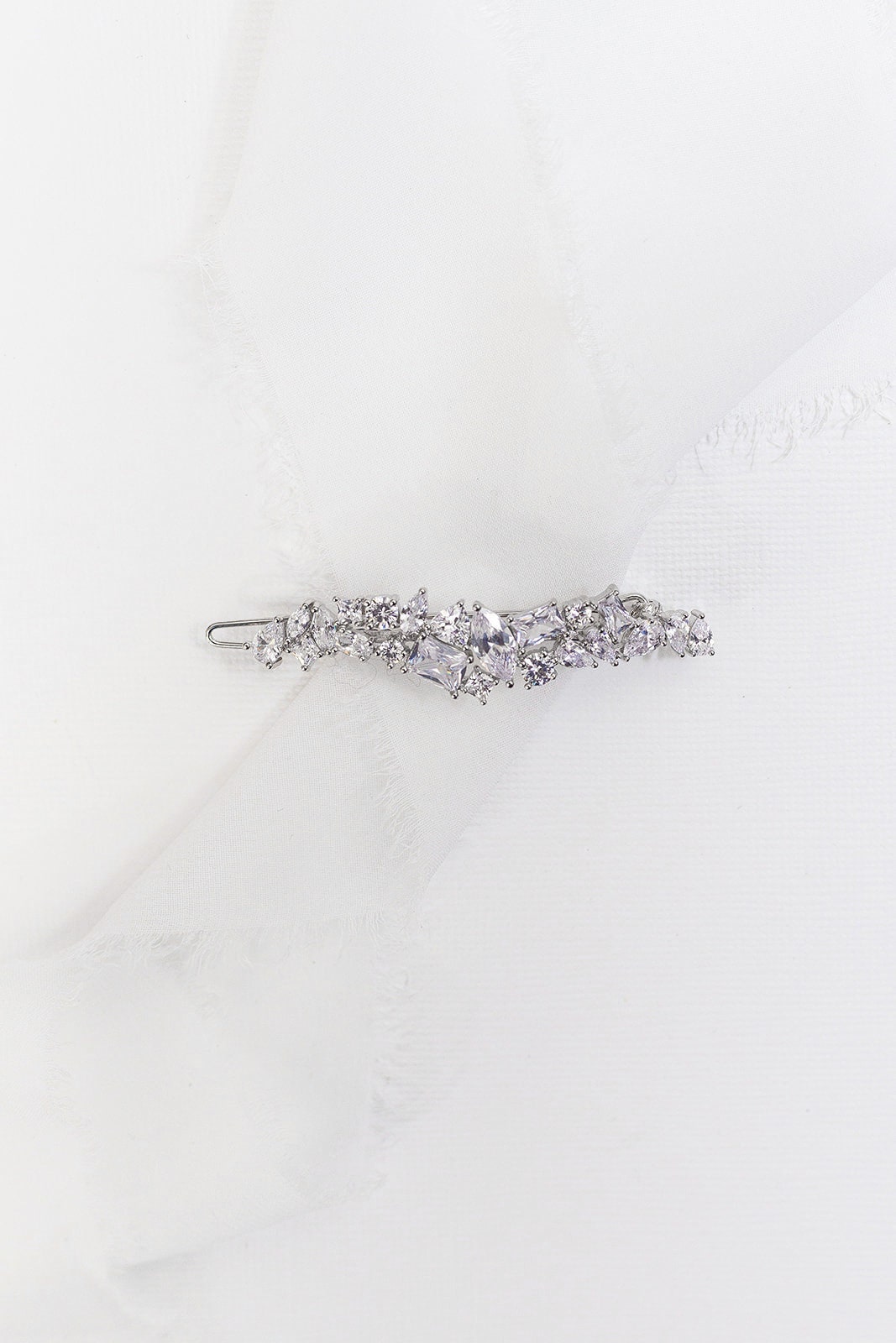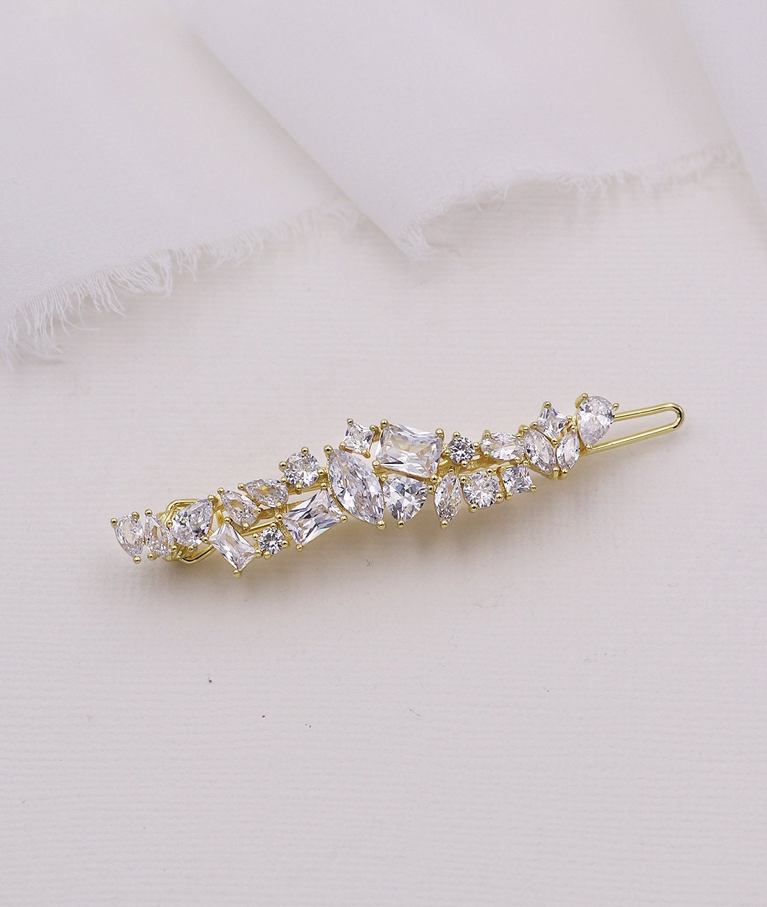 This uniquely designed barrette features a mosaic pattern of faceted cubic zirconia stones for the look of fine jewelry in your hair. This piece is perfect as a side or back clip accessory. Measures a more petite size at 2 1/4" wide and 3/8" tall and has a clip on the back to securely place into your hair. The exquisite barrette was designed with the sparkle of rhinestones and the diamond-like brilliance of the cubic zirconia. This clip would be perfect for the bride, prom, or any special occasion! Now available in silver, gold or rose gold!