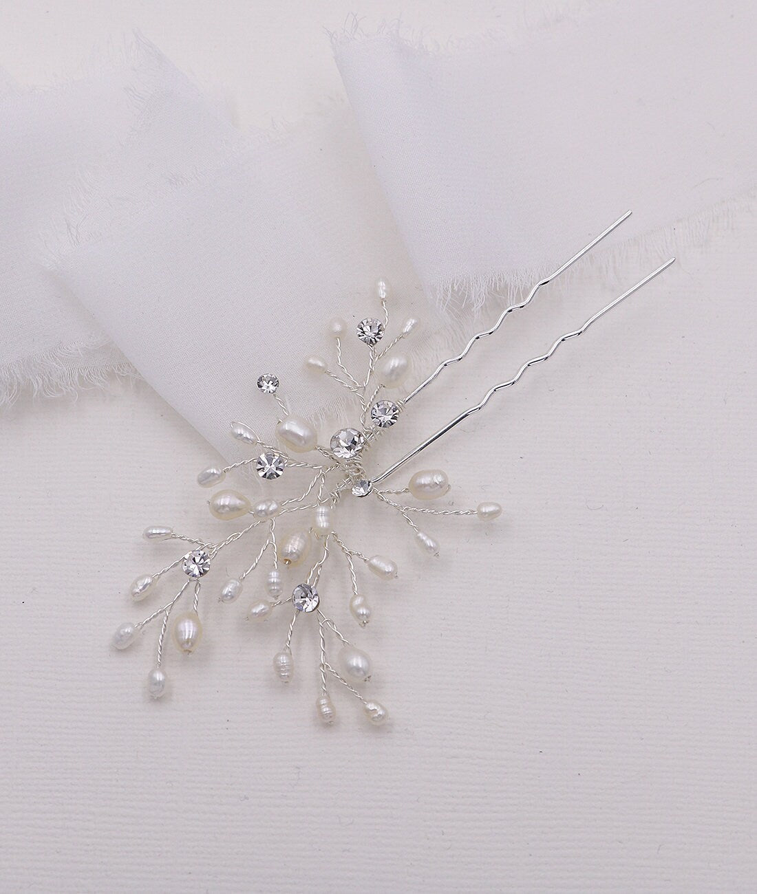 This delicate handmade hair pin is sure to add an organic look and luster to your special day! Features brilliant round rhinestones and lustrous, natural light ivory rice pearls with flexible branches, measuring 2 1/2" tall by 2" wide. This hairpin in handwired silver colored wire, making the branches flexible to be moved to your liking.