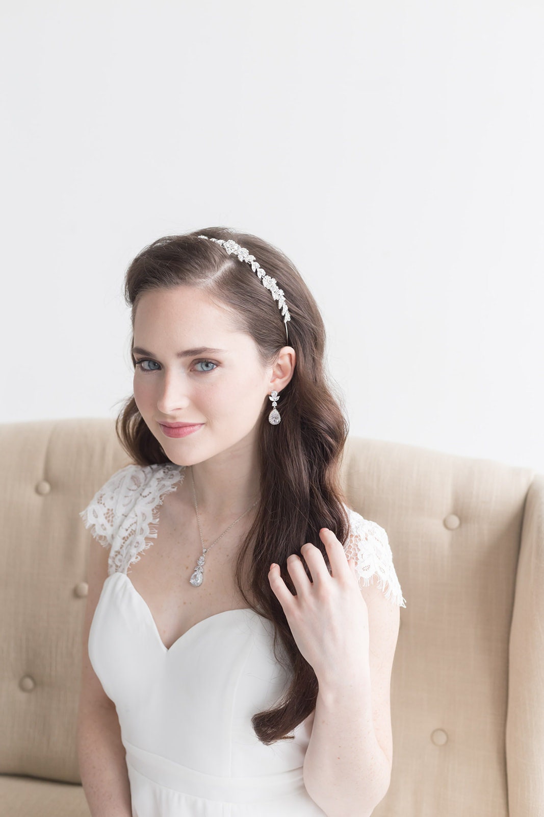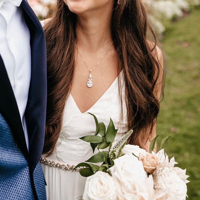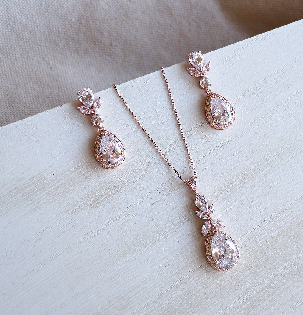 This elegantly designed earrings and necklace wedding jewelry set for brides feature cuts of AAA grade cubic zirconia in round, marquise and pear that dangle with lots of sparkle. Measuring 1 1/2", these brilliant earrings are perfect for a wedding, bridesmaids, prom or any special occasion. Choose from silver, gold or rose gold finish. Matching pendant measures 16" and is adjustable up to 18" long, optional bracelet measures 7".