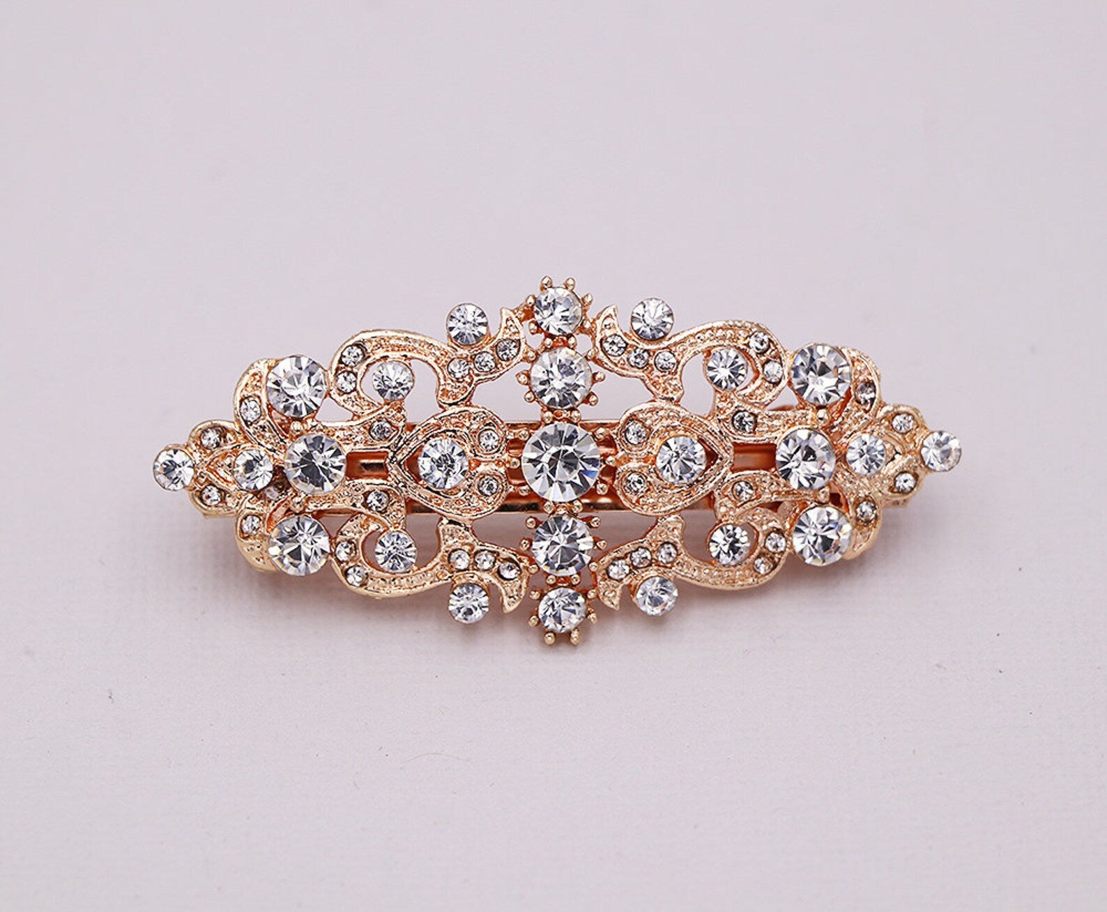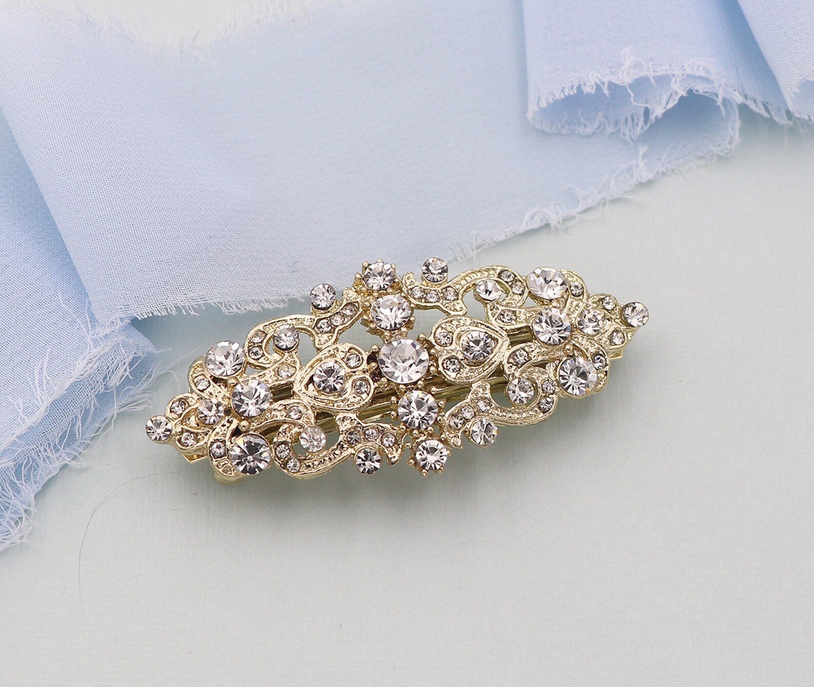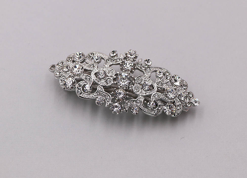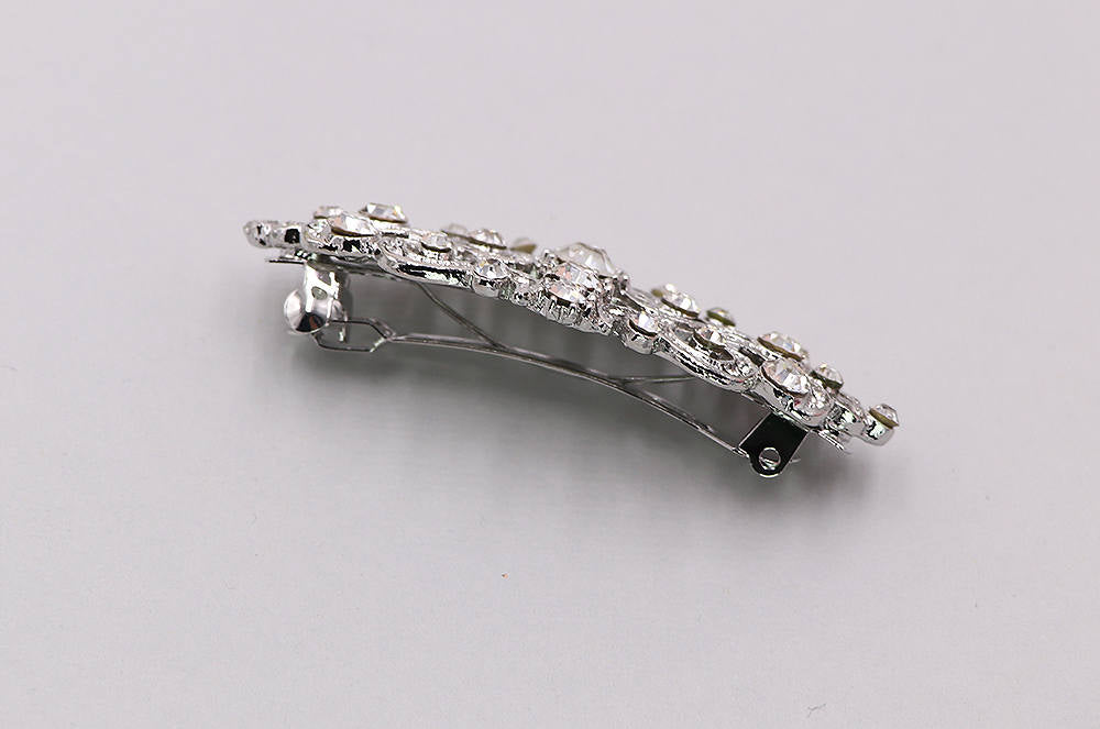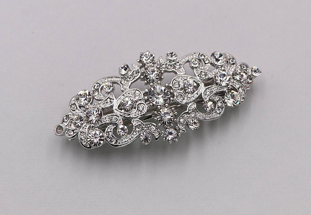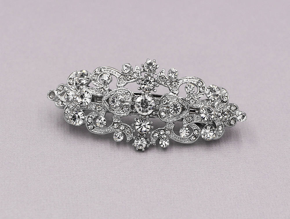 This exquisite vintage designed barrette features sparkling rhinestones set in brilliant rhodium silver that is the perfect accessory for the bride or any special occasion event. This piece is perfect as a side or back clip accessory. Measures a more petite size at 2 1/4" wide and 1" tall and has a clip on the back to securely place into your hair. Available in silver, gold or rose gold.