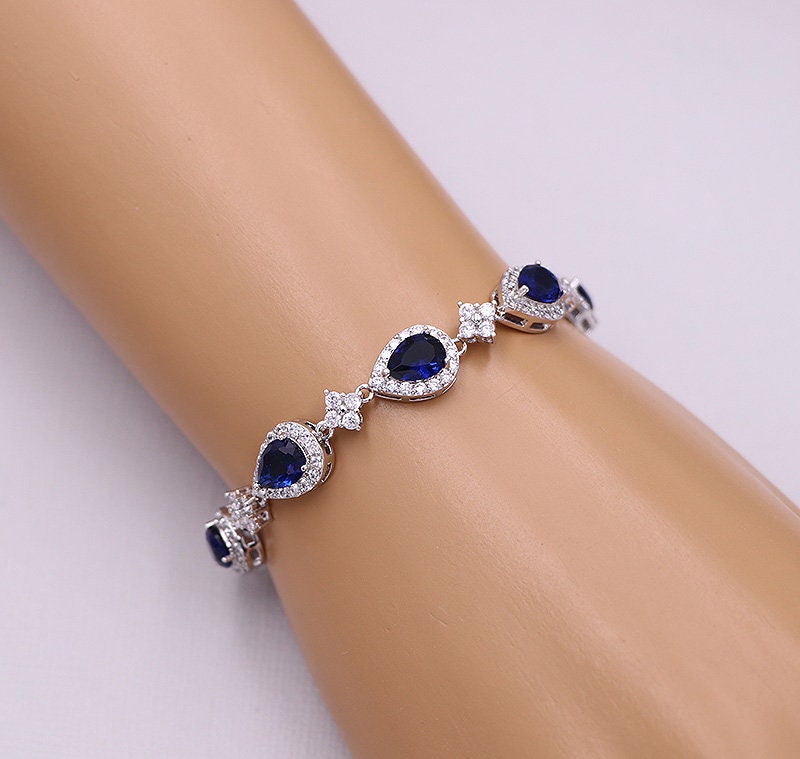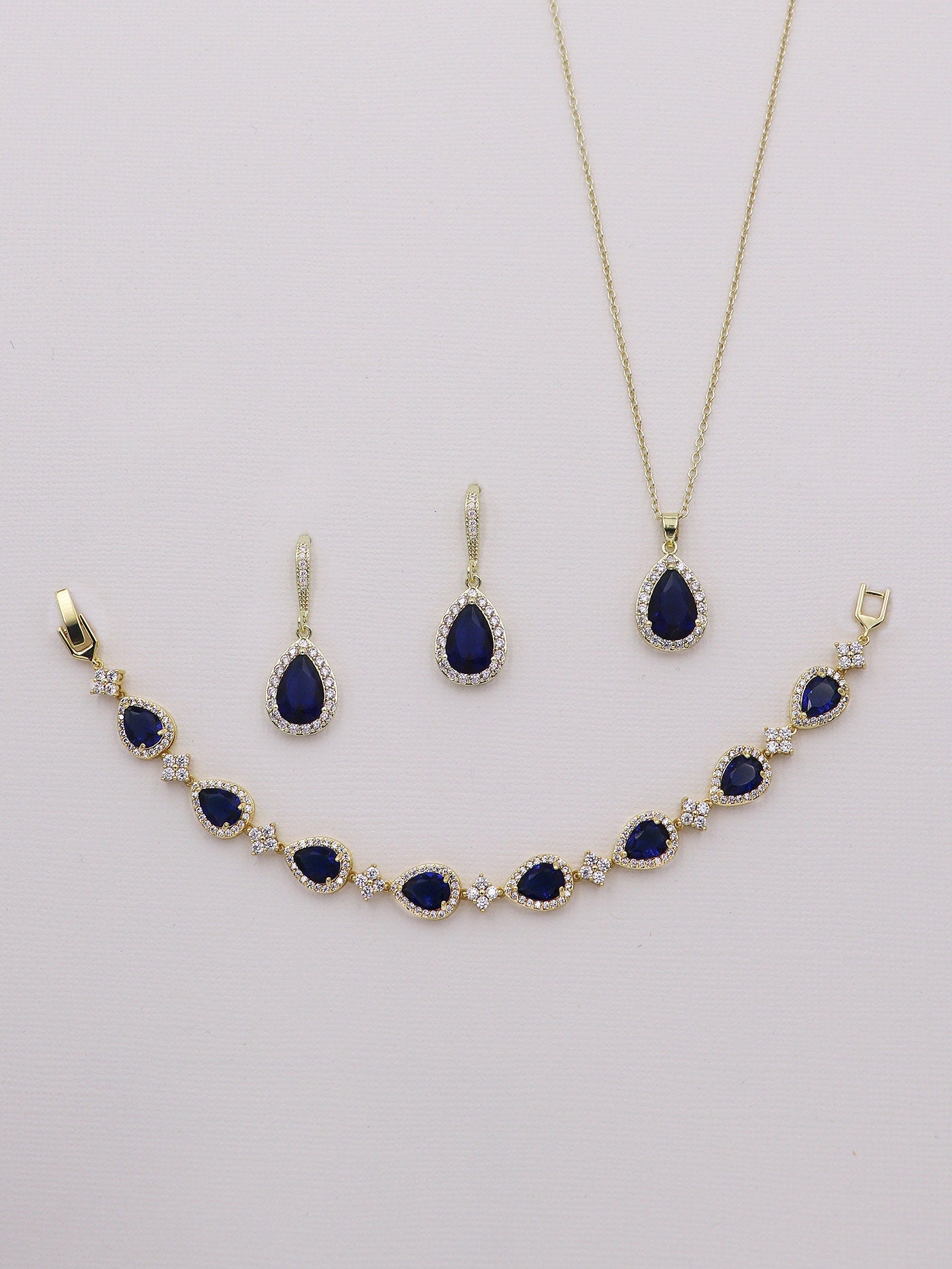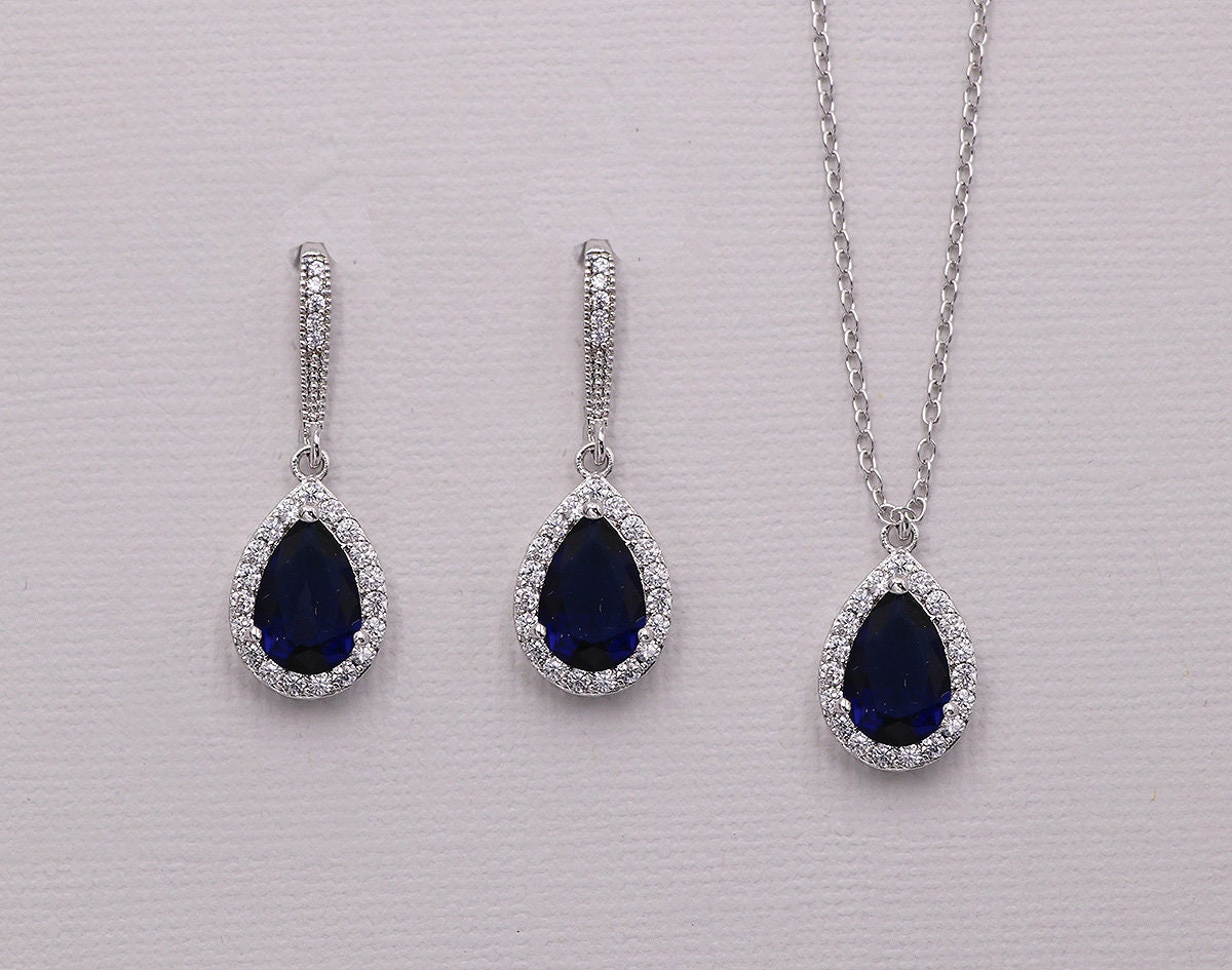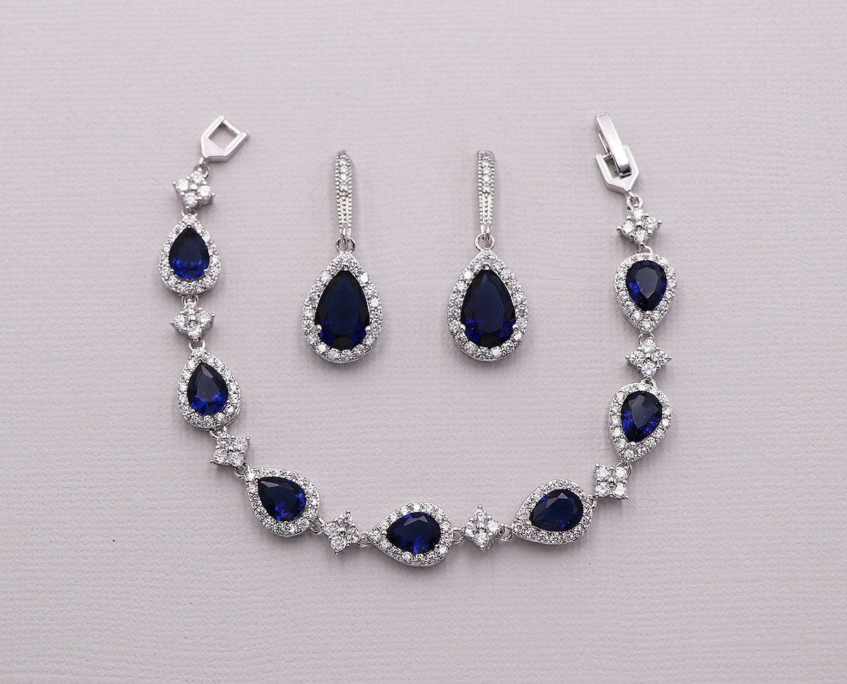 These classically designed rose gold earrings and necklace set features a framed sapphire blue cubic zirconia teardrop dangling from a CZ encrusted French hooks. Measuring 1 1/2", these brilliant earrings are perfect for the bride who wants a sparkling and classic style earring. Matching pendant necklace measuring 16"-18" (adjustable). This jewelry set is also perfect for the bridesmaids, parties, or any special occasion! Choose from optional and gorgeous bracelet measuring 7". Available in silver, gold or rose gold.