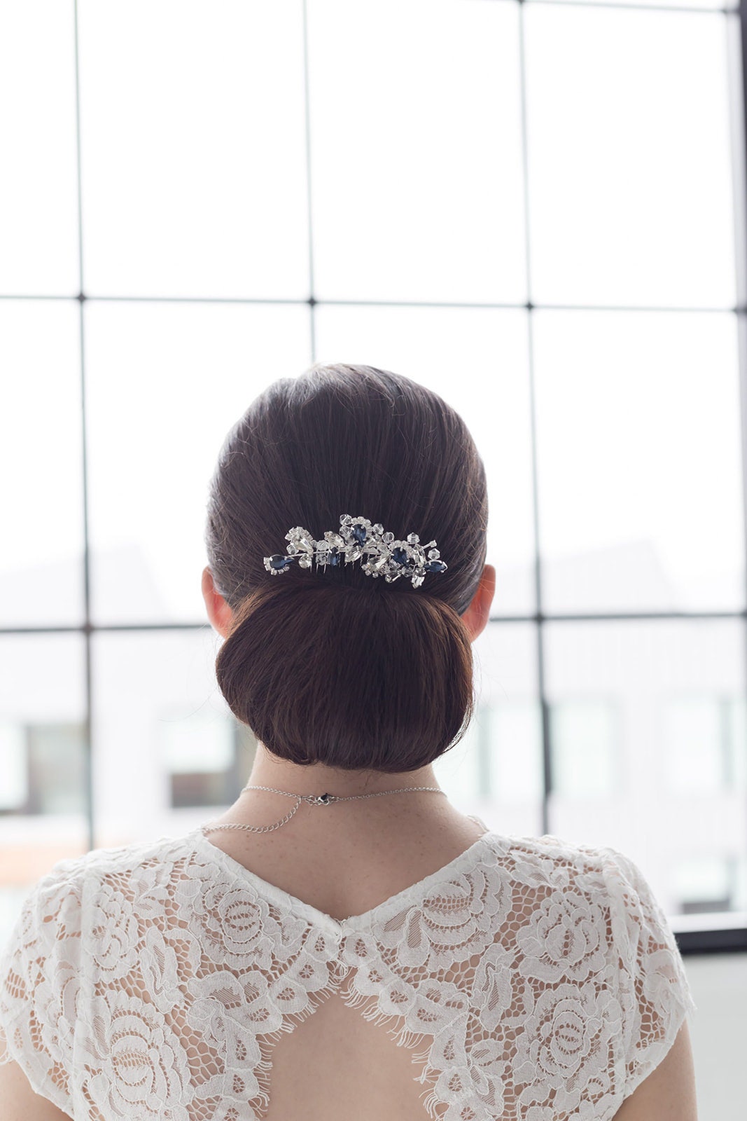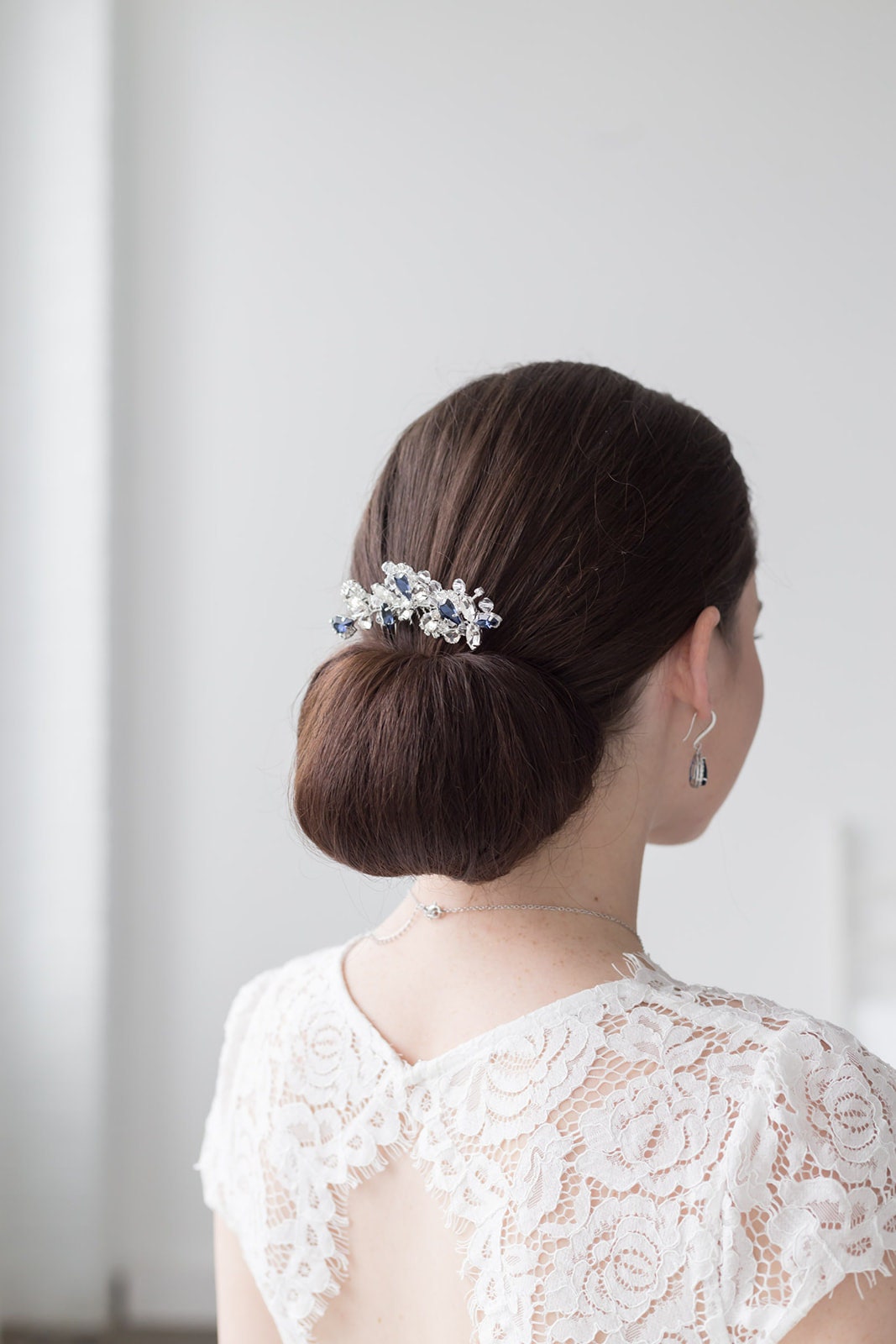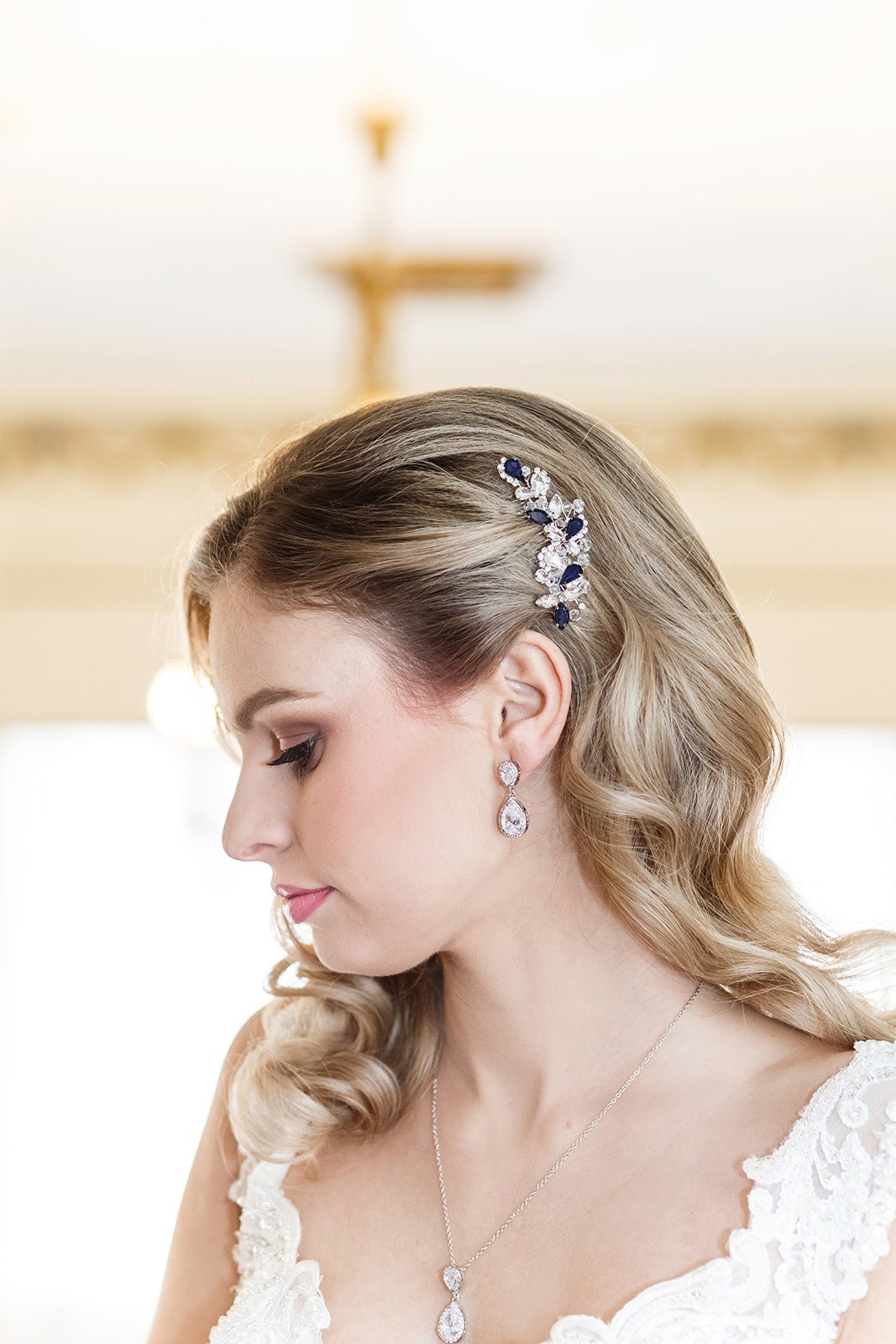 This perfectly sized wedding comb features sparkling high quality bicone diamond crystals with accents of sapphire and clear pear and marquise rhinestones that is the perfect accessory for the bride or any special occasion event. This piece is perfect as a side or back comb accessory. Measures 3" wide by 1 1/4" tall. Choose from multiple colors including silver, gold or rose gold with blue crystals.