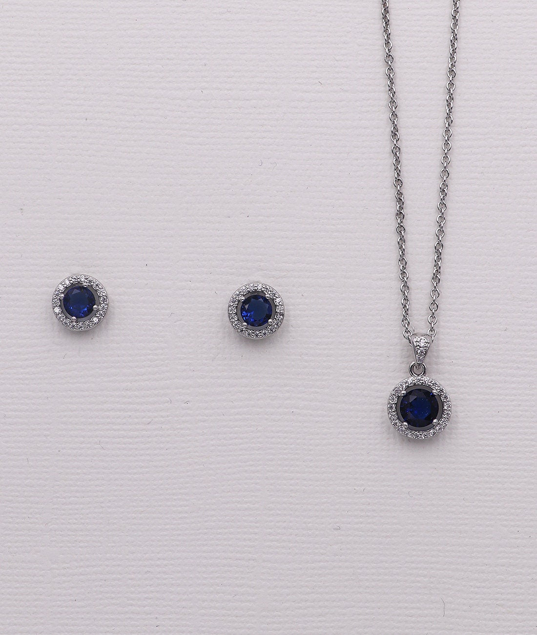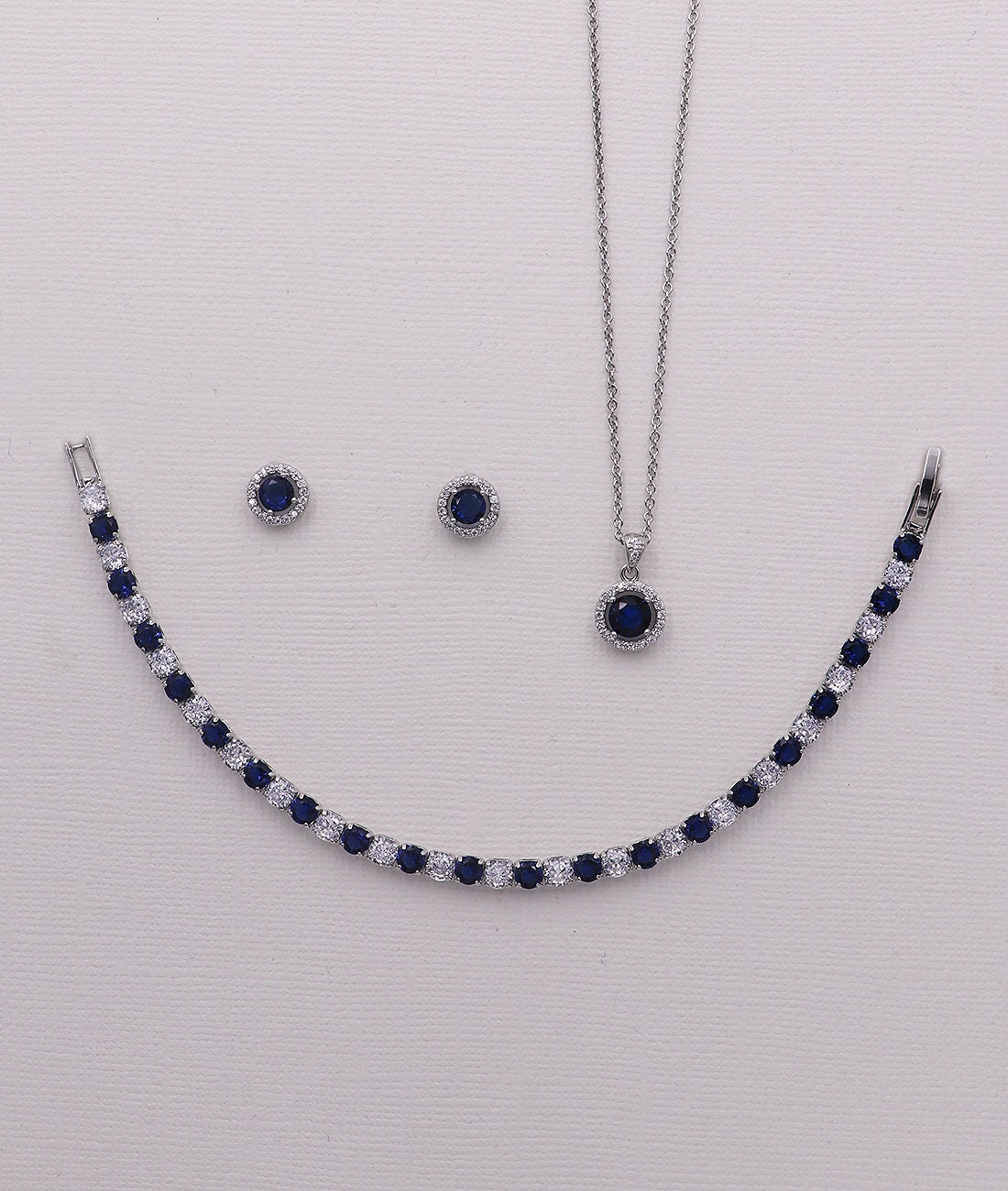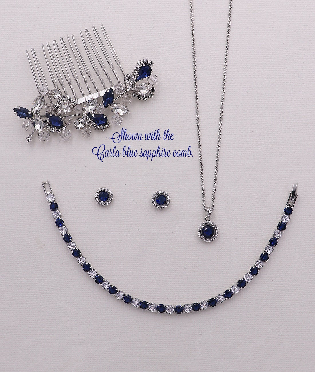 This dainty jewelry set will surely add sparkle on your special day! Boasting brilliant cubic zirconia in a framed round, classic design with a navy blue sapphire colored cz center stone. Stud earrings measure 8mm. Necklace measures 16" and has an extender to extend up to 18" long. Matching (optional) bracelet measures 7" and finishes out the look. This set is perfect for the bride, bridesmaids jewelry gift, mother of the bride, or any special occasion! Also matches our Carla sapphire blue comb (sold separately). Now available in silver, gold or rose gold.