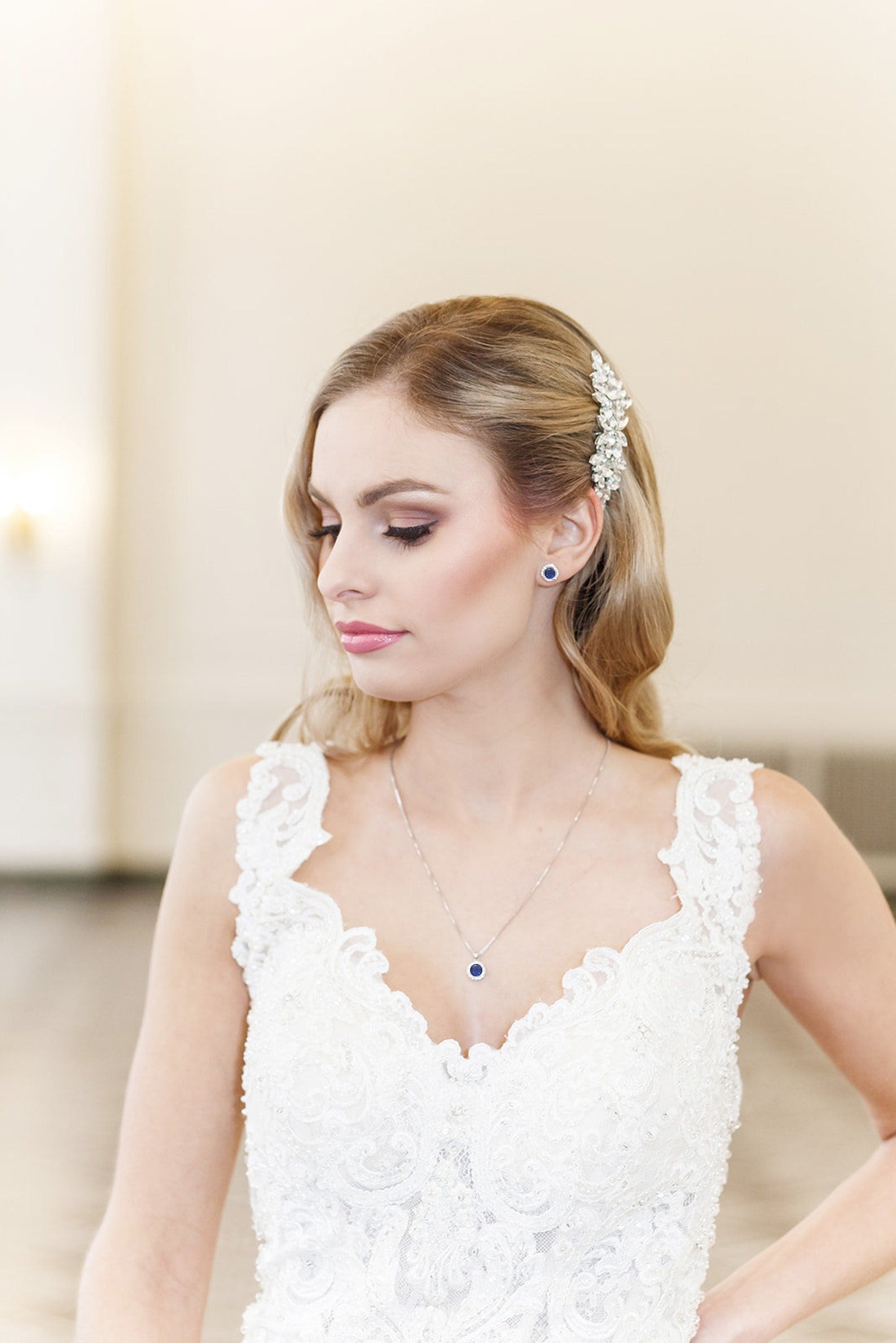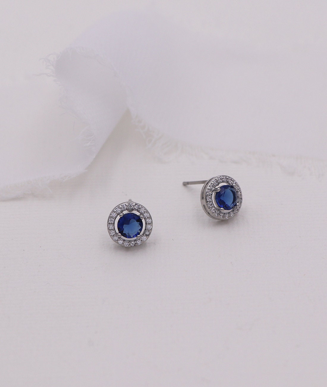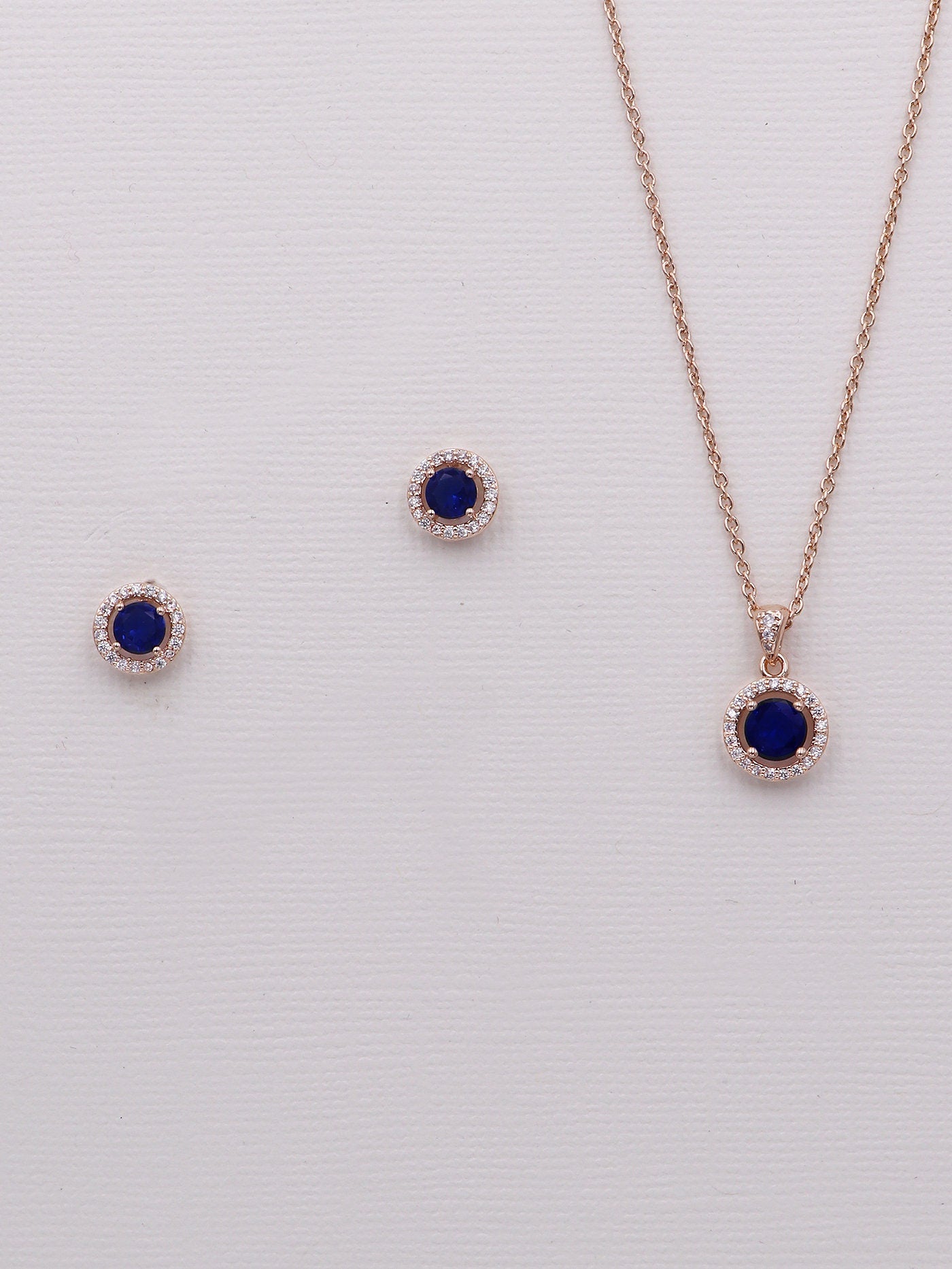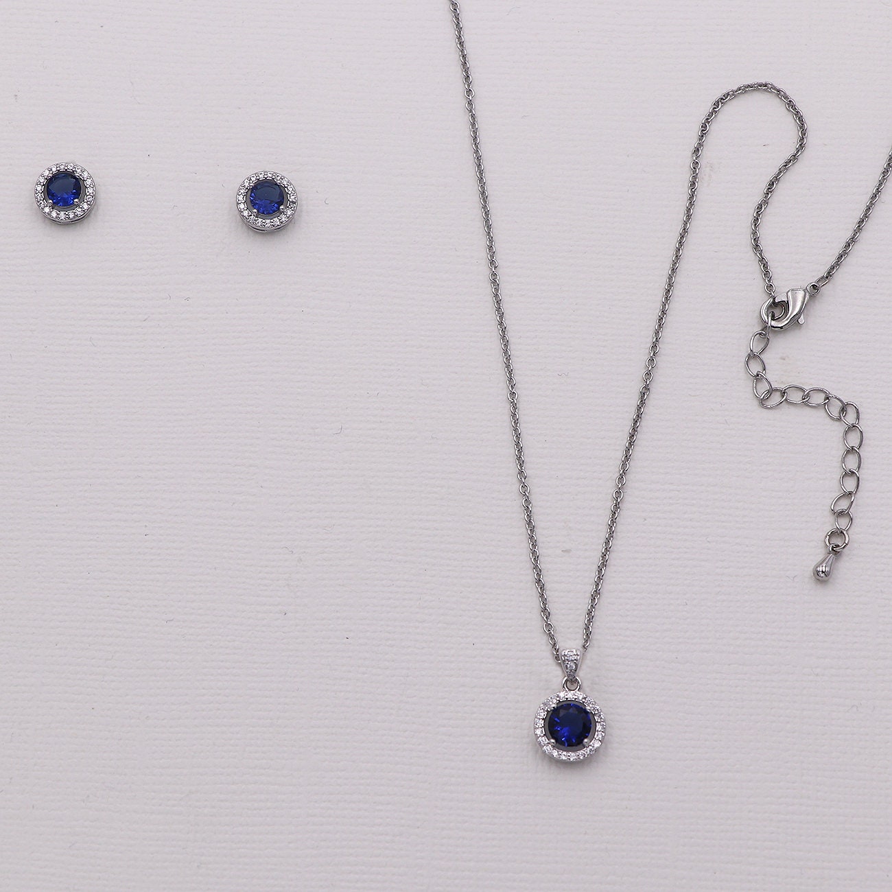 This dainty jewelry set will surely add sparkle on your special day! Boasting brilliant cubic zirconia in a framed round, classic design with a navy blue sapphire colored cz center stone. Stud earrings measure 8mm. Necklace measures 16" and has an extender to extend up to 18" long. Matching (optional) bracelet measures 7" and finishes out the look. This set is perfect for the bride, bridesmaids jewelry gift, mother of the bride, or any special occasion! Also matches our Carla sapphire blue comb (sold separately). Now available in silver, gold or rose gold.