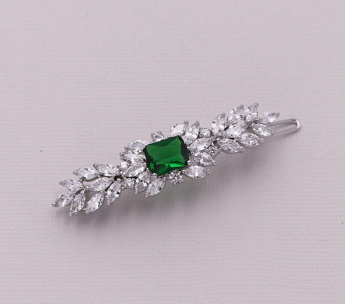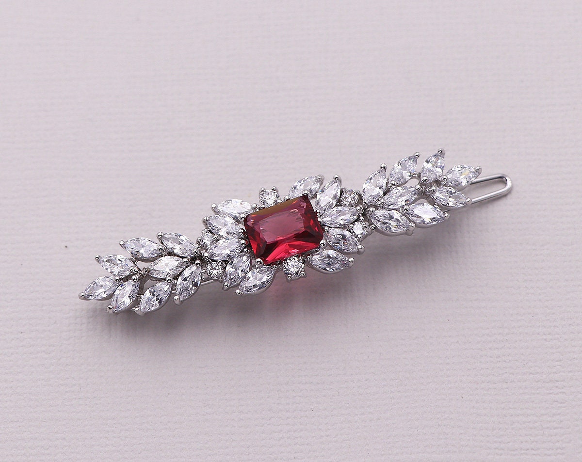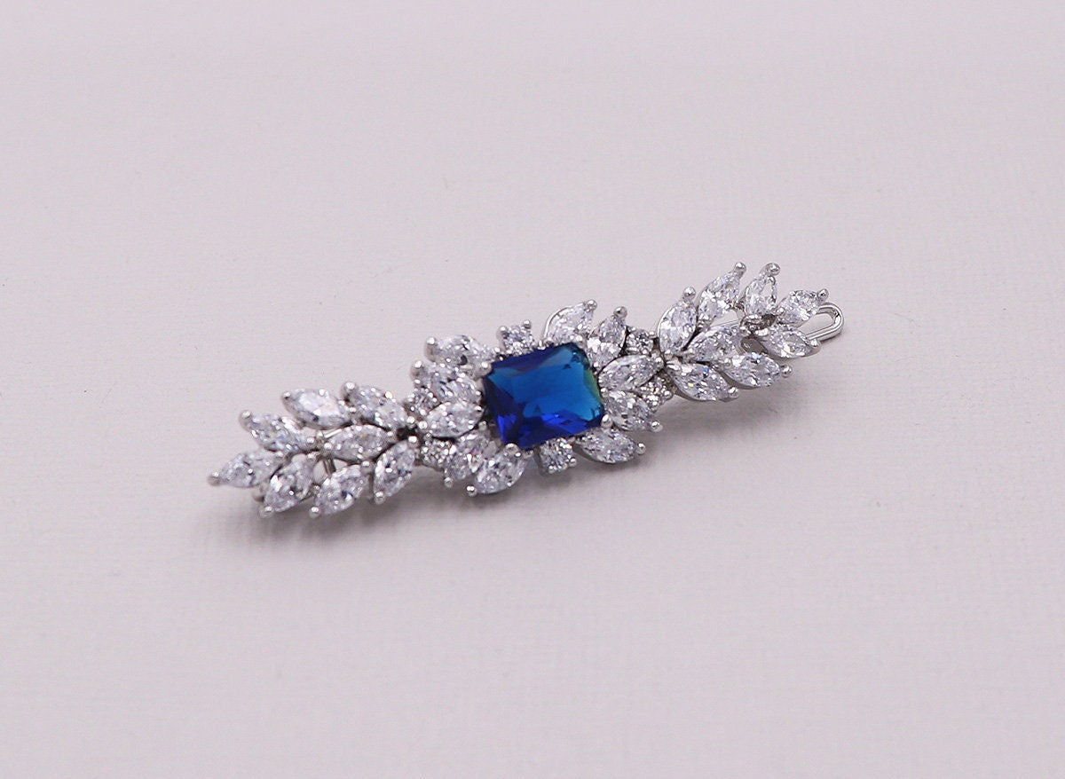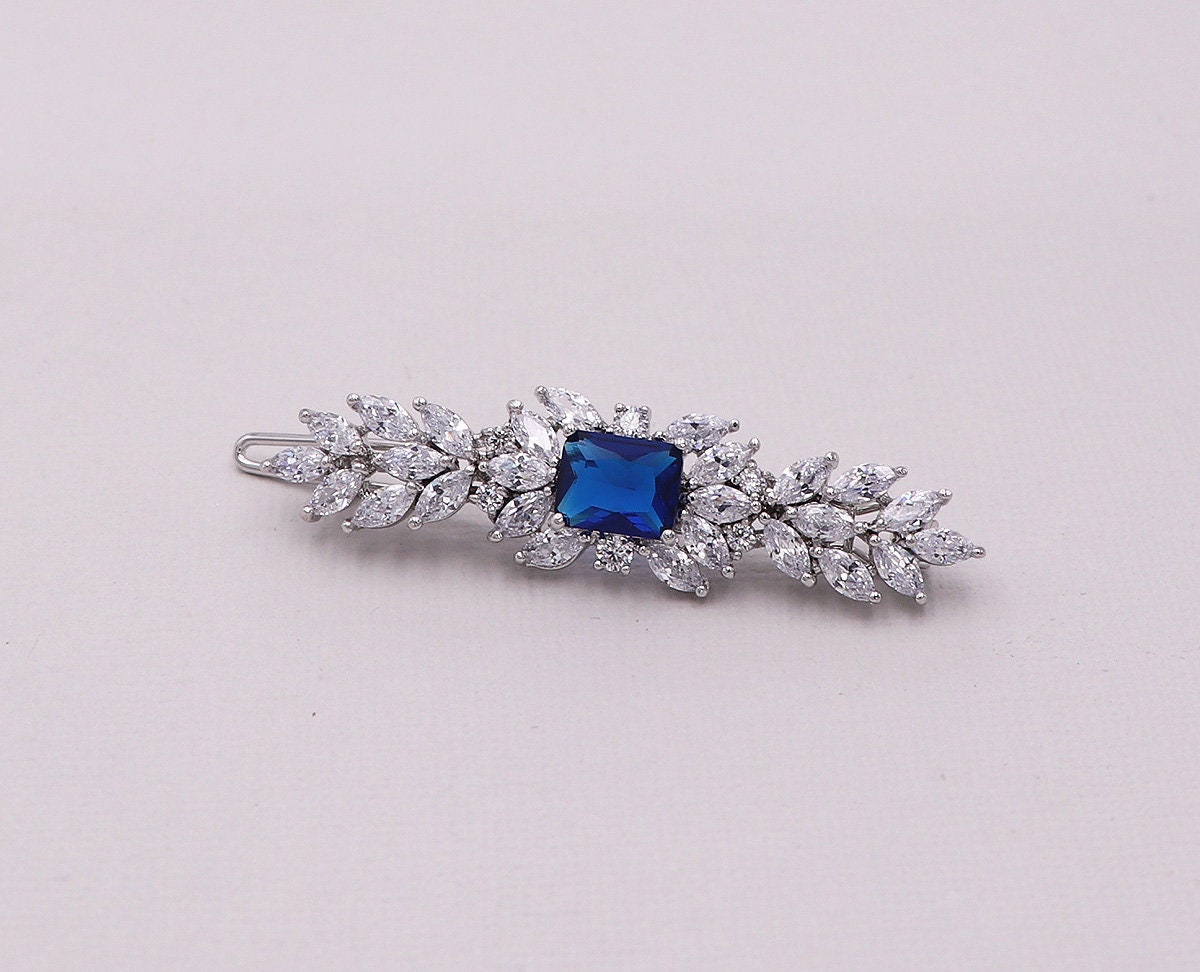 This uniquely designed barrette features sparkling marquise CZ stones with a dramatic emerald cut sapphire center. This piece is perfect as a side or back clip accessory. Measures a more petite size at 2 1/4" wide and 3/4" tall and has a clip on the back to securely place into your hair. The exquisite barrette was designed with the sparkle of rhinestones and the diamond-like brilliance of the cubic zirconia. This clip would be perfect for the bride, prom, or any special occasion! Choose from all sapphire, emerald or red. Model is wearing coordinating Evelyn jewelry set. Available in clear stones on Nina CZ barrette produce page.