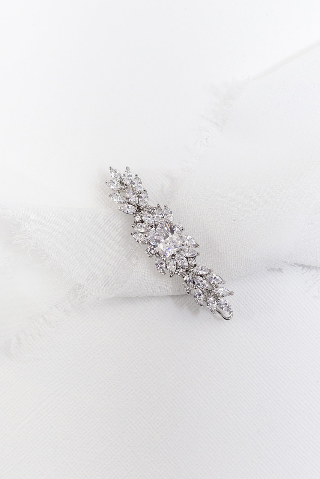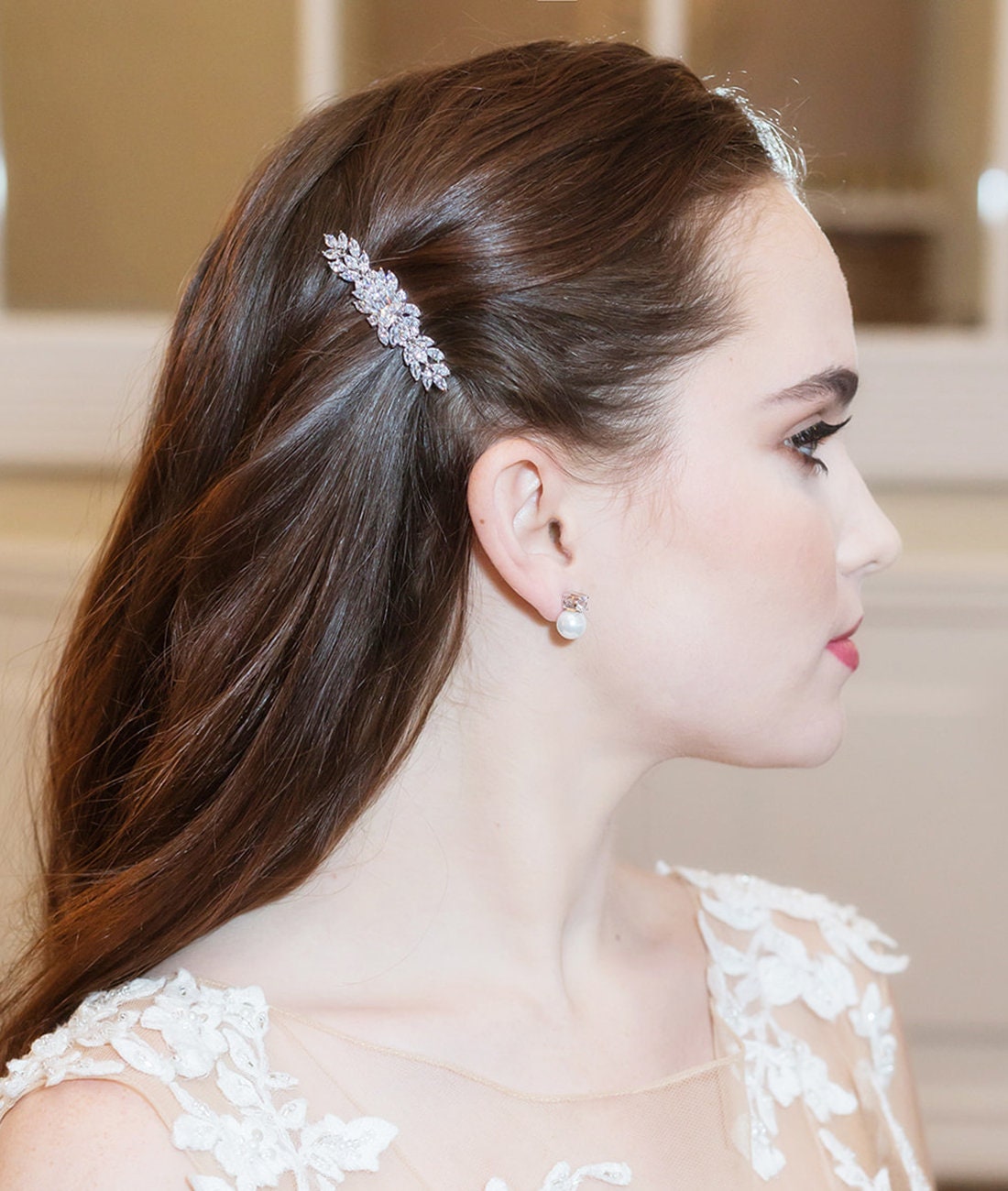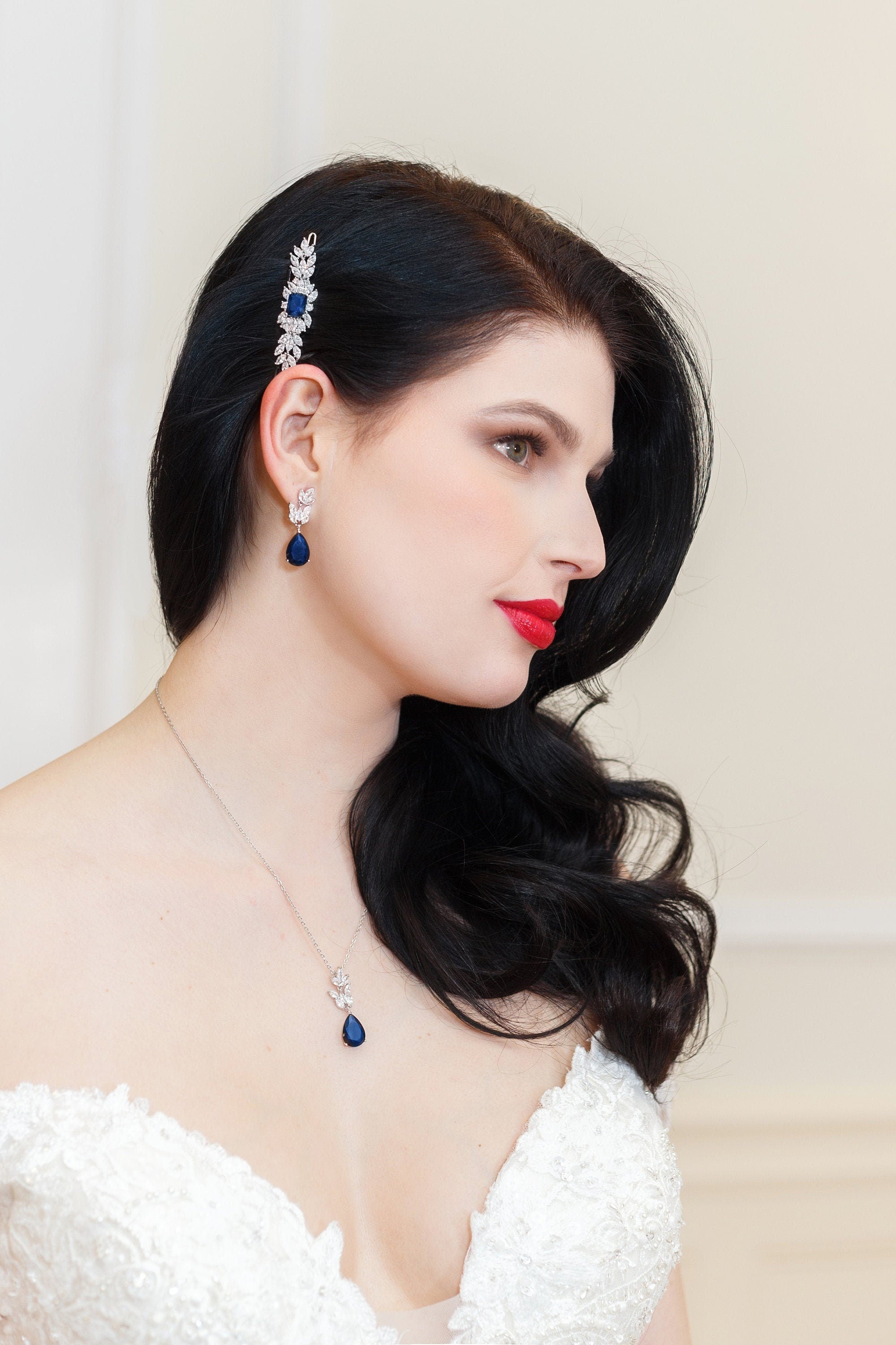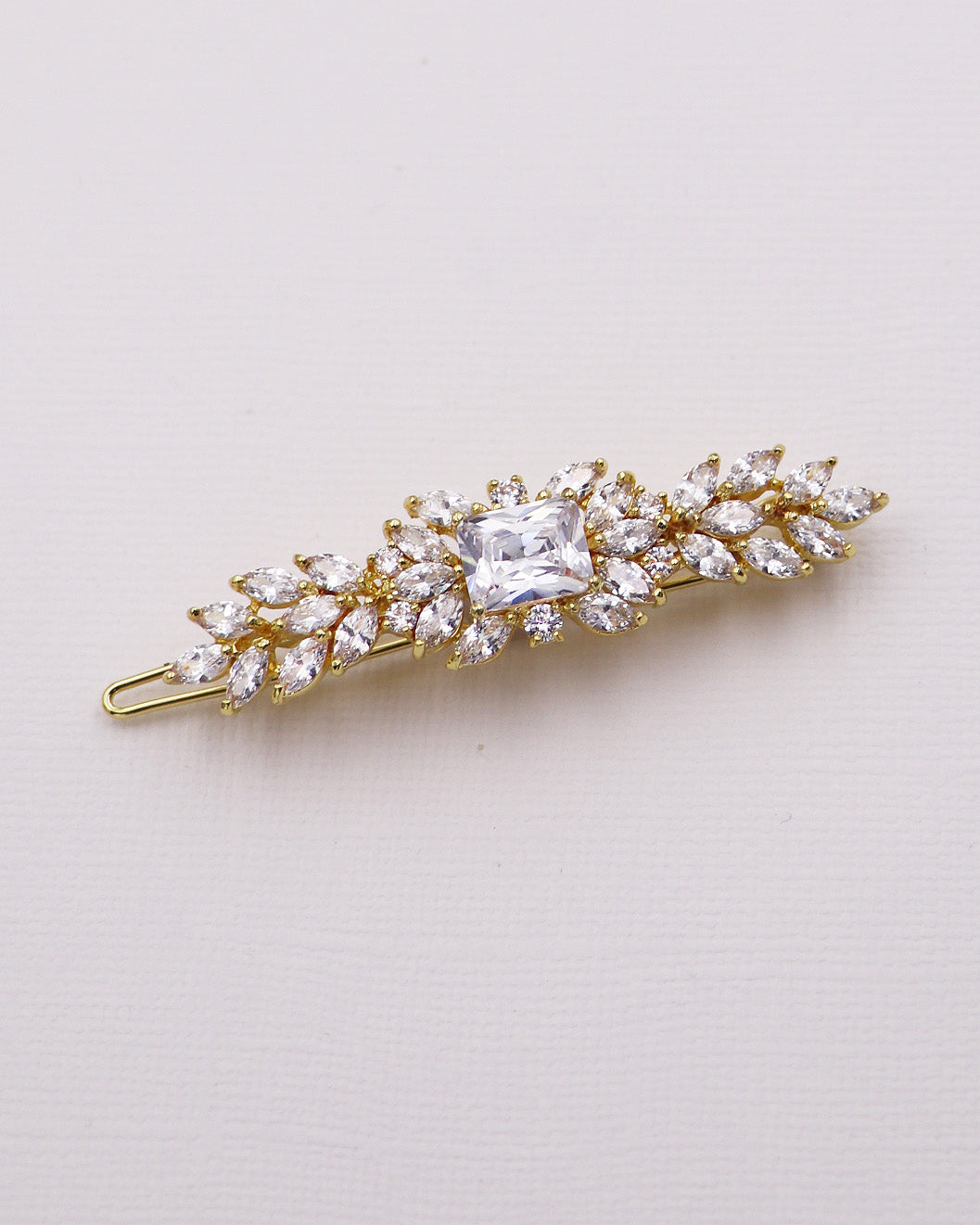 This uniquely designed barrette features sparkling marquise CZ stones with a dramatic emerald cut sapphire center. This piece is perfect as a side or back clip accessory. Measures a more petite size at 2 1/4" wide and 3/4" tall and has a clip on the back to securely place into your hair. The exquisite barrette was designed with the sparkle of rhinestones and the diamond-like brilliance of the cubic zirconia. This clip would be perfect for the bride, prom, or any special occasion! Choose from all sapphire, emerald or red. Model is wearing coordinating Evelyn jewelry set. Available in clear stones on Nina CZ barrette produce page.