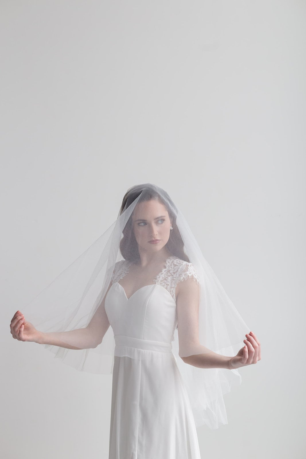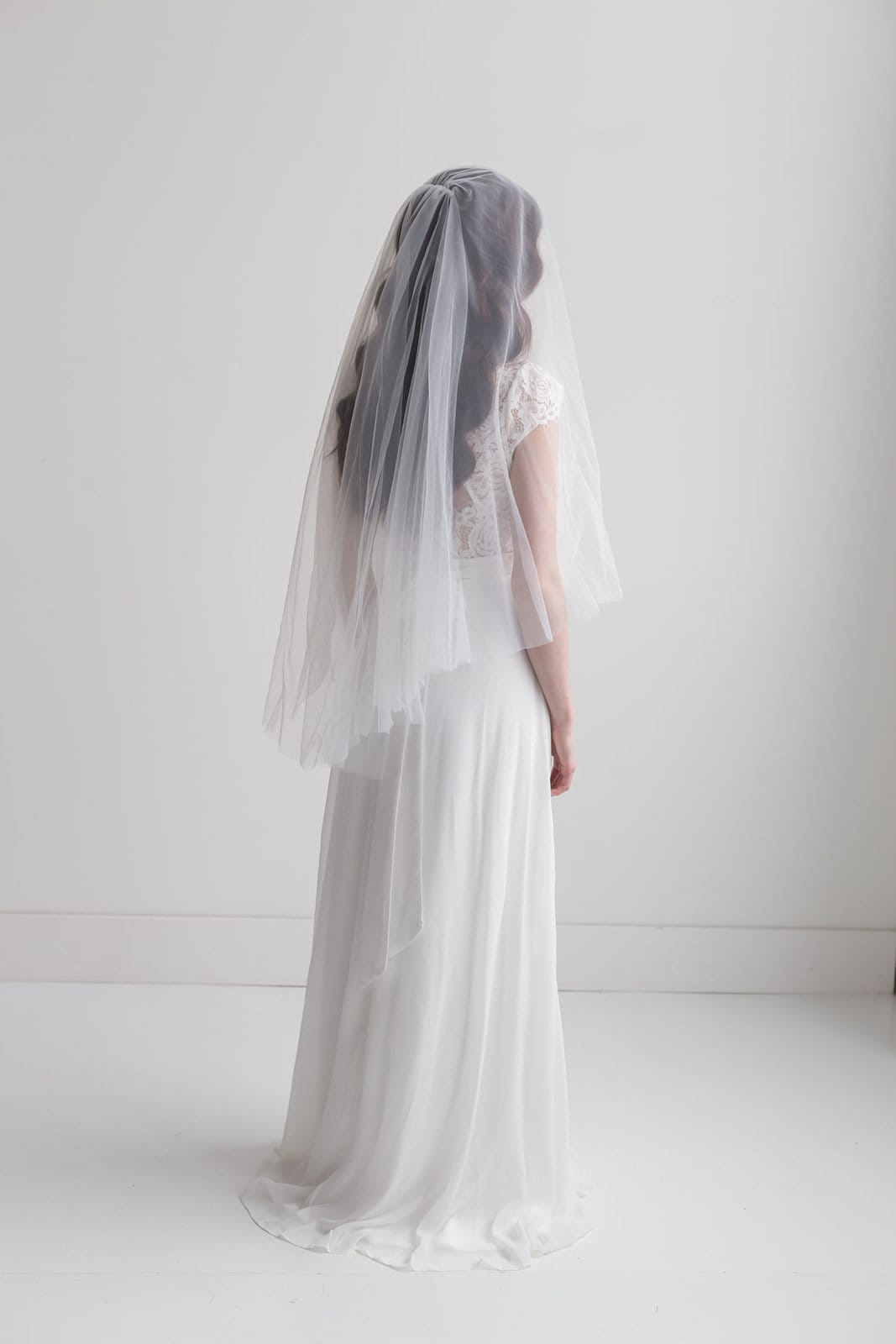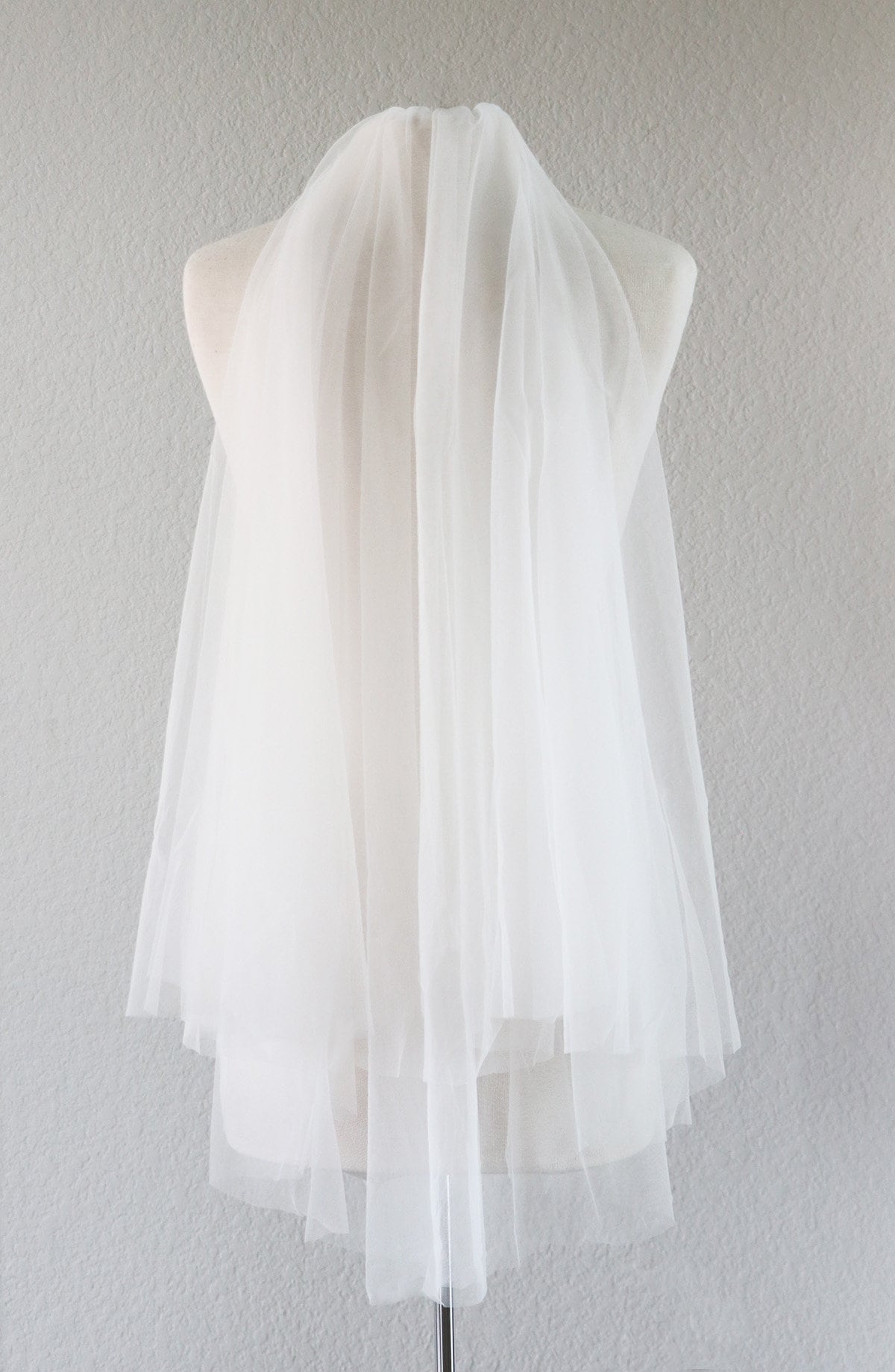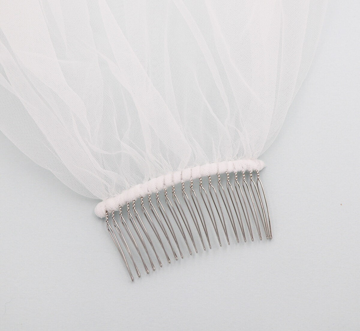 New improved, softer bridal English tulle! Add that finishing touch with this gorgeous handmade wedding veil! This veil is handcrafted to your specifications with your option of white or ivory made with a higher quality English bridal tulle, that drapes beautifully. Veil features an elegant width of 62" and features a raw, cut edge in the length of your choice. Top tier measures 30" long, second tier can be ordered in any length. Image shown in a 30/36" fingertip veil. Veil is created on a 3" metal tooth comb.