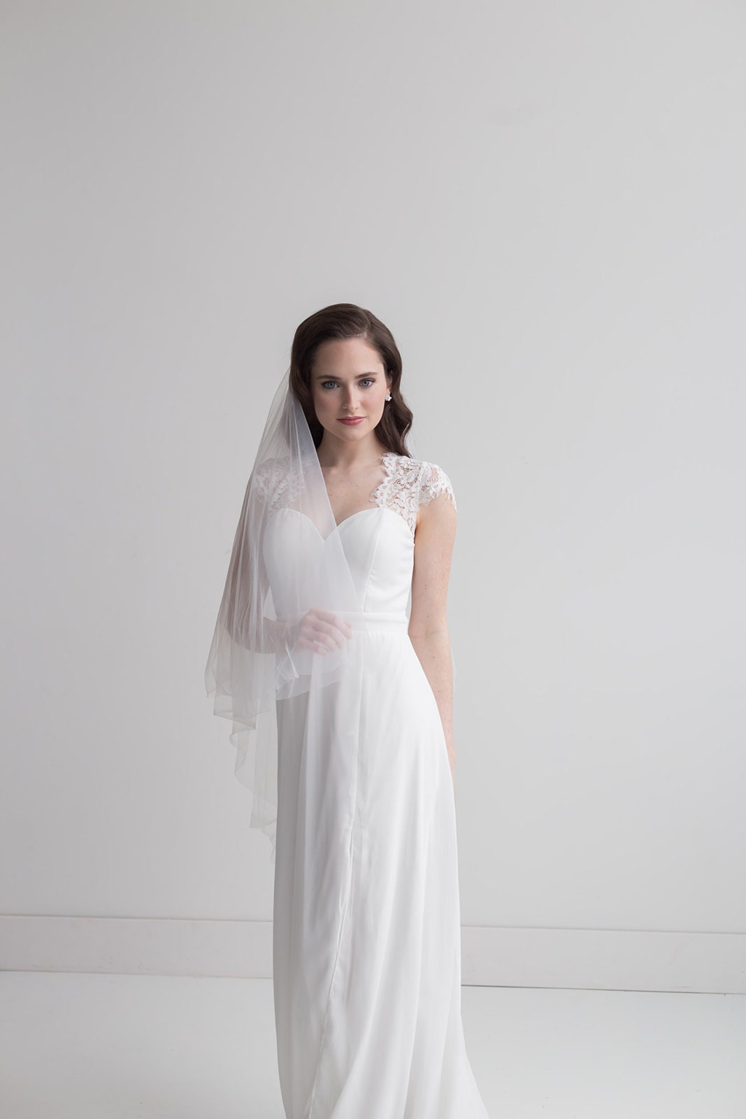 - Veil length scale: 30/36" Fingertip, 30/45" Knee, 30/72" Floor, 30/90" Chapel, 30/108" Cathedral