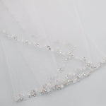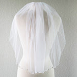 Add that extra touch of sparkle with this gorgeous handmade wedding veil! Each veil is handcrafted to your specifications with your option of white or ivory made with bridal illusion tulle. Veil features a width of 72" wide design with a beaded edge design in the length of your choice. Beading edge features Swarovski bicone crystals, flatback rhinestone and tiny silver lined bugle beads. Veil is created on a 3" metal tooth comb.