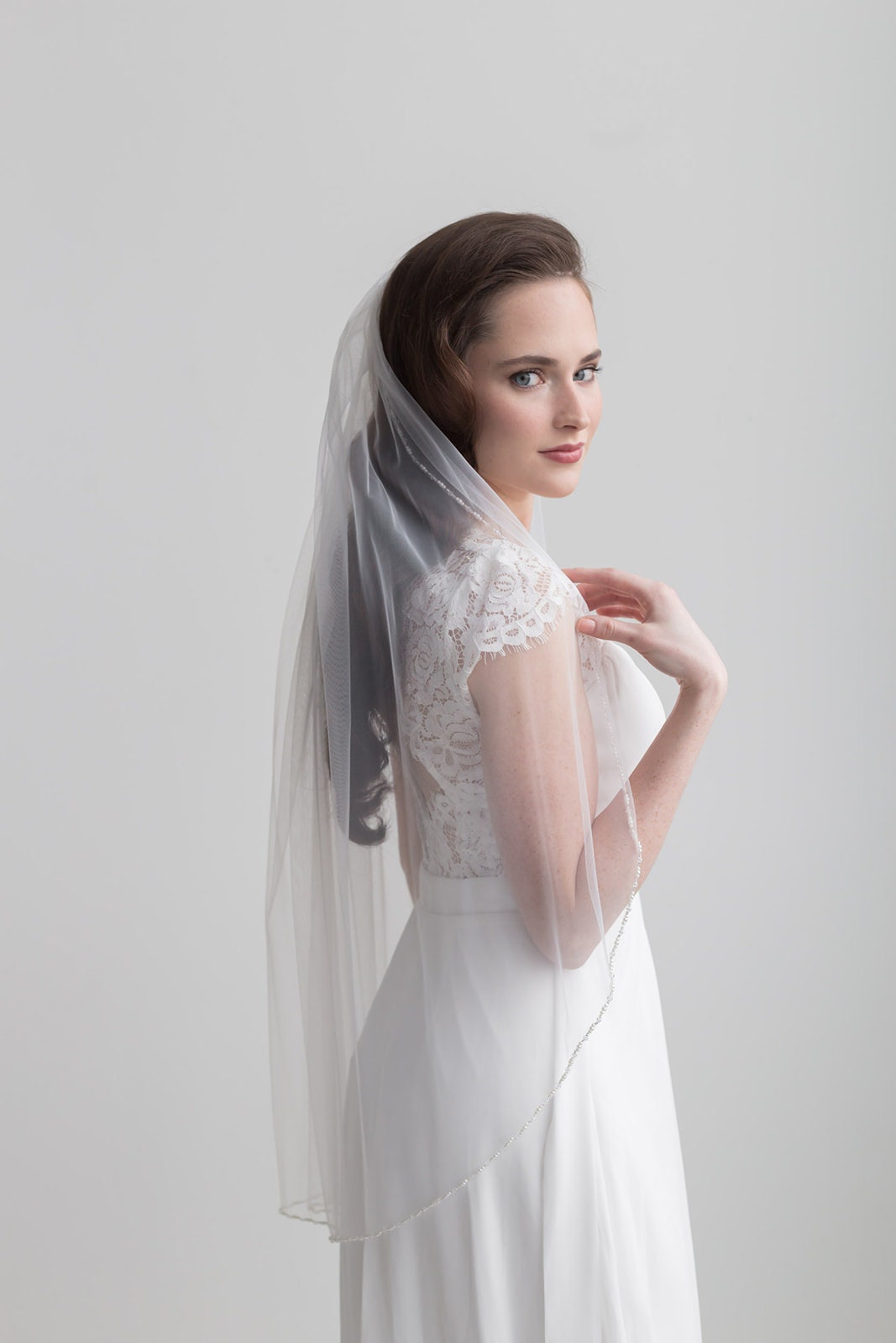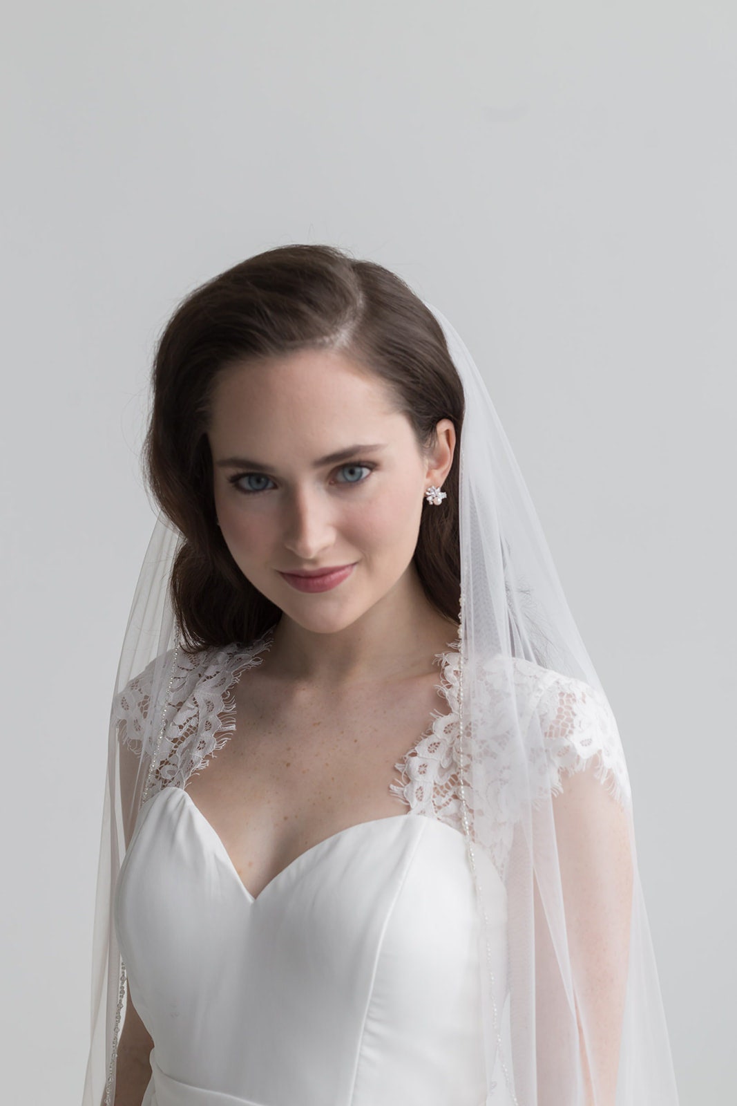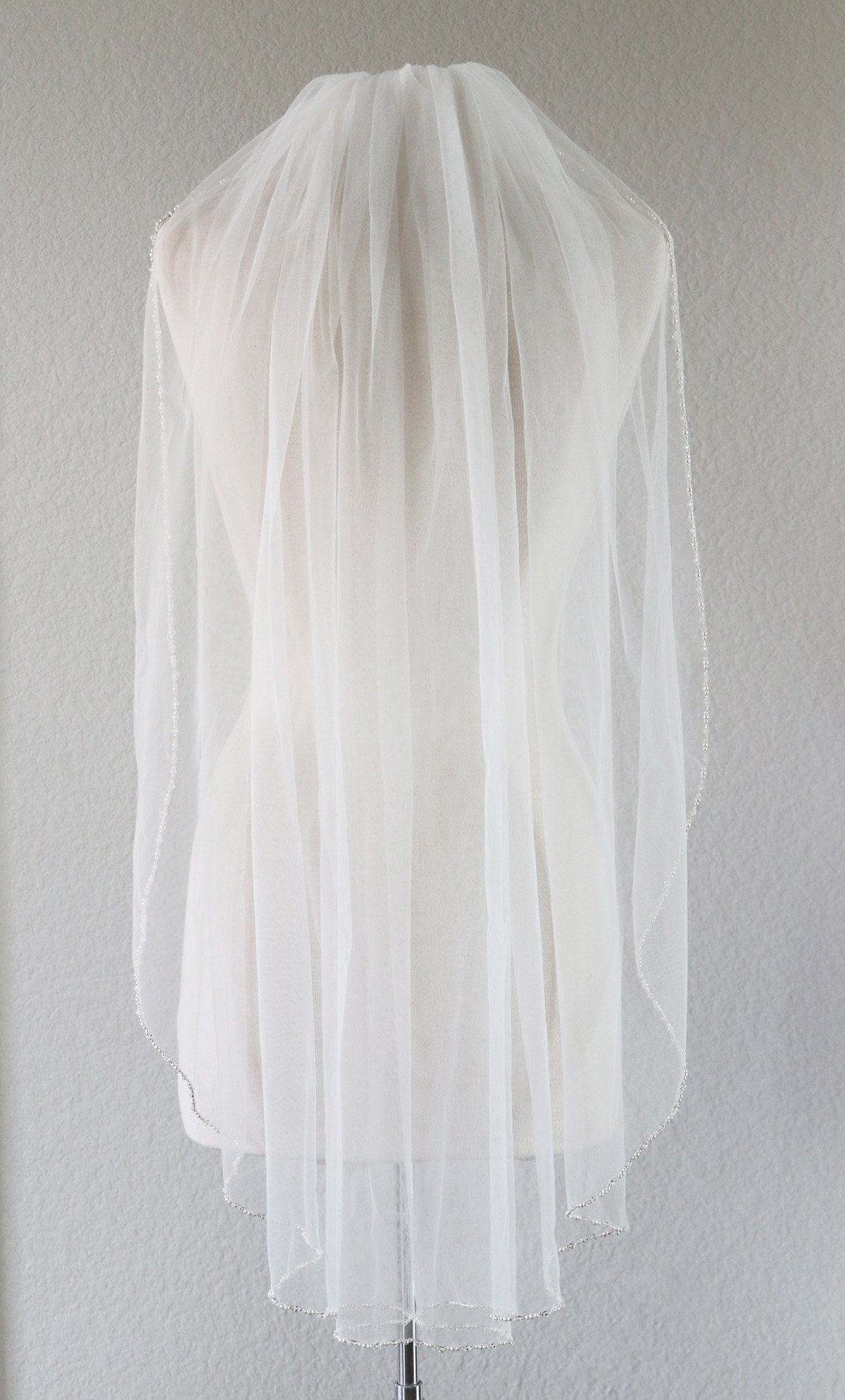 Add that extra touch elegance with this gorgeous handmade, beaded edge wedding veil! Each veil is handcrafted to your specifications with your option of pure white or pale ivory made with high quality English illusion tulle. Our tulle drapes beautifully and is very soft for a luxurious look and feel. Veil features a width of 62" and features a beaded edge of pearls, crystals and bugle beads for a sophisticated look. Veil is created on a 3" metal tooth comb.