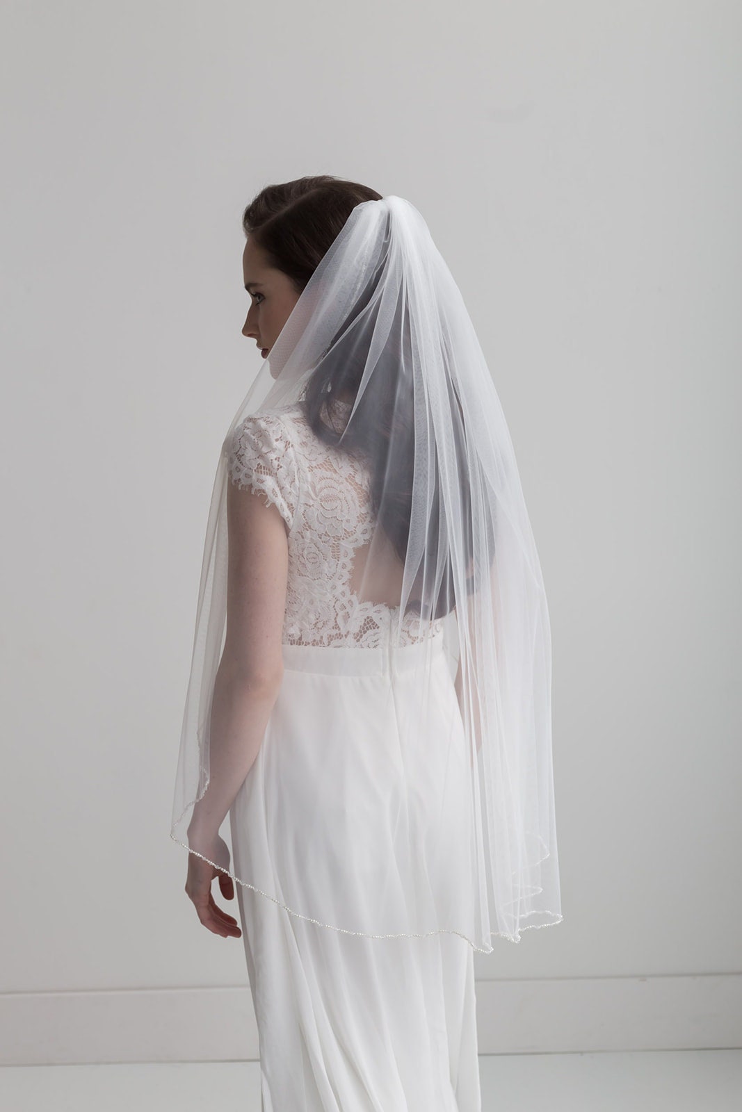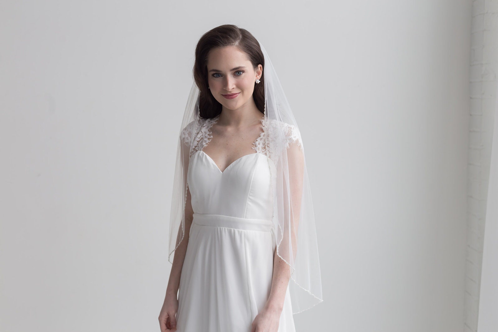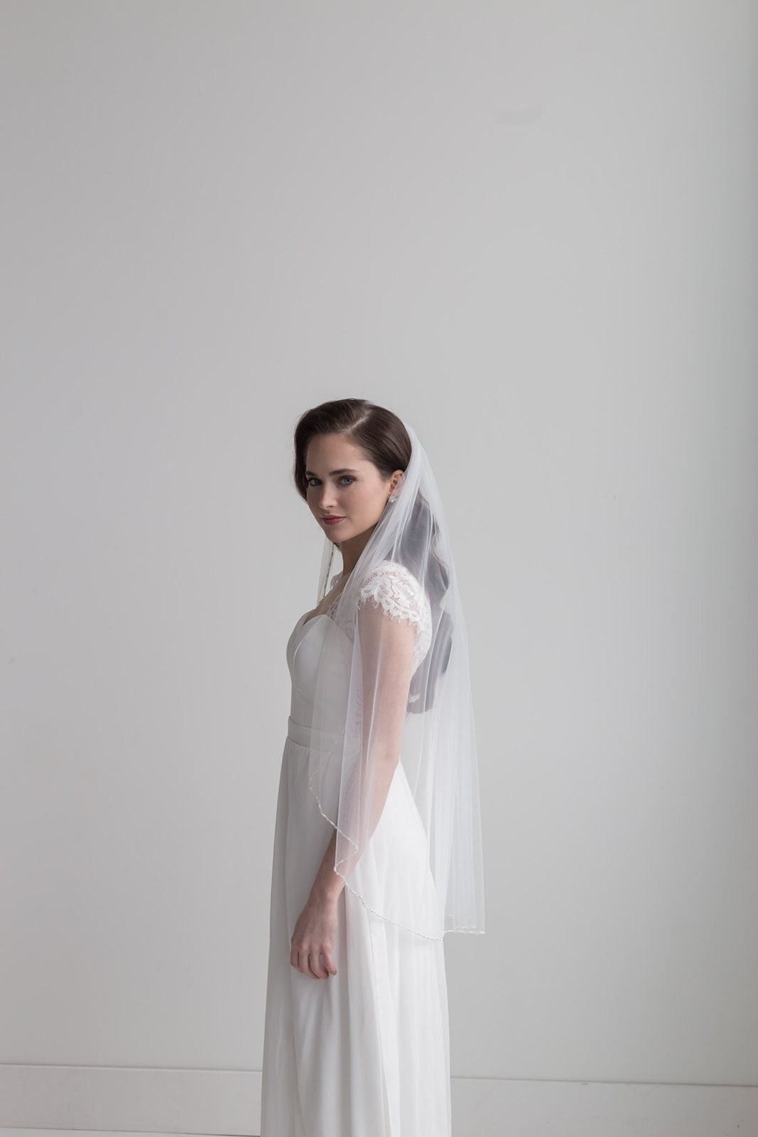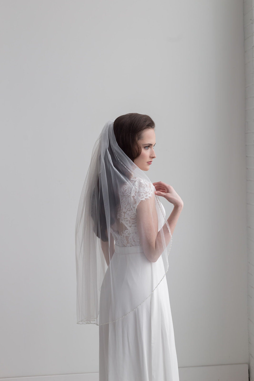 Add that extra touch elegance with this gorgeous handmade, beaded edge wedding veil! Each veil is handcrafted to your specifications with your option of pure white or pale ivory made with high quality English illusion tulle. Our tulle drapes beautifully and is very soft for a luxurious look and feel. Veil features a width of 62" and features a beaded edge of pearls, crystals and bugle beads for a sophisticated look. Veil is created on a 3" metal tooth comb.