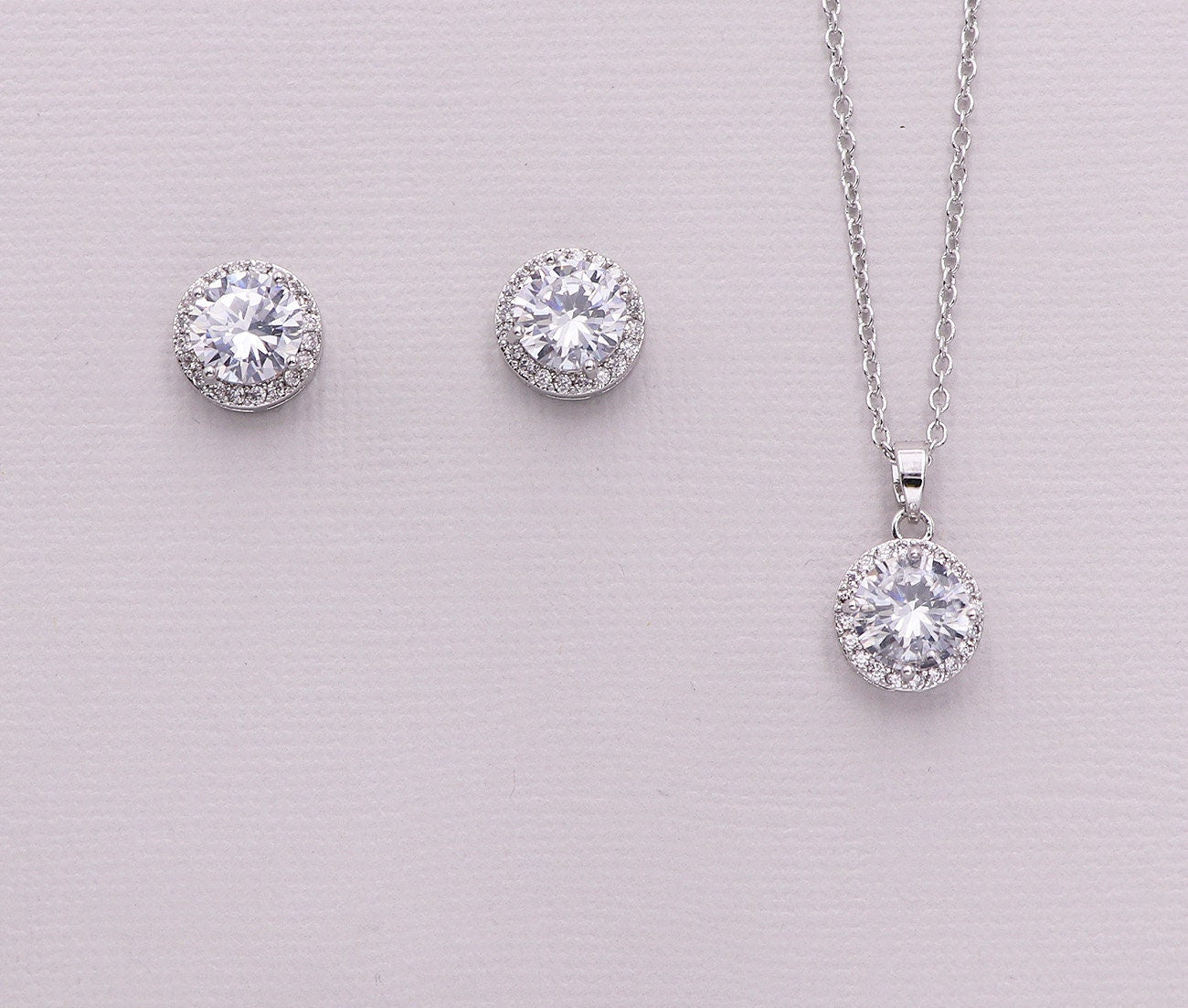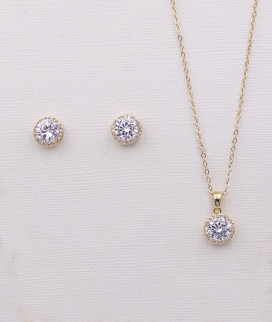This brilliant jewelry set will surely add sparkle on your special day! Boasting brilliant cubic zirconia round stones framing a classic solitaire design, this necklace measures 16" long and has an extender for additional length (up to 18"), earrings measure 1/4". Optional bracelet measures 7". This set is perfect for the bride, bridesmaids, prom or any special occasion! Choose from silver, gold or rose gold.