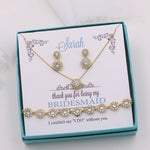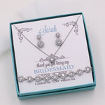 This sparkling bracelet will surely add brilliance to your special day! This earrings, necklace and bracelet set is perfectly matched with clear AAA grade prong set cubic zirconia in a framed design. Earrings measure 1/2" long (also available in clip ons upon request) and are are perfect for the bride or makes a great bridesmaid jewelry gift! Necklace measures 16"-18" (adjustable). Bracelet (optional) measures 7". Available in silver, gold or rose gold. Each set comes on a custom, personalized jewelry card featuring your choice for the name, title, font color and box color. Please put this information into the notes section in the cart when ordering.