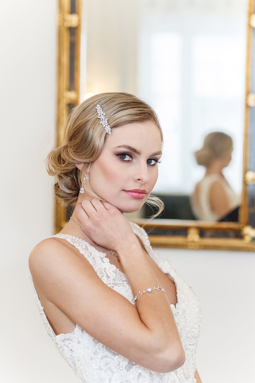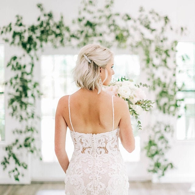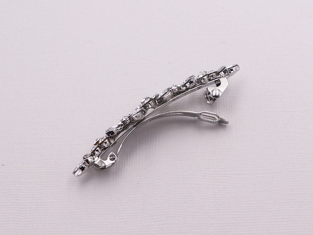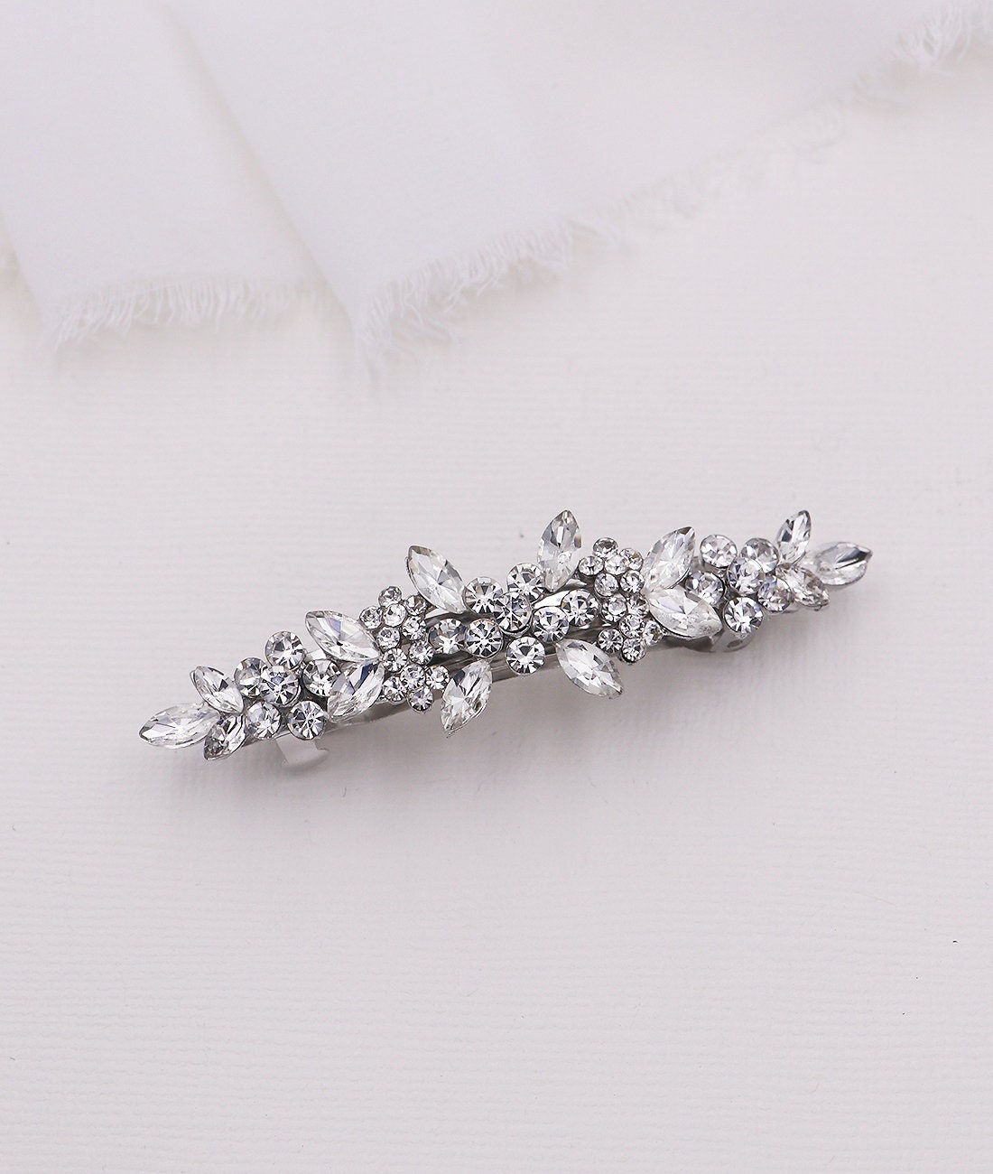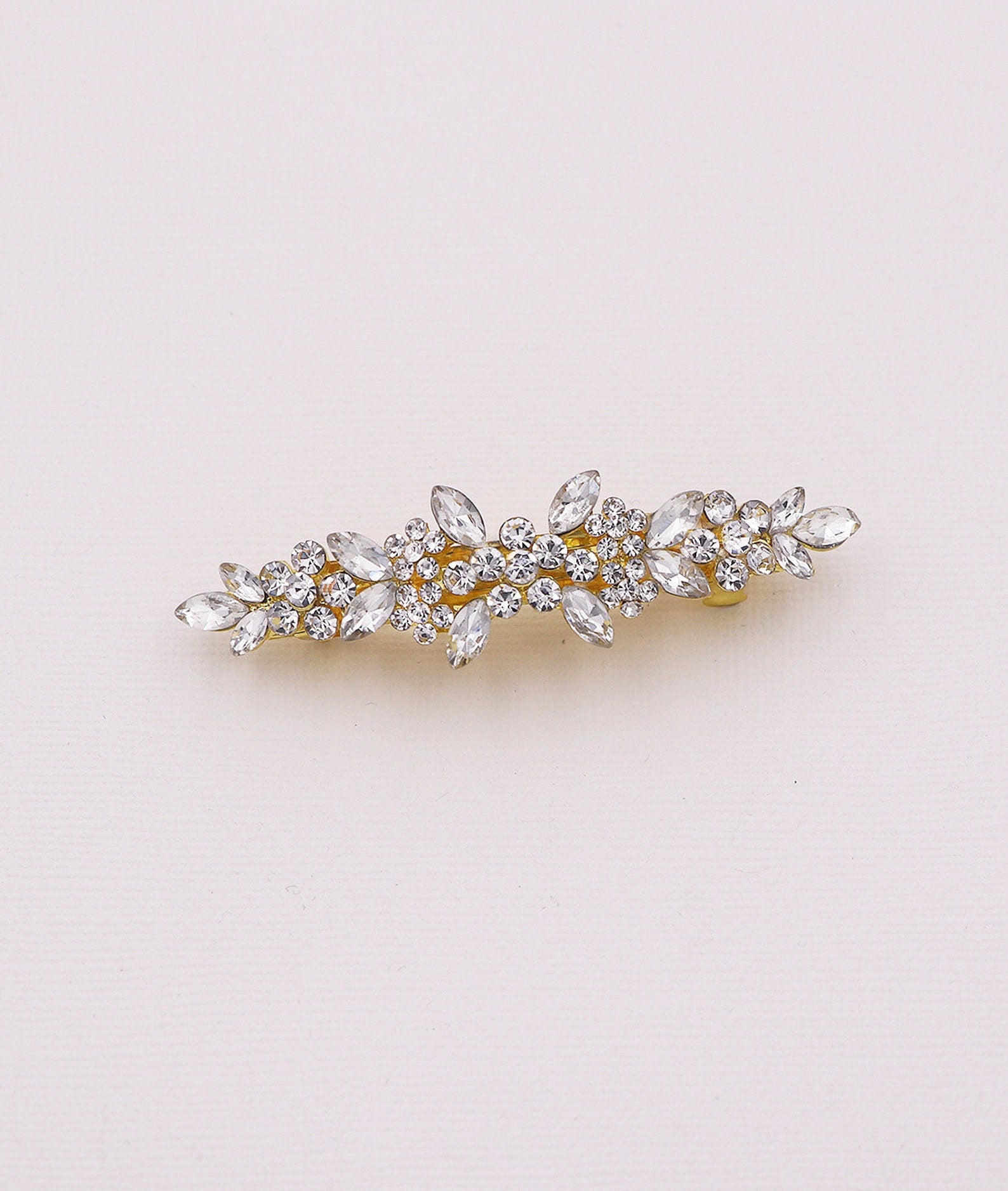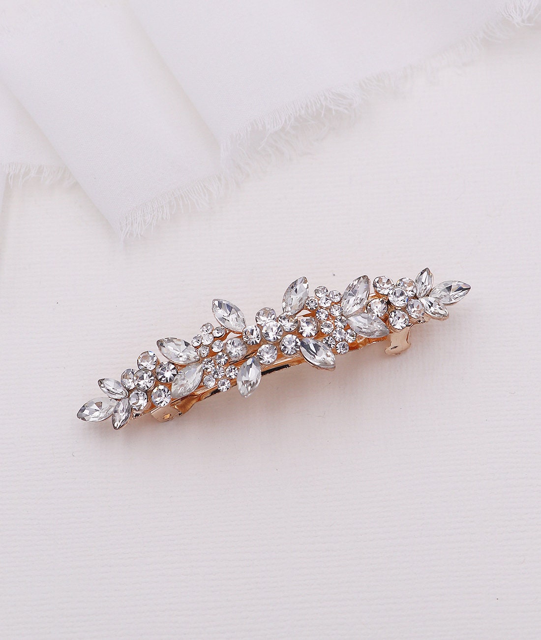 This brilliant barrette features sparkling rhinestones in a cluster pattern of round and marquise stones that is the perfect accessory for the bride or any special occasion event. This piece is perfect as a side or back clip accessory. Measures a more petite size at 3" wide and 1/2" tall and has a clip on the back to securely place into your hair. Now available in gold and rose gold!
