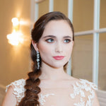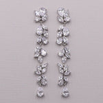 These dramatic long wedding earrings are elegantly designed with AAA grade cubic zirconia stones in shapes of pear, marquise and teardrops. Measuring Just over 3" long, these brilliant earrings are perfect for a wedding or any special occasion making a dramatic statement!