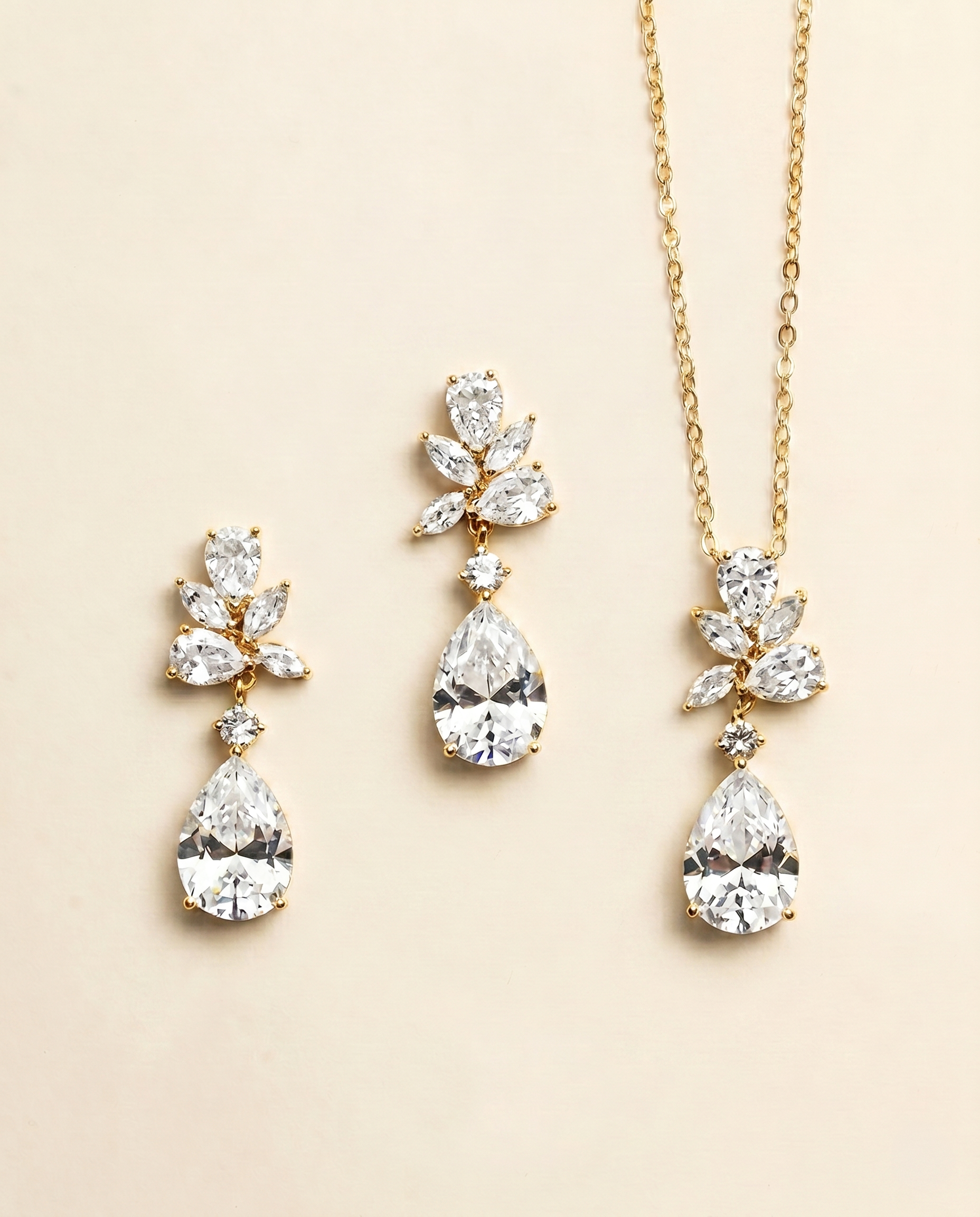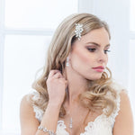 The matching pendant necklace mirrors the earrings for a polished and cohesive bridal ensemble. Lightweight yet eye-catching, the Natalia set is ideal for brides who want classic sparkle with soft botanical-inspired detail.
