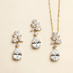 Featuring brilliant cubic zirconia stones in pear, marquise, and round cuts, this coordinated necklace and earrings set is arranged in a delicate floral cluster silhouette finished with dazzling teardrop drops. The elegant design catches the light beautifully while offering a refined, feminine look perfect for weddings and formal occasions.