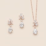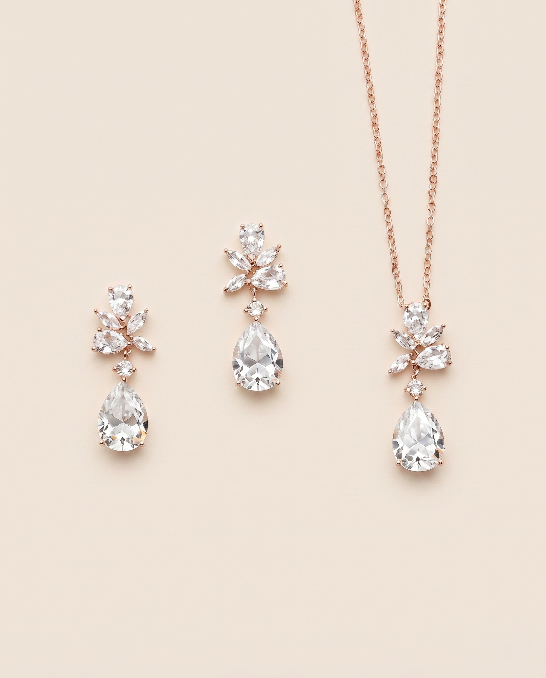 This perfectly paired rose gold earrings and necklace set features exquisitely crafted bracelet and earrings set boasts AAA grade cubic zirconia stones in multiple shapes of round, marquise and pear cuts. Earrings measure 1 1/4" is are perfect for the bride, weddings, parties, prom or any special occasion! Matching necklace measures 16" and is adjustable up to 18" long.