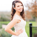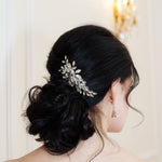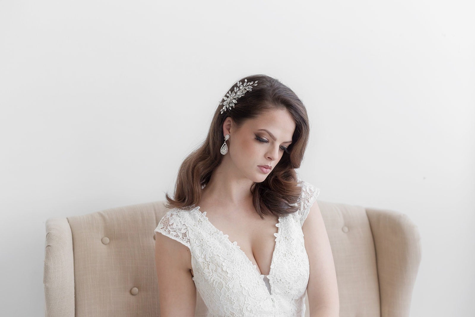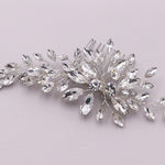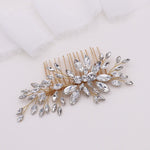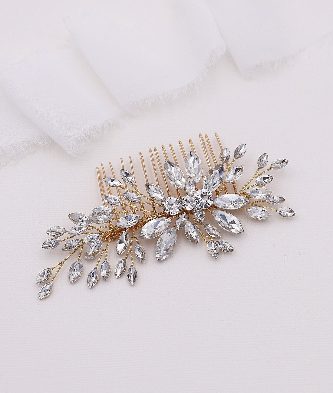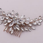 Add a touch of elegant beauty with this handmade bridal comb featuring high quality crystal rhinestones bursting with sparkle. Plated in brilliant silver, this stunning comb measures 5" wide by 2" tall (at the widest point). This comb would be perfect as a side accent or back comb wedding hair accessory. Choose from silver or rose gold finish.
